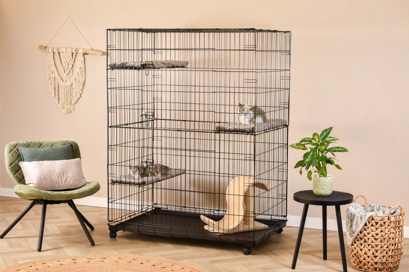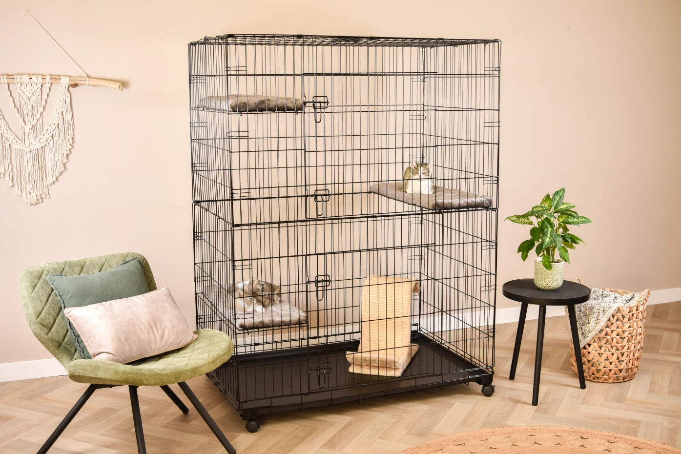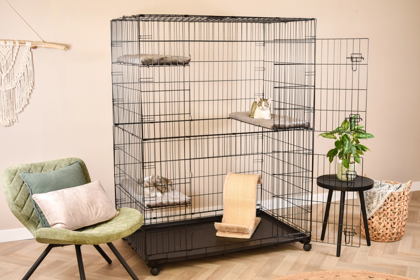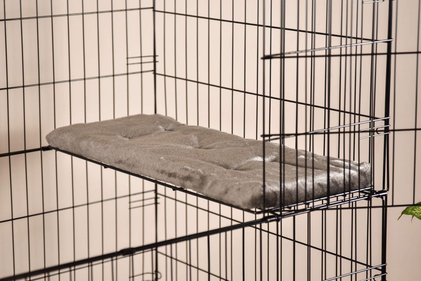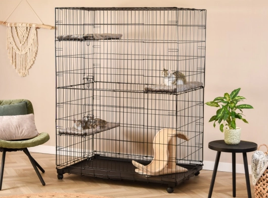 - De kattenkooi is voorzien van 3 ligplankjes in de hoeken, die eenvoudig in hoogte te verstellen zijn