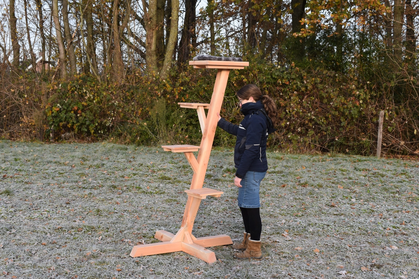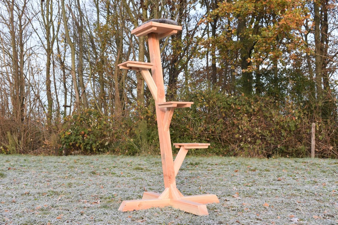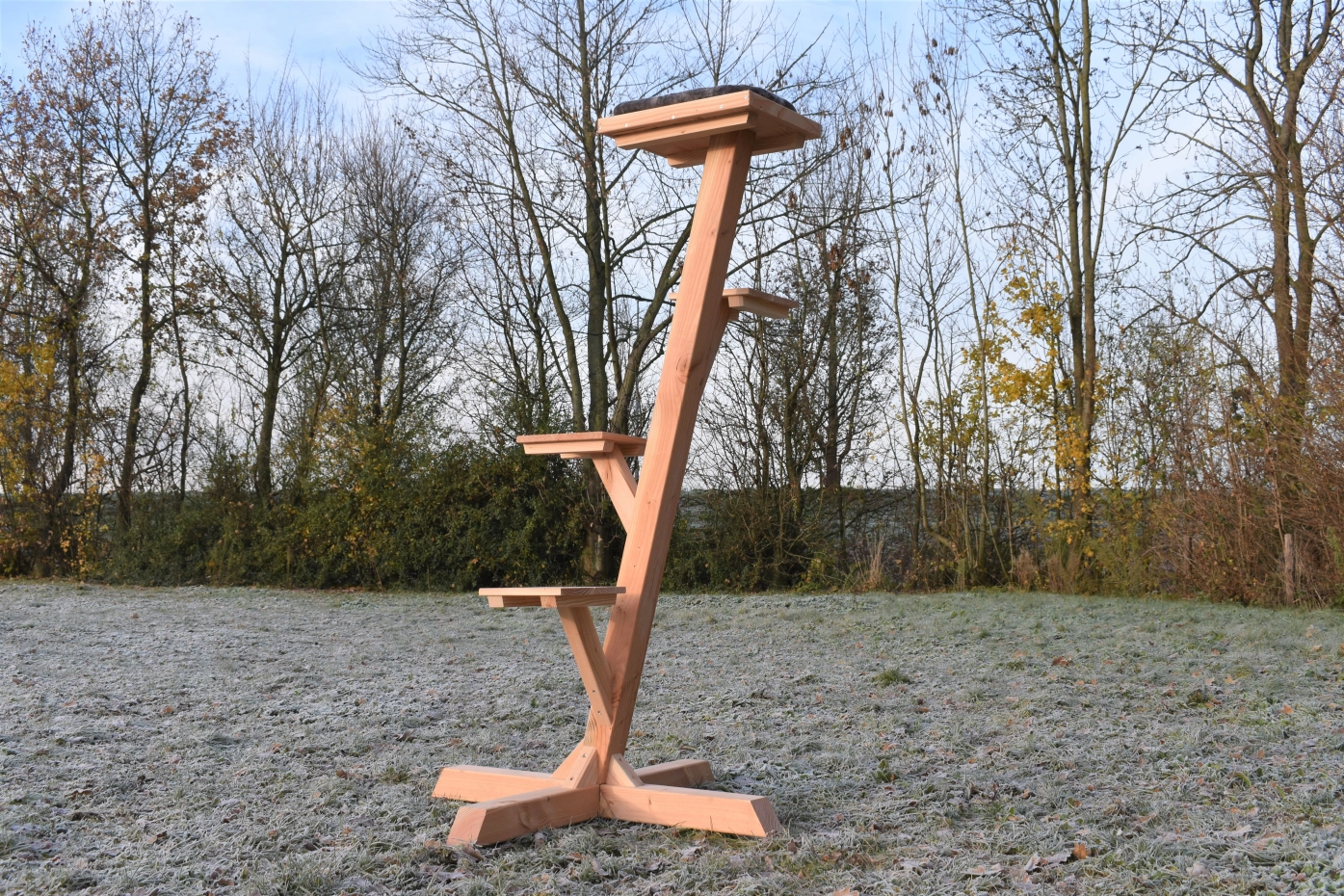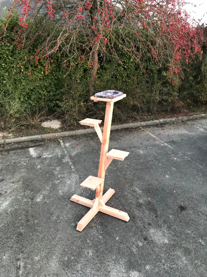 Prachtige en stevige katten klimboom. Deze klimboom is gemaakt van 9x9cm palen en staat volledig op zichzelf. Doordat de voet ook van 9x9cm balk is heeft de voet gewicht genoeg dat hij los neergezet kan worden. Deze boom is geschikt voor katten van alle categorieën. de strakke plateautjes geven een mooi design. De klimboom is gemaakt van Douglas hout en heeft een lange levensduur. Het hout zal na enige tijd vergrijzen, als u dit wilt voorkomen raden we aan het hout te beitsen/oliën. Degelijk gebouwd met een leuke uitstraling!