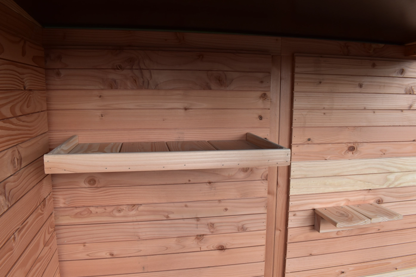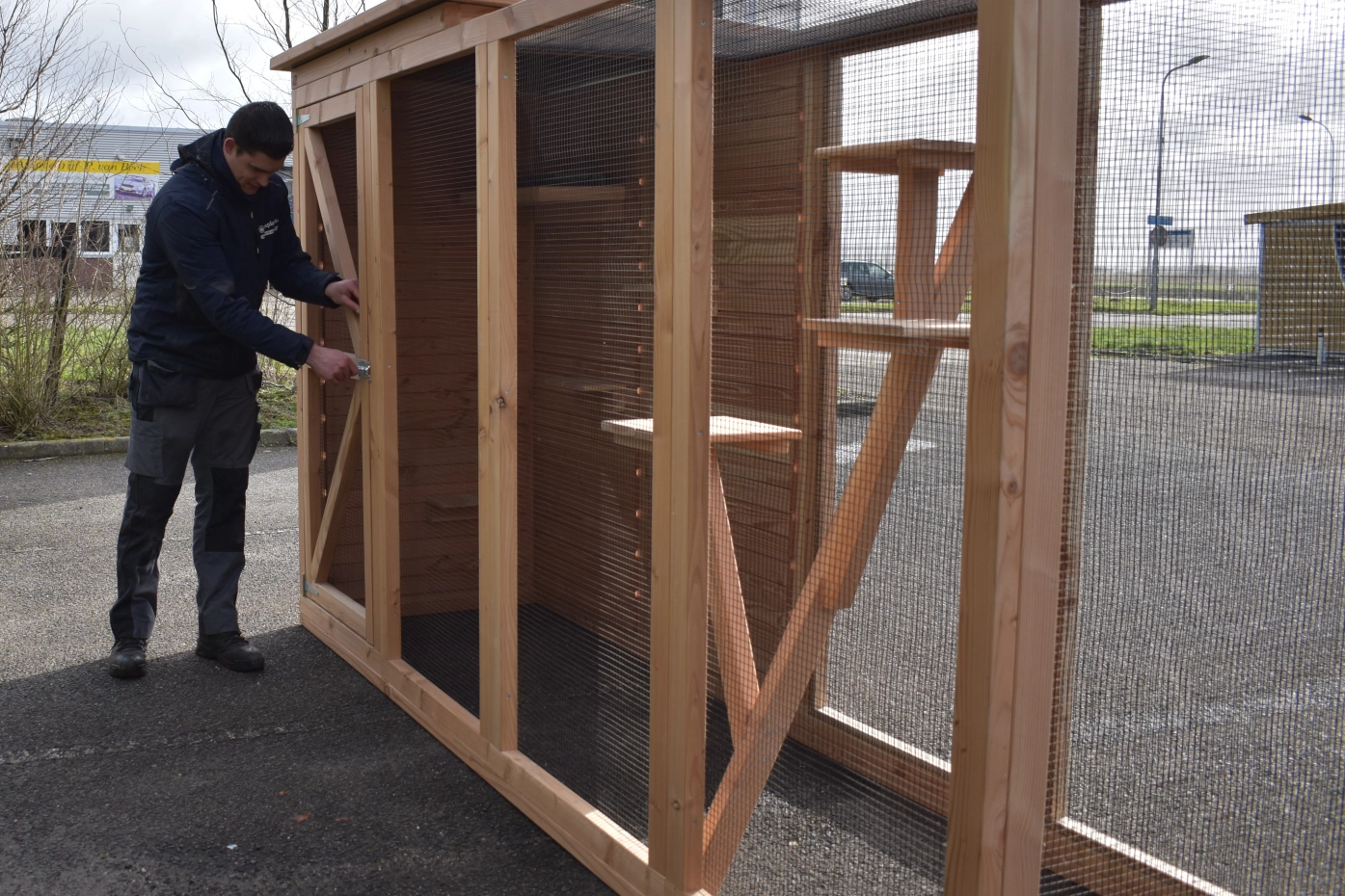 - Het hok wordt als bouwpakket geleverd met compleet voorgemonteerde wanden. Deze wanden zijn eenvoudig aan elkaar te schroeven. Boortje, schroeven en bitjes worden meegeleverd.