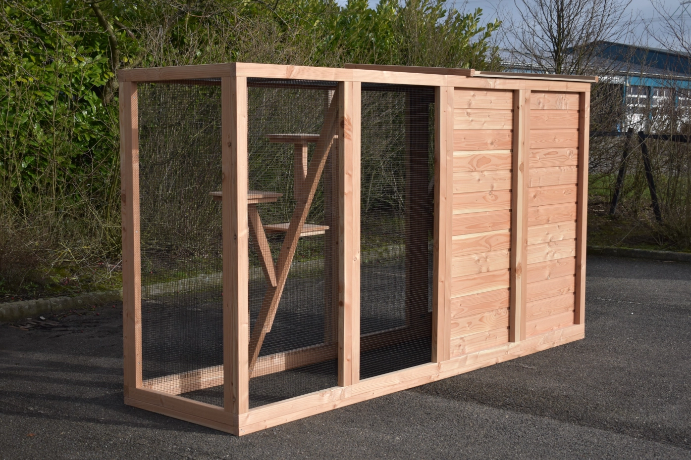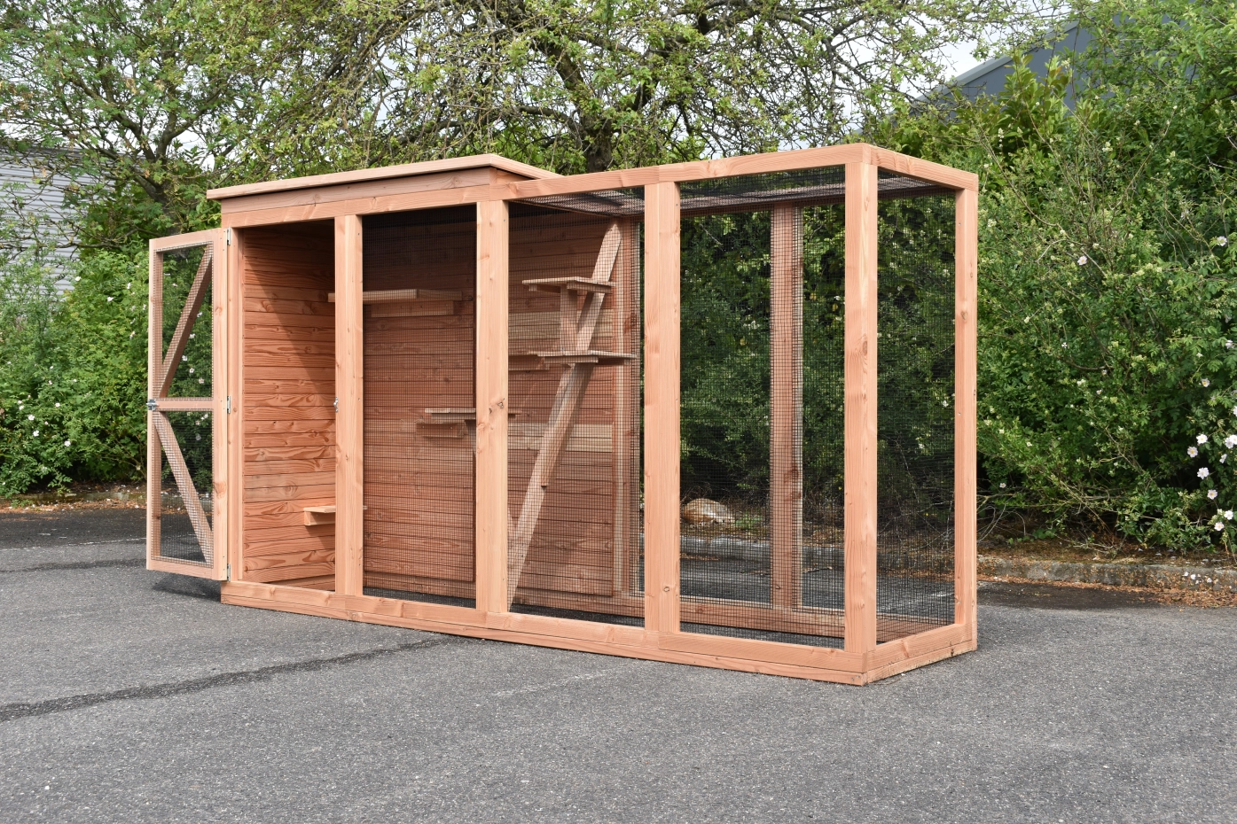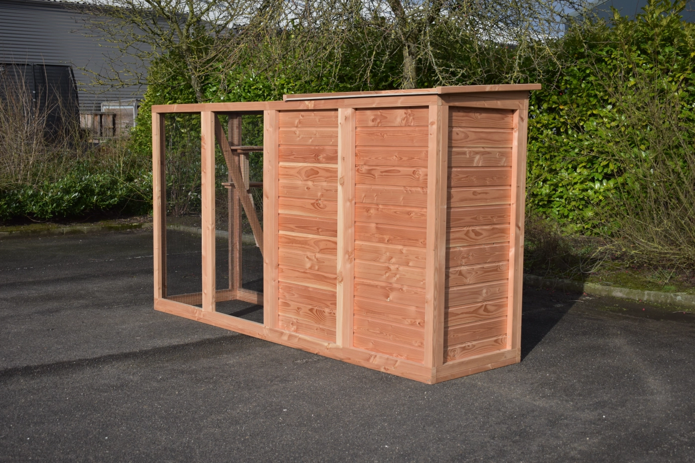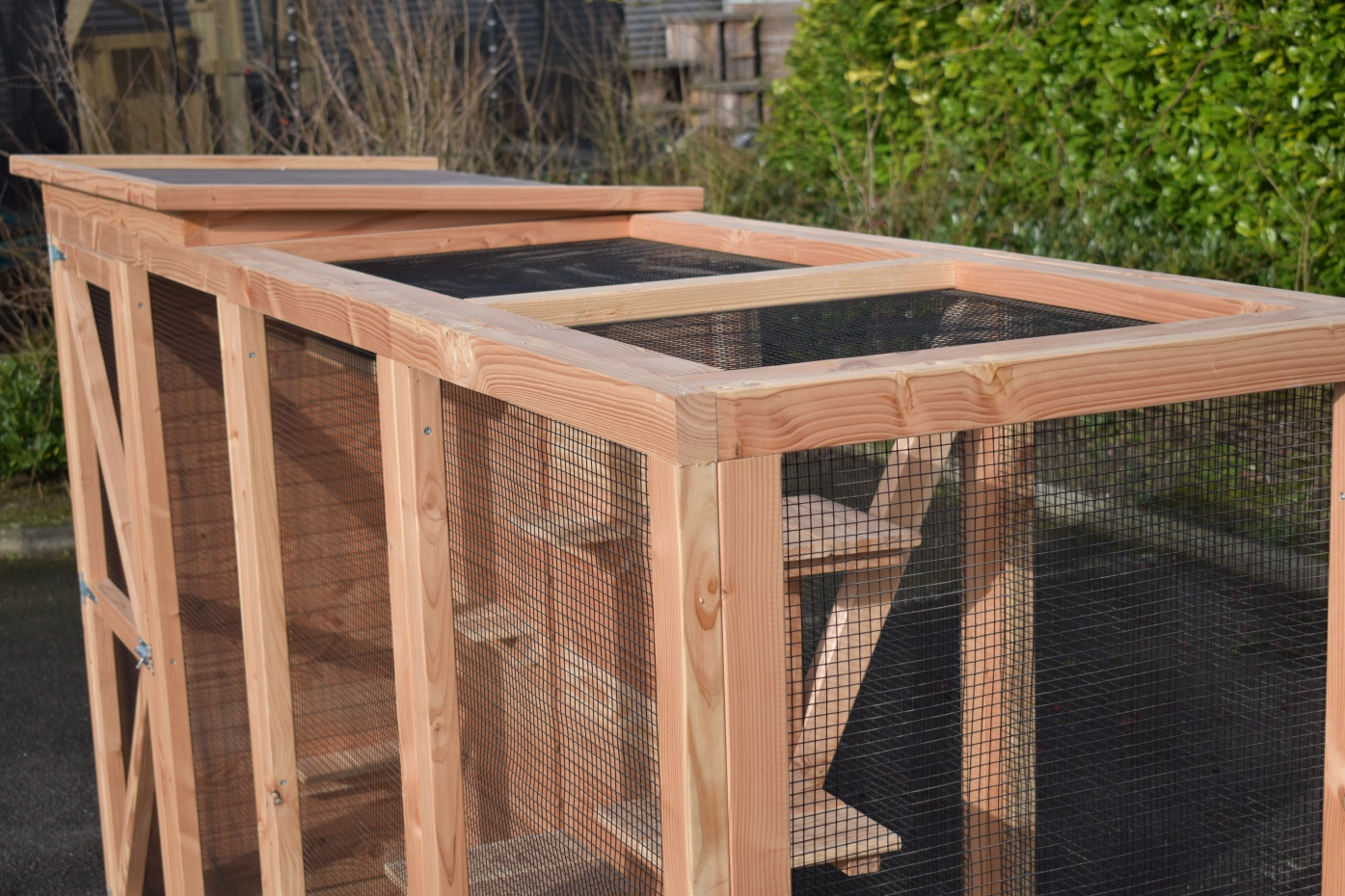 Kattenren Flex 4.1 is een prachtig, praktisch en luxe poezenverblijf om uw poezen of katten in te huisvesten op het balkon, in de tuin, of in huis. Een deel van de kattenren is voorzien van een dicht dak, en een deel heeft een gaasdak. Deze samengestelde kattenren kan eenvoudig uitgebreid of aangepast worden. Deze kattenren wordt geleverd zonder ligplateau, klimplankjes en klimpaal, deze zijn los mee te bestellen.