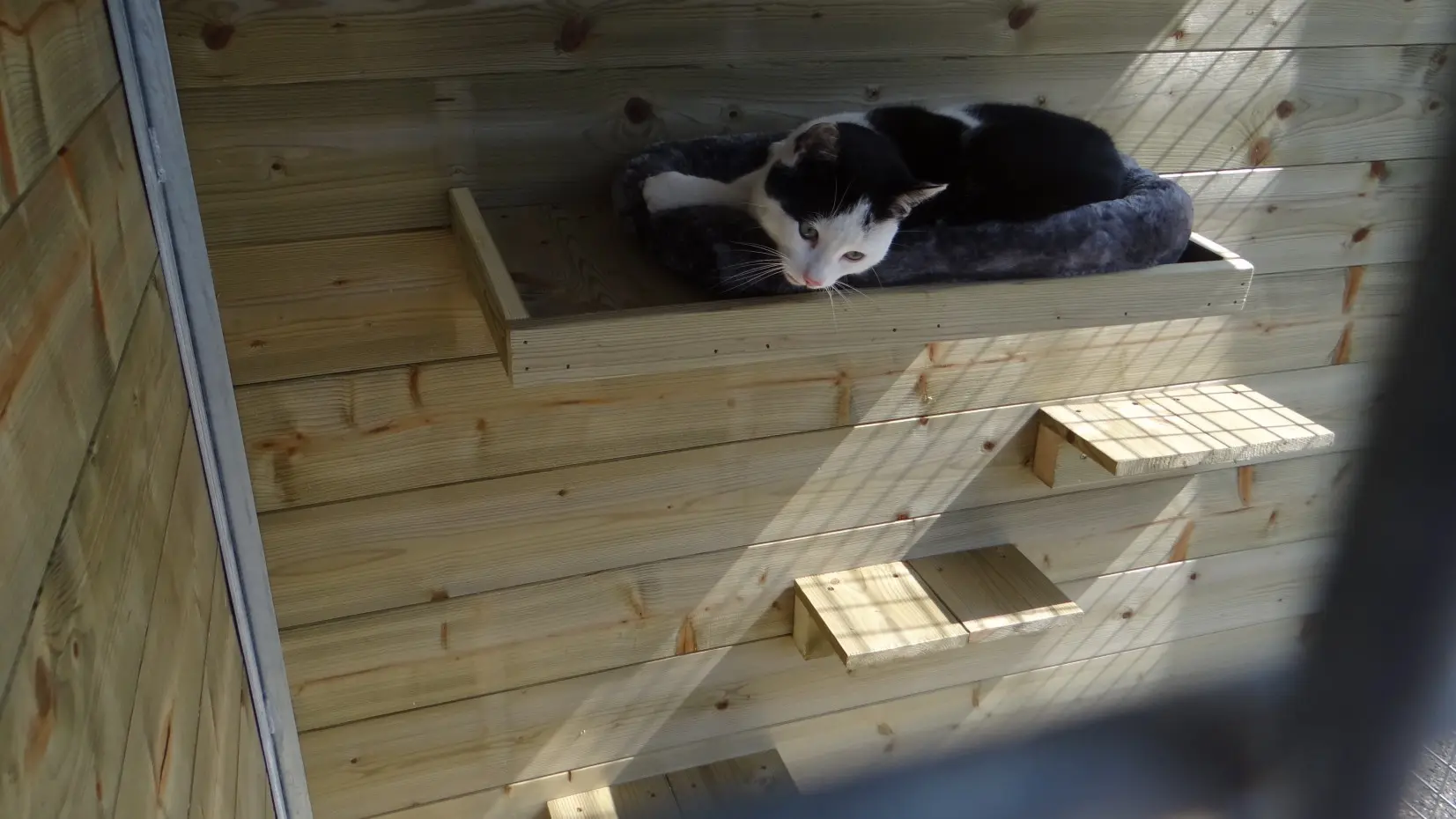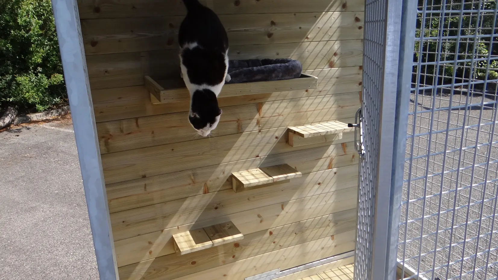 De vloer is van geïmpregneerd vurenhout 18mm en voorzien van afsluitlatten, zodat katten niet onderdoor de panelen kunnen kruipen.