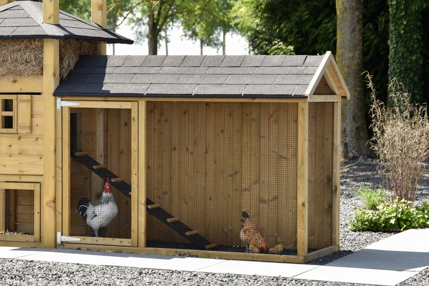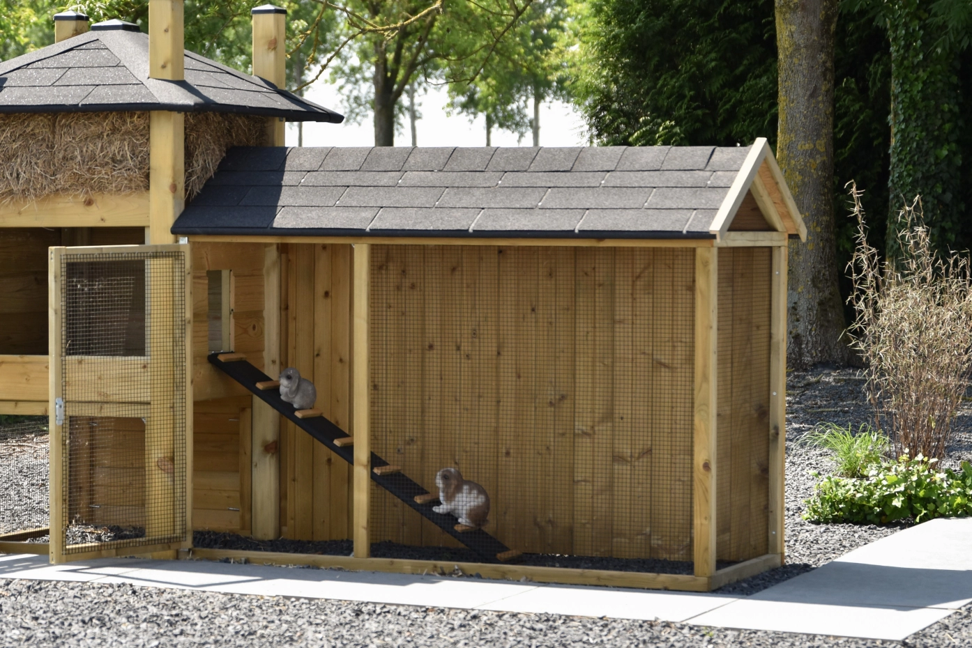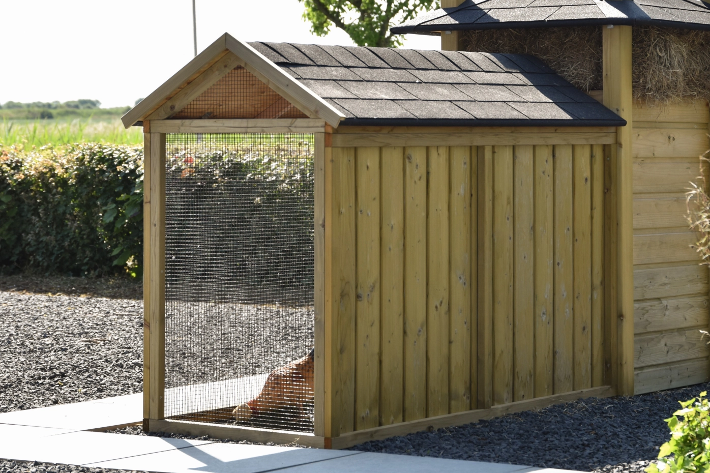 Overdekte ren is een unieke ren. Goede doorkijk door het zwarte gaas. De deur is zo groot mogelijk gehouden zodat u een optimale doorgang hebt. Deze ren is geschikt om tegen de hooiberg Rosa, Rosalynn & Rosanne te zetten. Door middel van vier schroeven kunt u de ren koppelen aan het hok. De ren heeft een dichte achterkant zodat de dieren lekker beschut kunnen rusten.