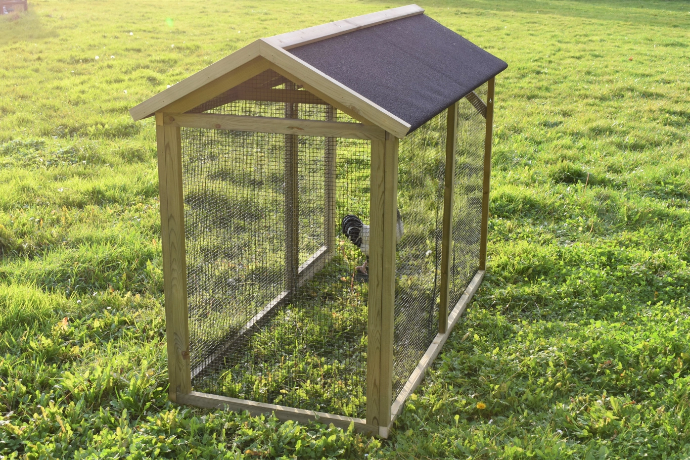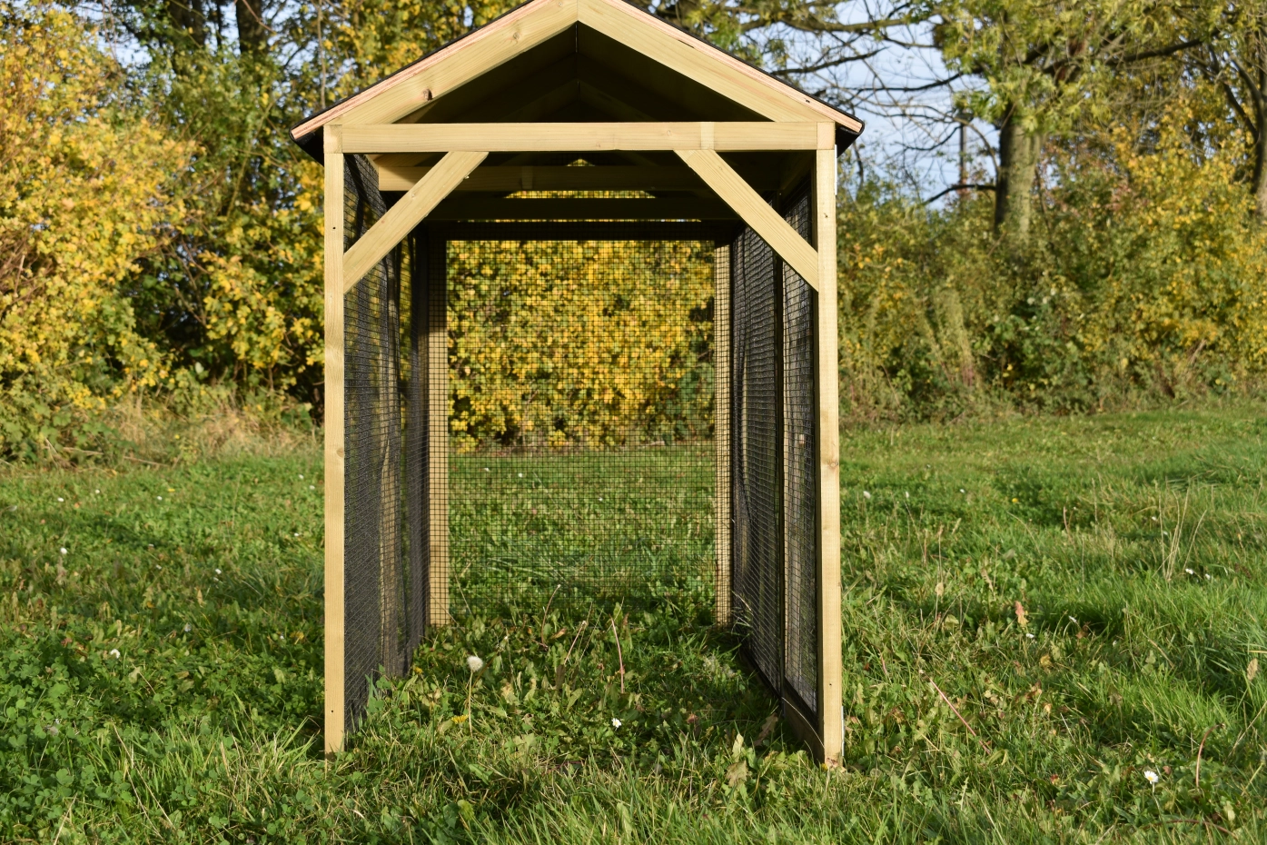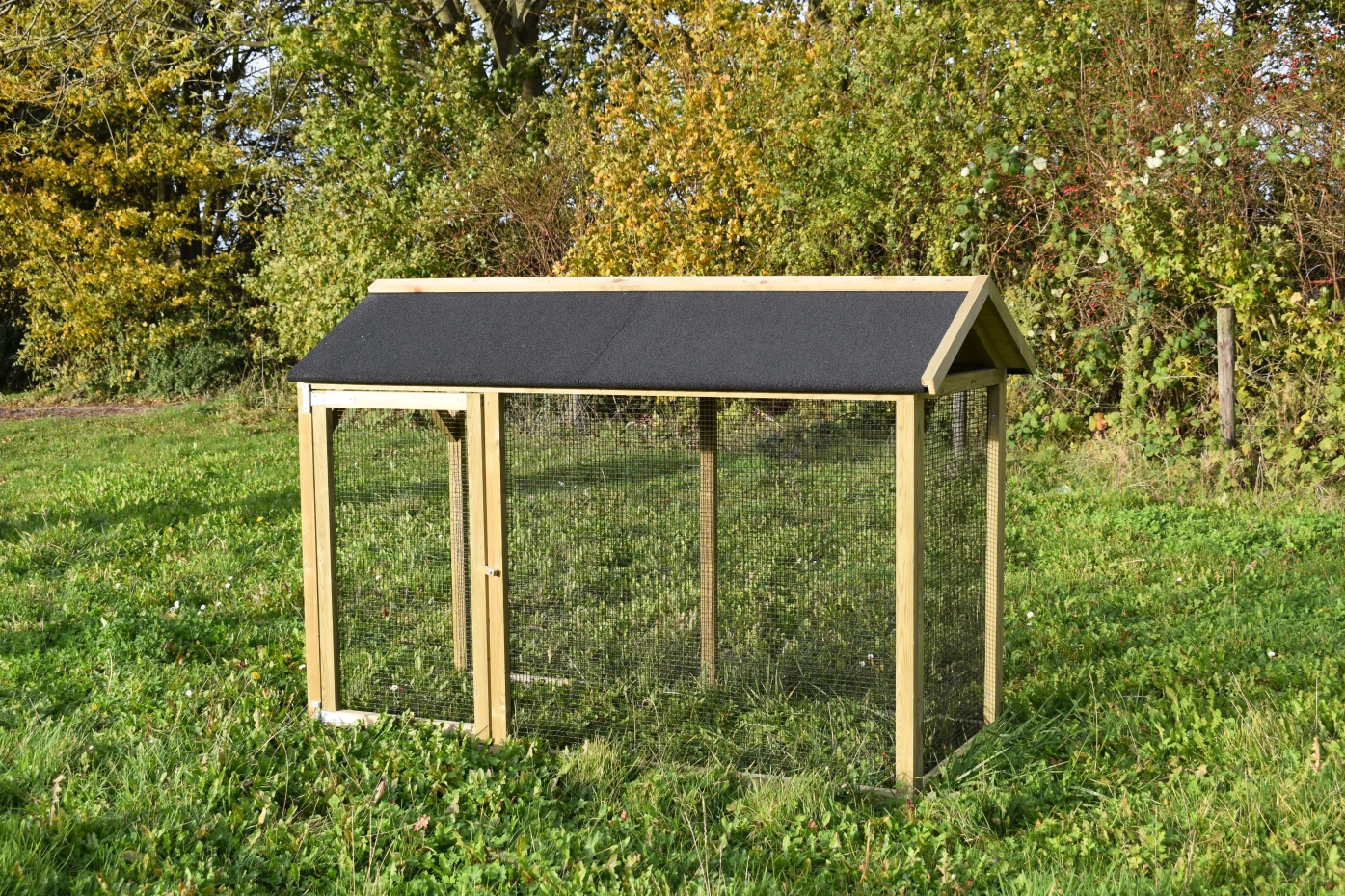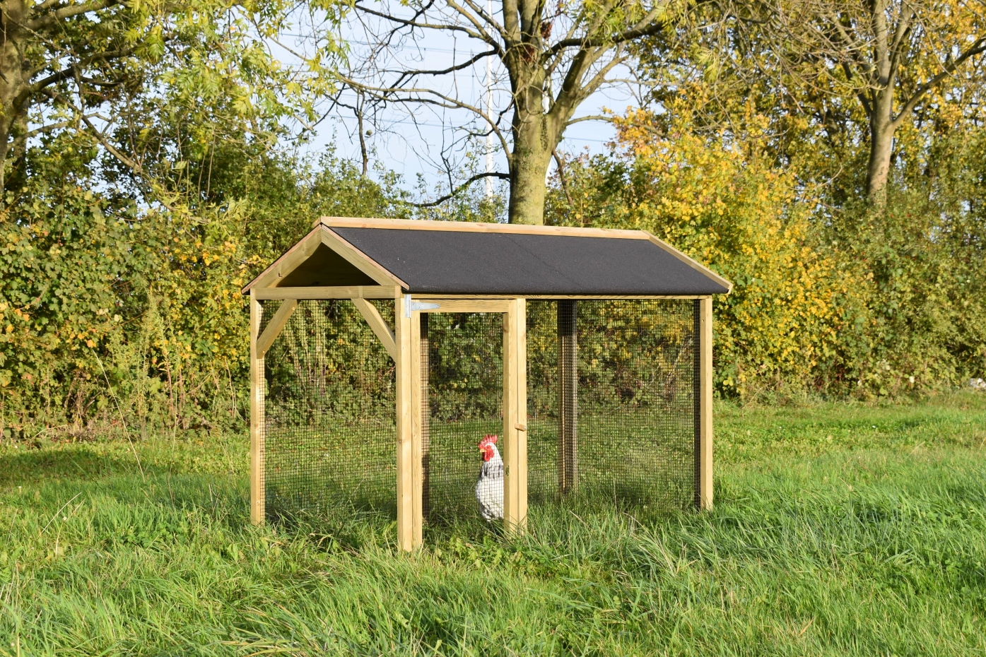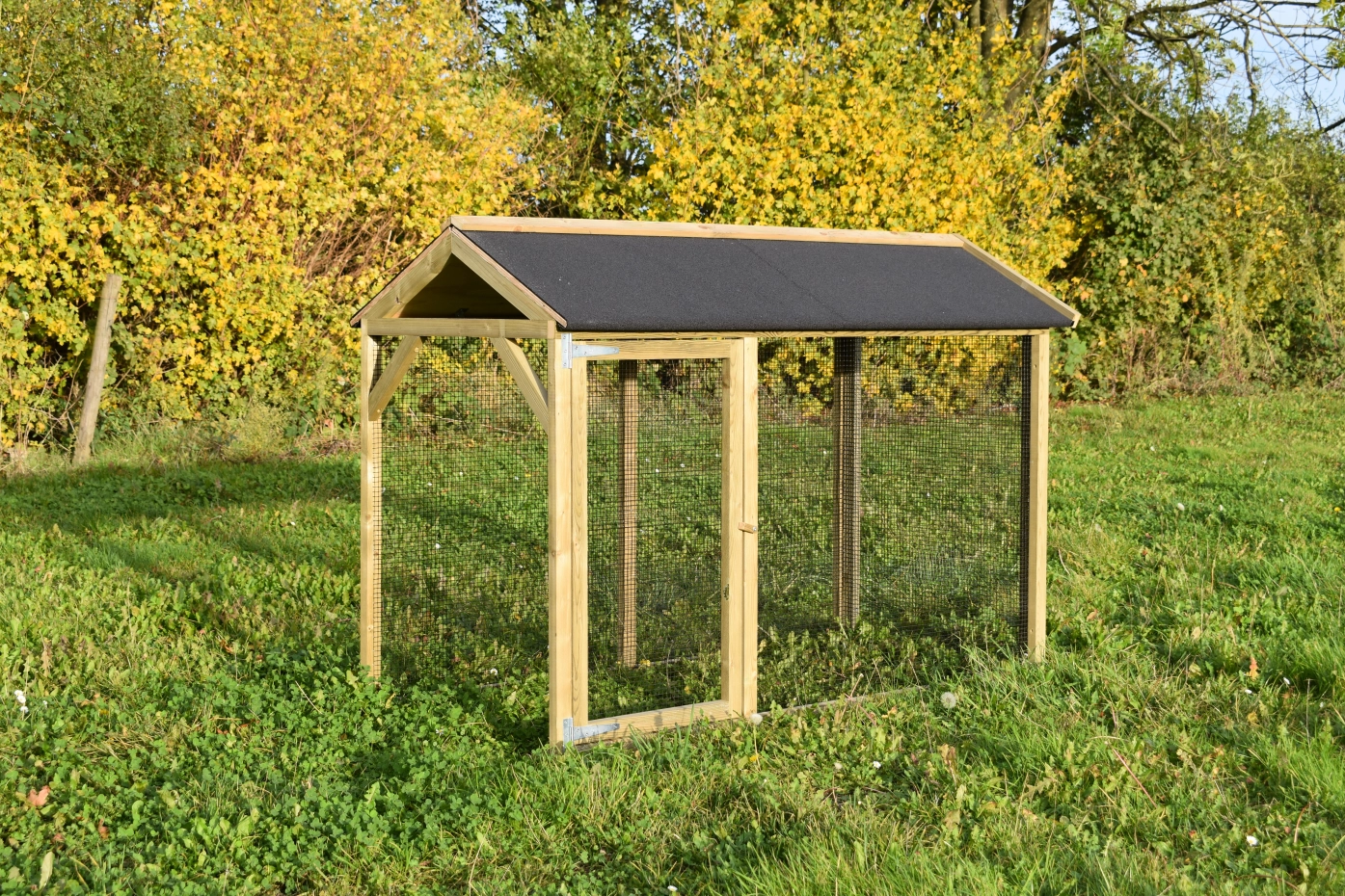 Overdekte ren is een unieke ren. Goede doorkijk door het zwarte gaas. De deur is zo groot mogelijk gehouden zodat u een optimale doorgang hebt. Deze ren is geschikt om tegen de hooiberg Rosa, Rosalynn & Rosanne te zetten. Door middel van vier schroeven kunt u de ren koppelen aan het hok.