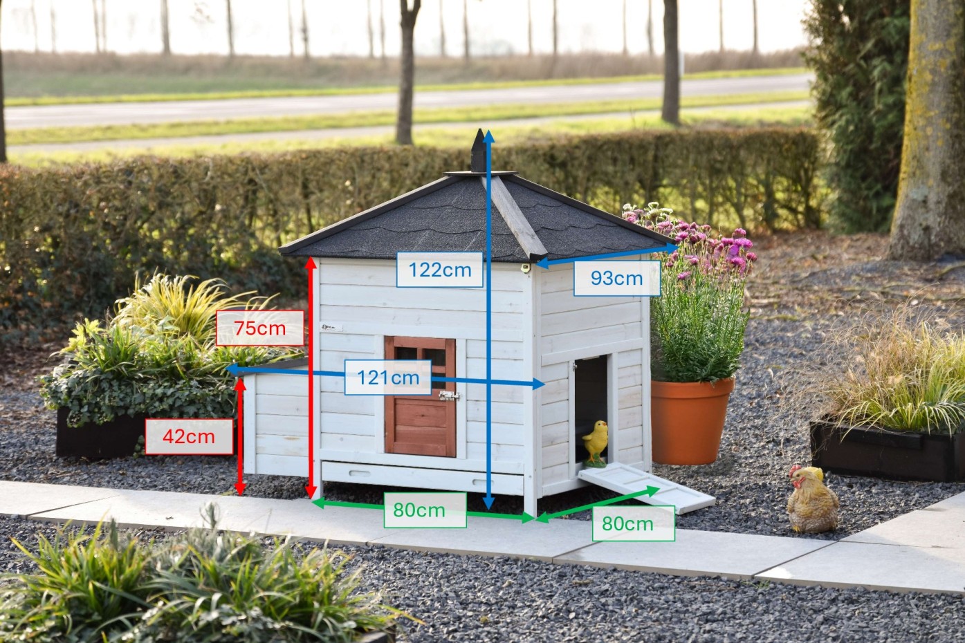 | Buitenwerkse afmetingen incl. dak en nestkast (BxDxH) | 121x93x122cm |