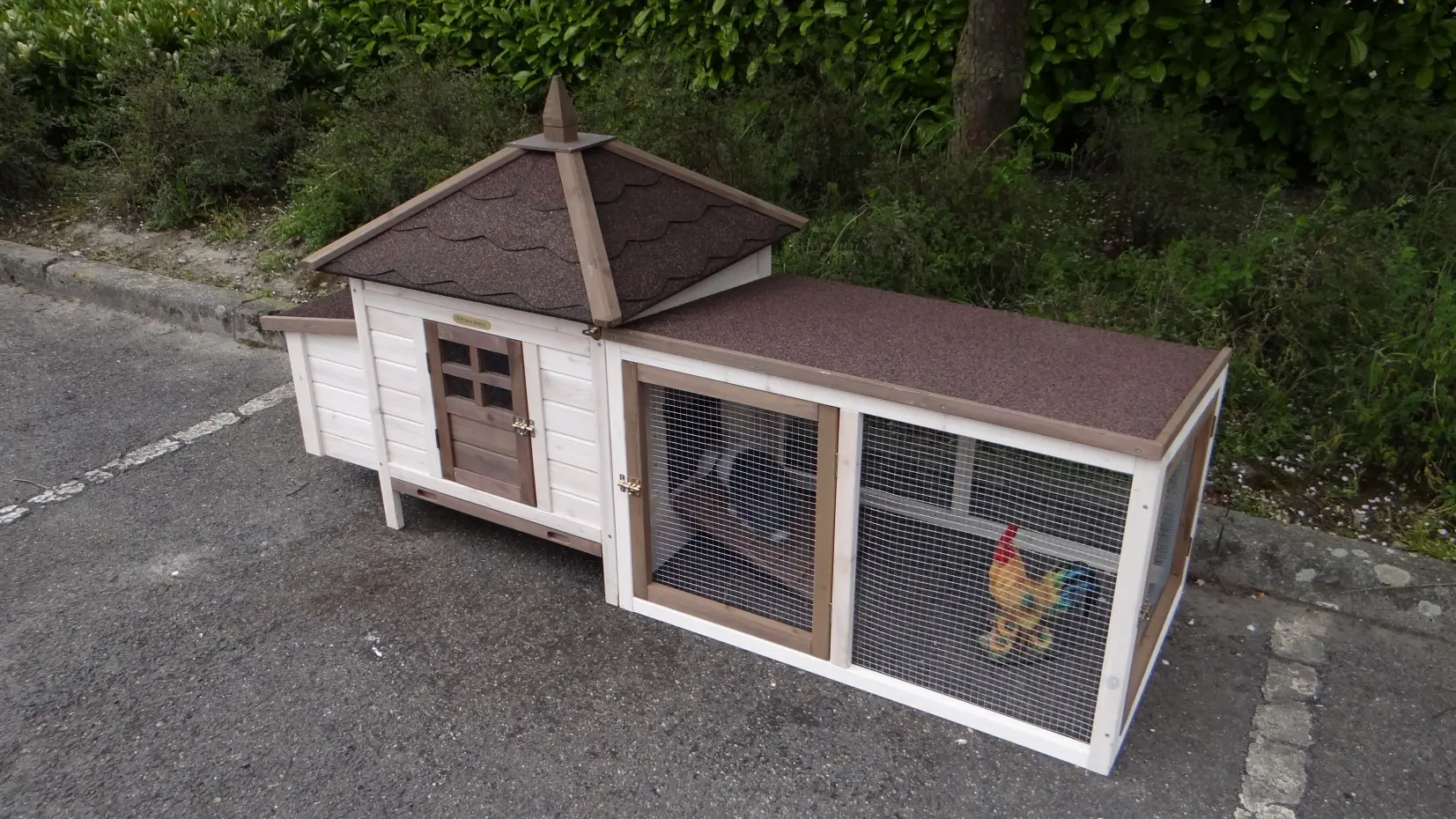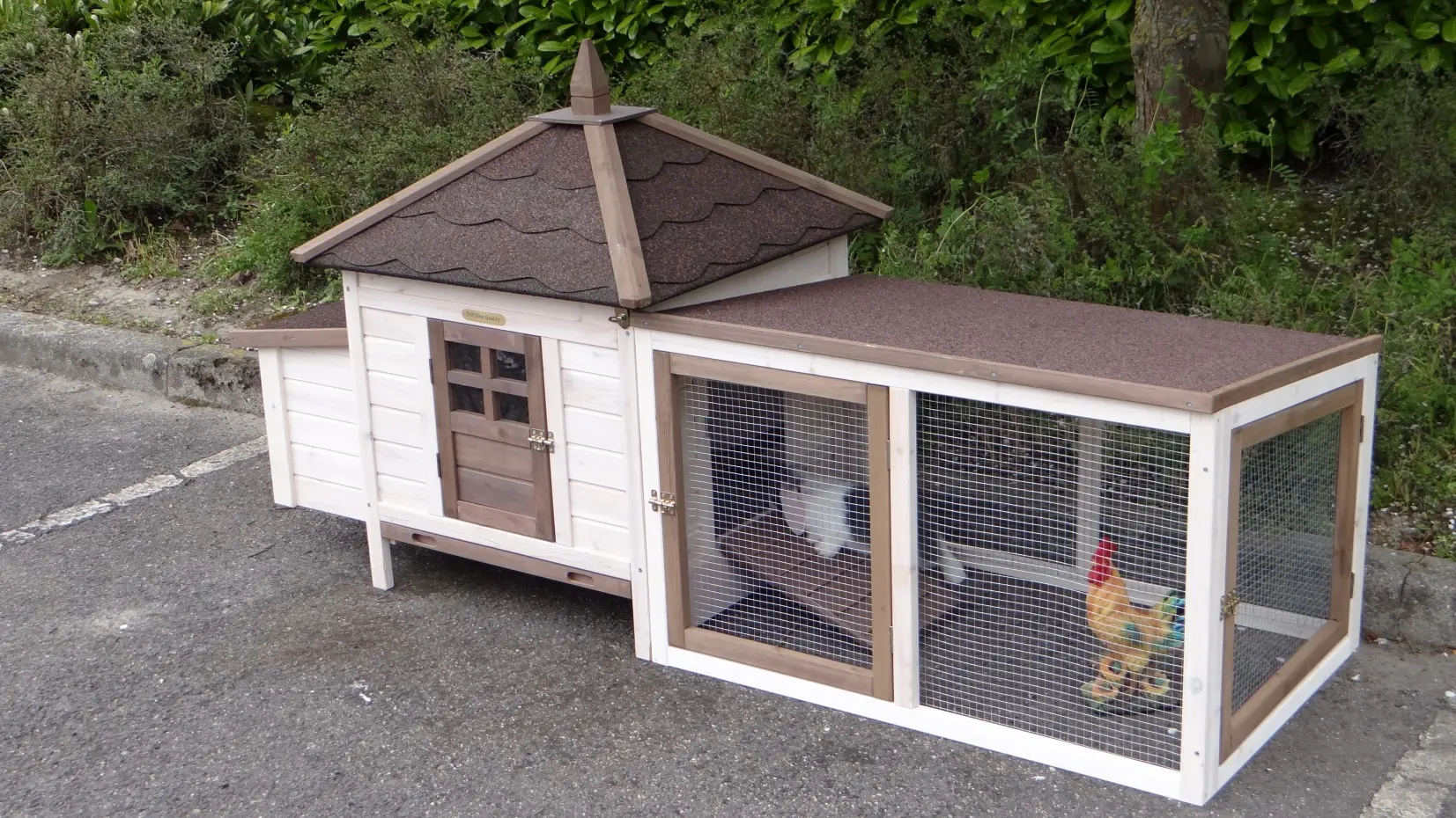 Het Kippenhok Ambiance Small met aanbouwren in de nieuwste kleuren is een schitterend kippenhok, en is tot in de puntjes helemaal af! Met handige uitschuifbare mestlade, en verwijderbaar dak. Oogstrelend mooi kippenhok met handige en mooie details. Een kippenren die ook nog eens oneindig uit te breiden is met extra rennen die u los kunt bijbestellen. Lekker flexibel dus. Kippenhok Ambiance Small met kippenren is inpasbaar in de meeste tuinen. Het nachthok is geschikt voor 4 tot 6 kippen, afhankelijk van rasgrootte. Maximale buitenwerkse afmeting van kippenhok Ambiance Small met ren is 200x77x99cm (BxDxH).