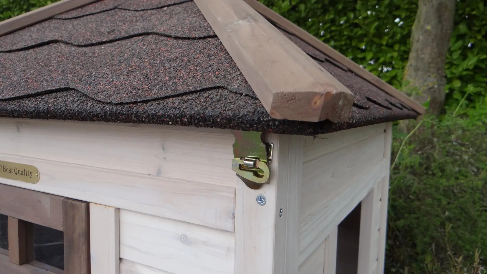 - Wanneer het hok niet op een beschutte plaats staat, dan adviseren wij om het te verankeren