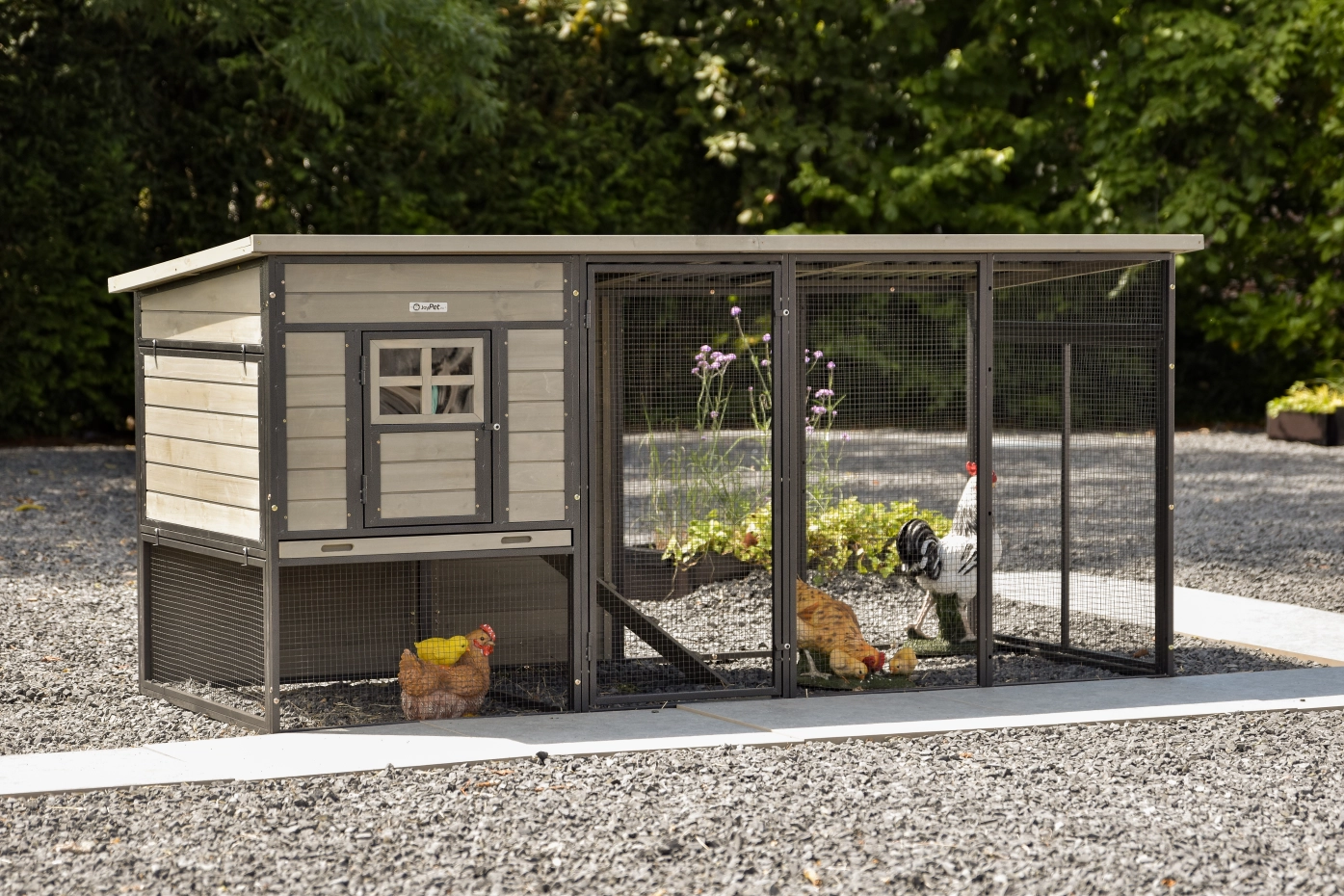 Kippenhok Judy is zeer ruim en praktisch. Het biedt een comfortabel verblijf voor uw Kippen en heeft een groot nachthok voor extra bescherming. Met een handige schoonmaaklade en een grote ren, is het perfect voor 4 grote kippen tot 9 kleine kippen.