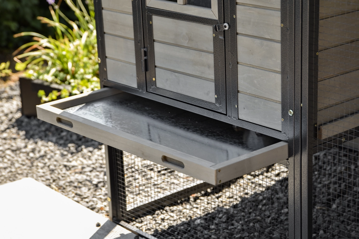 - Metalen schuiflade (zink) om het hok handig schoon te maken