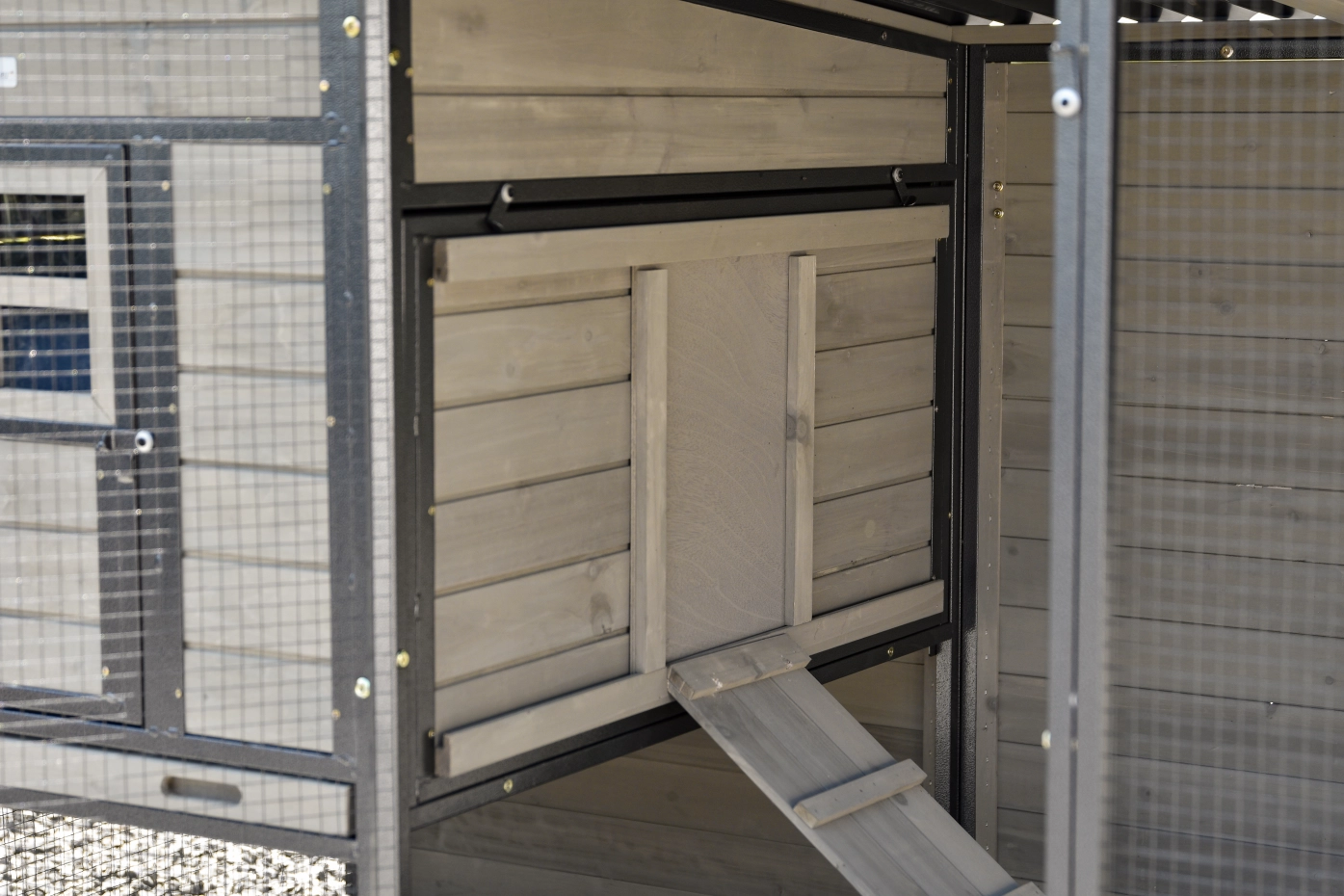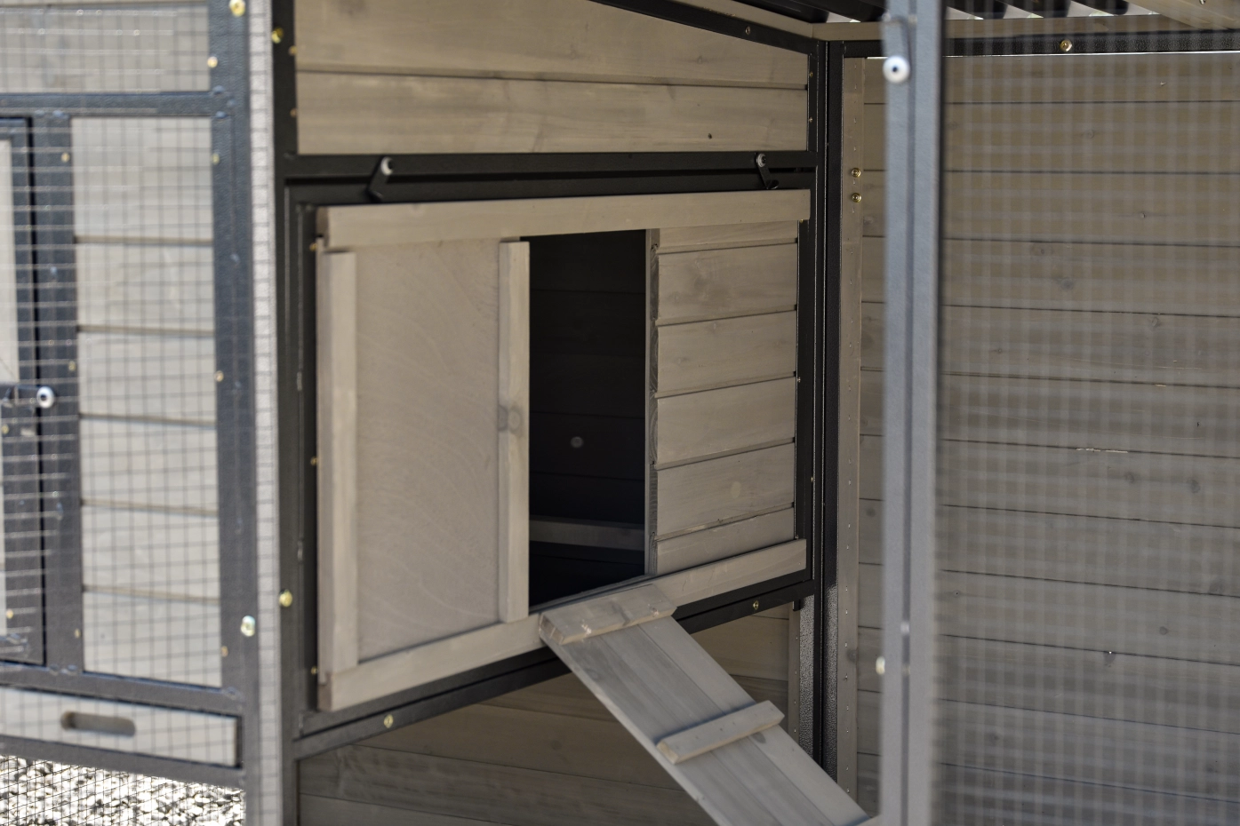 - Dierenhok van dennenhout met stevig, gecoat stalen frame en zwart gaas