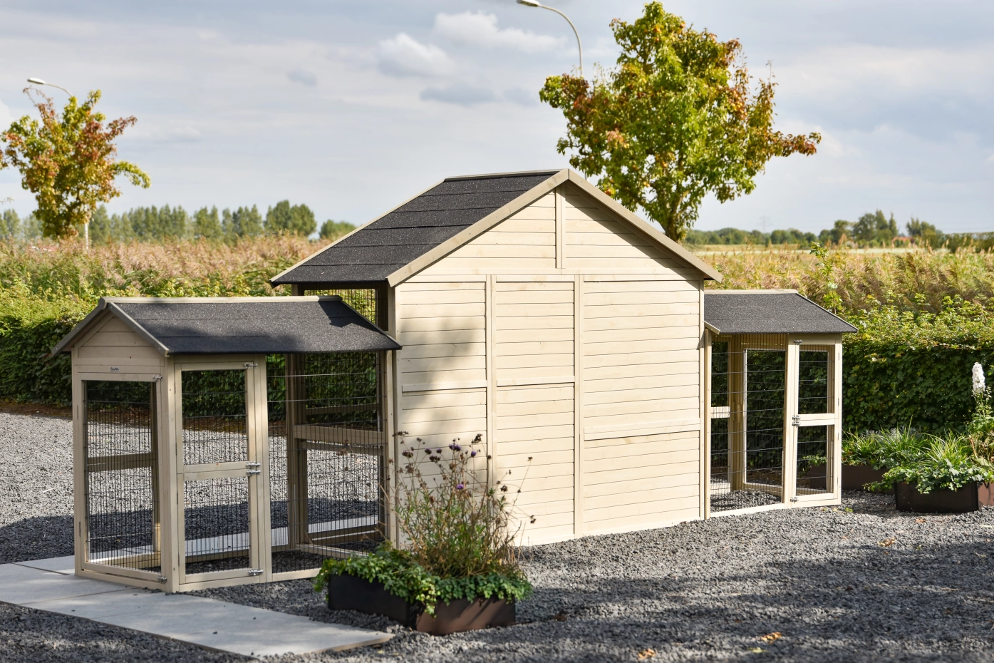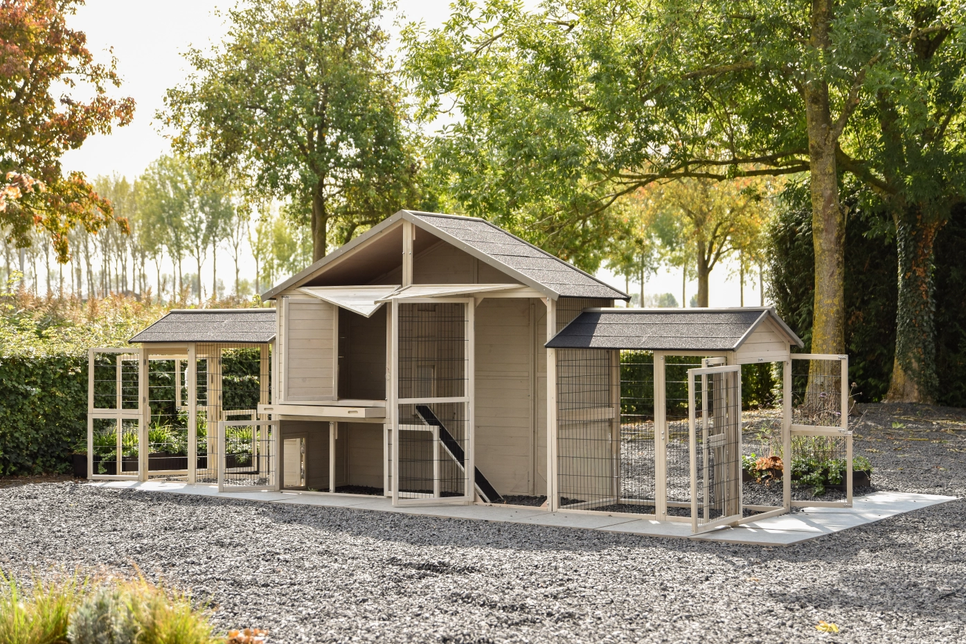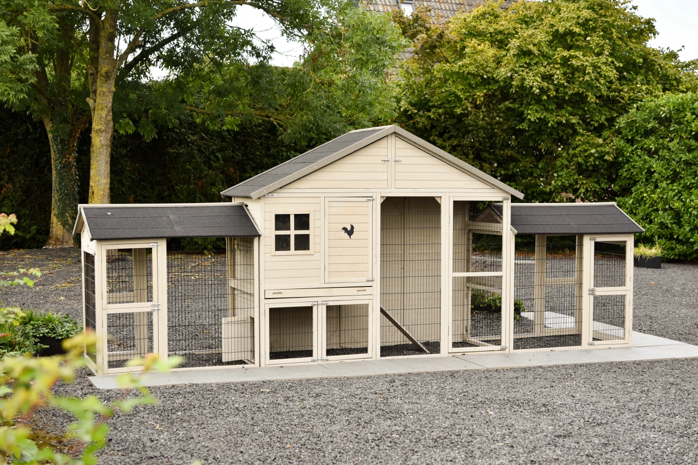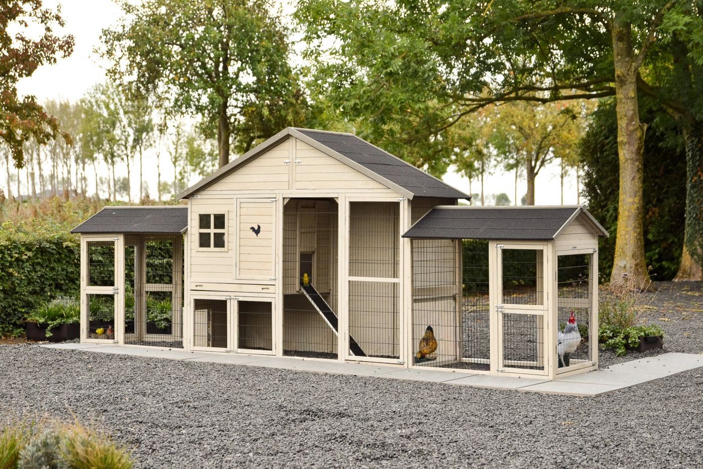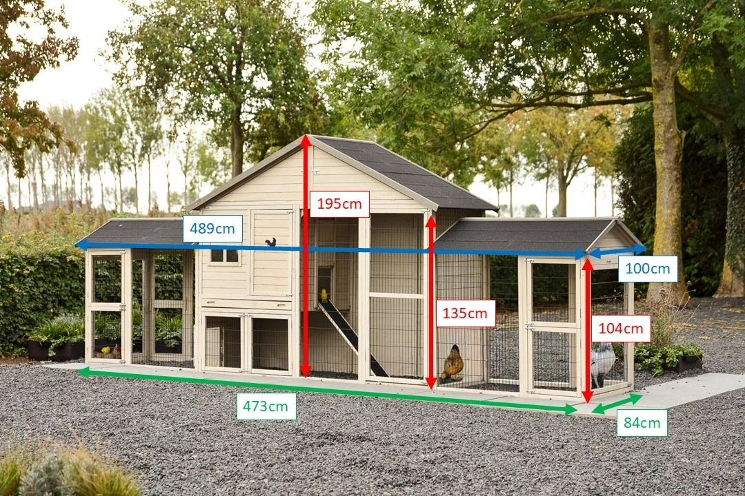 Groot kippenhok Holiday Large is een bijzonder mooi, handig en ruim hok met nachthok en extra ren Space Large. Aan dit kippenhok zitten bovendien twee aanbouwrennen vast, waardoor de kippen nog meer leefruimte krijgen. Dit schitterende hok is overal voorzien van ruime deuren en het nachthok beschikt over twee zitstokken. Boven het nachtgedeelte bevindt zich een ruime bergzolder. Het nachthok van kippenhok Holiday Large is geschikt voor het huisvesten van circa 4-10 kippen. Kippenhok Holiday Large is werkelijk een fantastisch kippenhok.