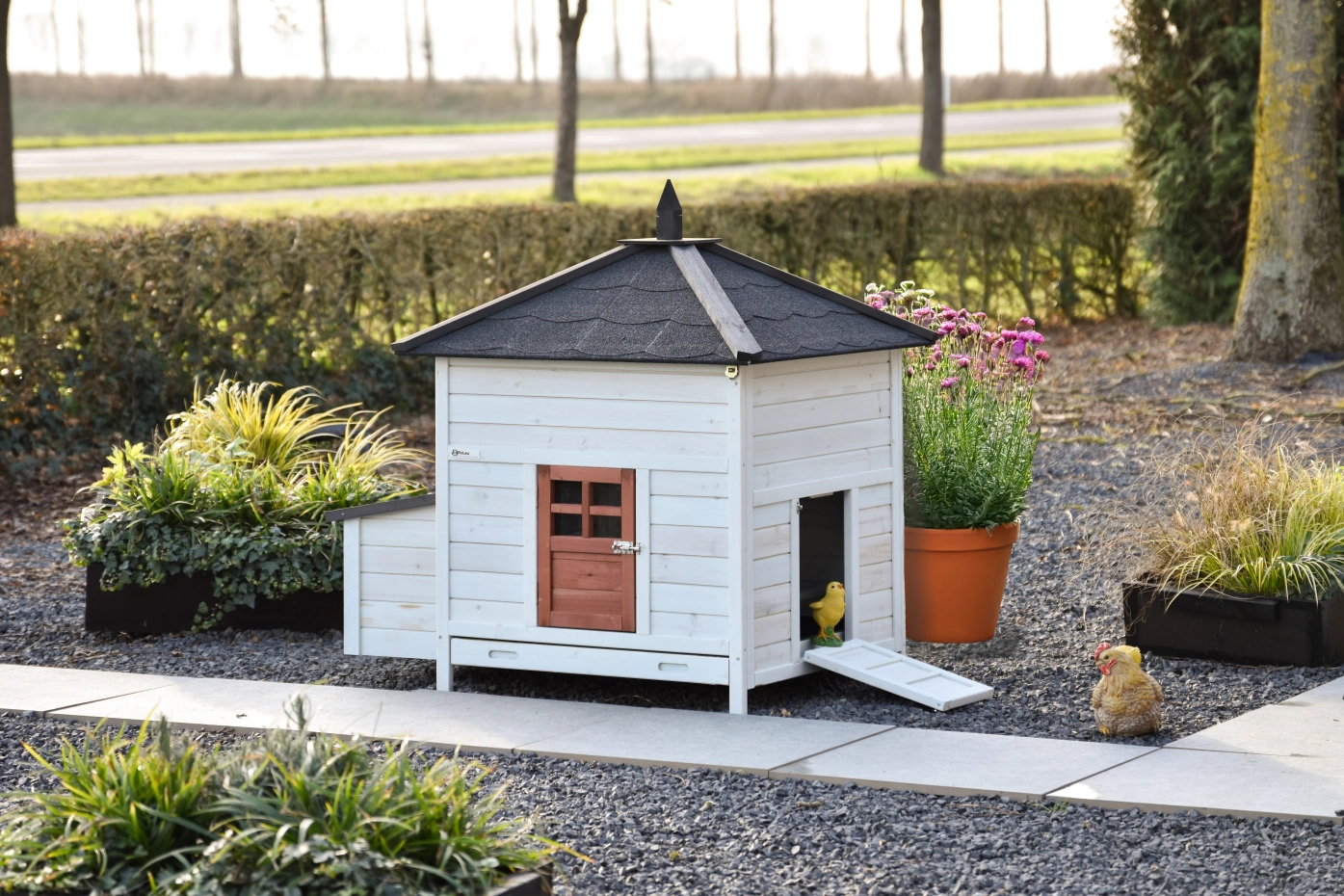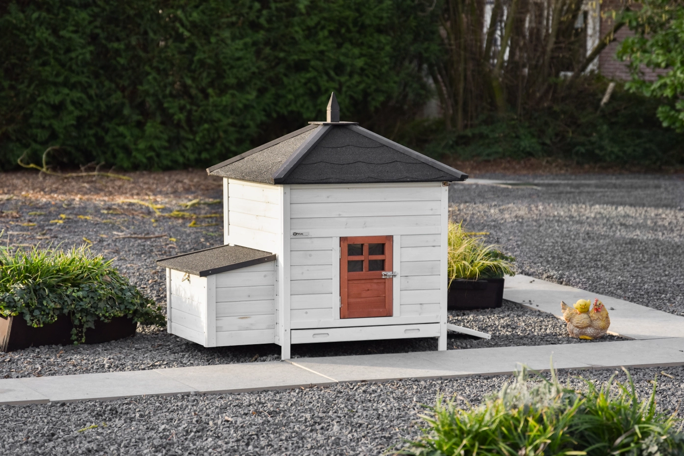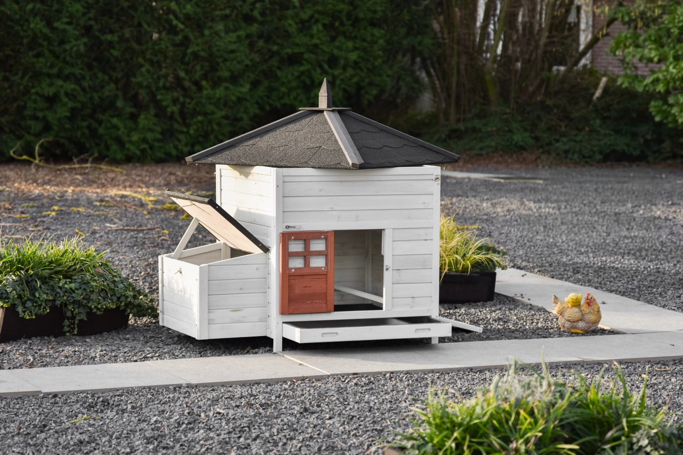 Schitterend kippenhok Ambiance Large! Dit kippenhok heeft een handige, uitschuifbare mestlade. Het complete dak van de Ambiance is er gemakkelijk af te halen. Op die manier is het kippenhok gemakkelijk schoon te maken. De Ambiance is een mooi kippenhok wat eindeloos uit te breiden is met de kippenren Ambiance Large. Deze aanbouwrennen kunt u los bij bestellen. Lekker flexibel dus.