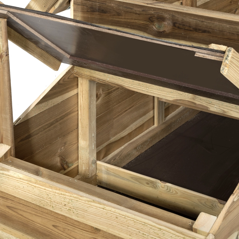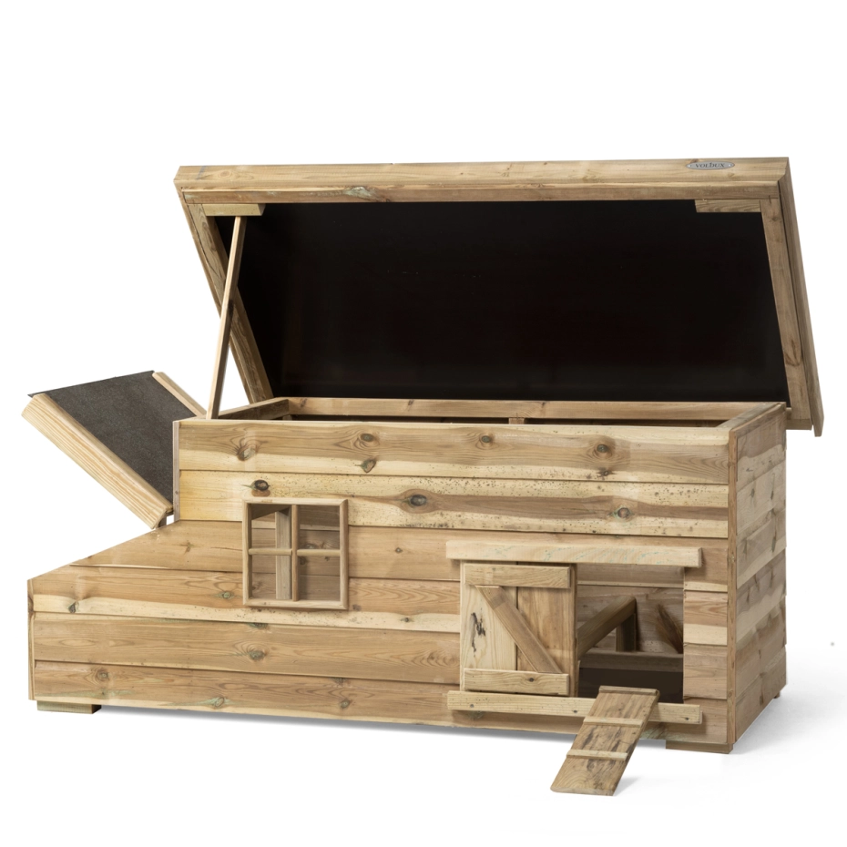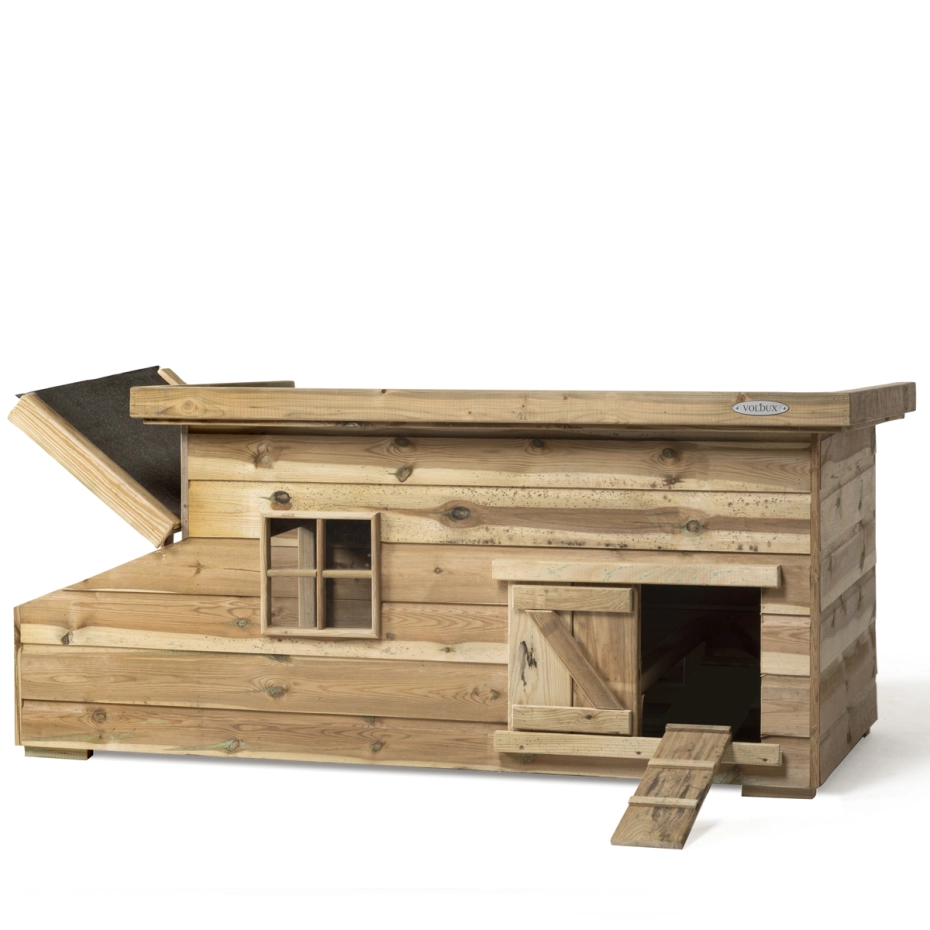 Kippenhok Fenne van Voldux is een heel praktisch kippenhok. Dit kippenhok is een combi van nachthok en legnest. Het complete dak is scharnierend, waardoor het hok gemakkelijk schoongemaakt kan worden. Ook het deksel van het legnest is open te klappen, waardoor de eieren gemakkelijk te rapen zijn. De Fenne is gemaakt van geïmpregneerd hout, waardoor het een onderhoudsvrij hok voor uw kippen is.