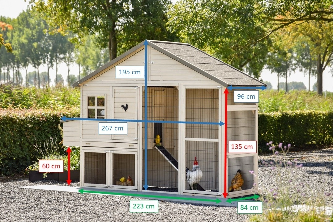 | Buitenwerkse afmetingen incl. dak en nestkast (BxDxH) | 267x96x195cm |