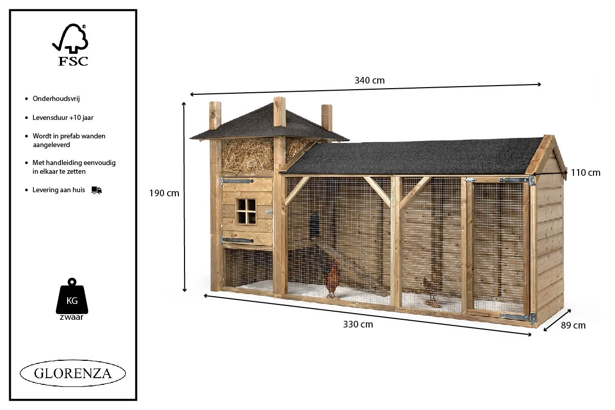 | Buitenwerkse afmetingen incl. dak (BxDxH) | 340x110x190cm |