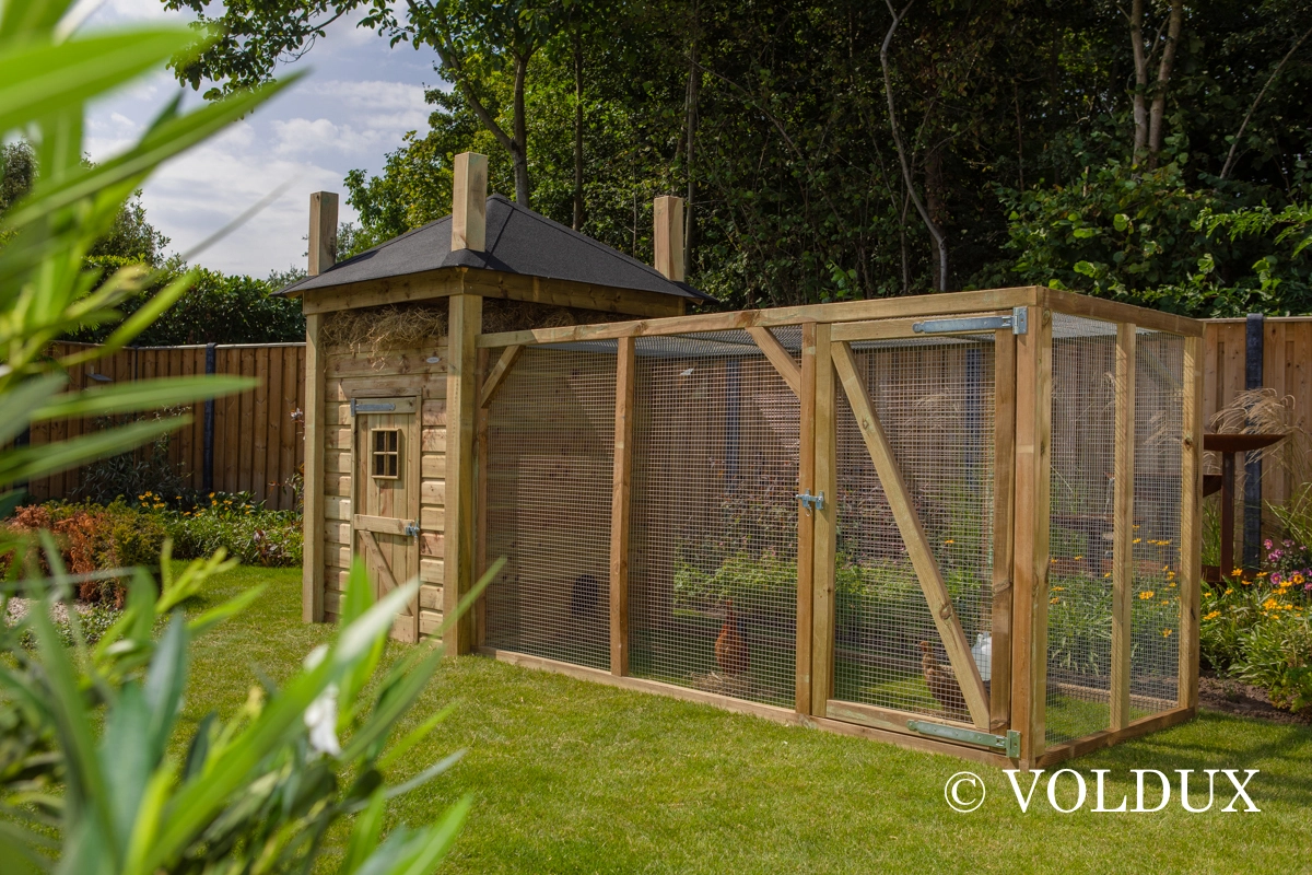 Dit duurzame kippenhok is handgemaakt met het gebruik van onderhoudsvrije materialen. Het kippenhok met de welke is voorzien van een nachthok, hooiopslag én ruime kippenren heeft een totale (buiten) afmeting van 462x175x225cm en biedt hiermee ruimte voor het huisvesten van meerdere kleine óf grote kippen. Het handgemaakte kippenhok Loes heeft de klassieke kenmerken van een kippen hooiberg. De hooiberg is opgebouwd op een stevige constructie van geïmpregneerde balken en is afgewerkt met rabatdelen. De dakconstructie rust op de vier stevige robuuste balken van geïmpregneerd hout, onder het dak bevindt zich een open ruimte welke gebruikt kan worden voor de opslag van hooi en stro. Het dak van de hooiberg is voorzien van stevig dakleer waardoor een perfecte afwatering ontstaat op het verblijf. Aan de voorzijde beschikt het kippen nachthok over een grote toegangsdeur welke kan worden afgesloten en is voorzien van een plexiglas venster. Het nachthok is bovenal voorzien van een ruim legnest voor jouw hennen én een zitstok voor de nacht. De aangrenzende kippenren is vanuit het nachthok via een vrije doorgang eenvoudig te betreden. Deze kippenren biedt veel scharrelruimte voor jouw kippen en hiernaast volledig gesloten door het gebruik van stevig gaas. De kippenren is gemaakt van geïmpregneerde balken en is hiernaast voorzien van een toegangsdeur aan de voorzijde. Dit veelzijdige kippenhok biedt al het comfort, de ruimte én de veiligheid die jouw kippen nodig hebben.