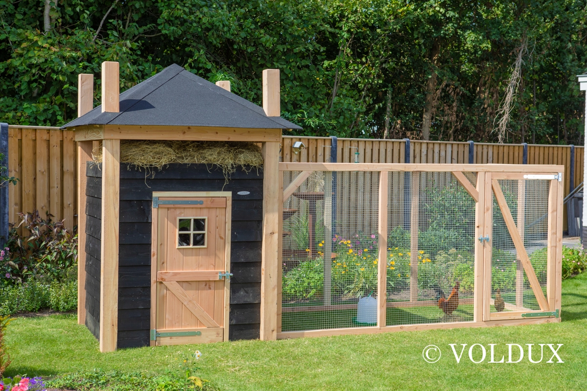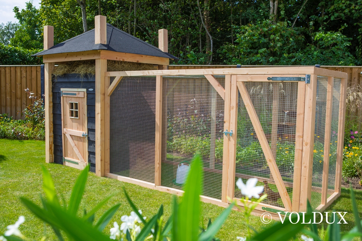 Dit extra grote kippenhok heeft een (buiten) afmeting van 462x175x225cm en is hiermee een van de grootste uit de collectie. Dit prachtige verblijf wordt handgemaakt met onderhoudsvrije en duurzame materialen. Dit maakt het verblijf niet alleen vrij van onderhoud, het biedt ook een levensduur van 10 tot 15 jaar. Hooiberg Niek XL is een extra groot kippenhok met de uitstraling van een klassieke hooischuur. Dit prachtige verblijf is een aanwinst voor jouw kippen én voor de tuin. Het kippenverblijf bestaat uit twee gedeeltes; een nachthok in de vorm van een hooiberg én een ruime scharrelruimte. Het nachthok van dit verblijf is ontworpen met een stevige basis constructie van geïmpregneerde balken. Aan de buitenzijde is dit frame verfraaid én verstevigd met Douglas balken. Deze Douglas balken ondersteunen het spitse dak van de hooiberg. Doordat het dak is verhoogd ontstaat een ruimtelijke opslag voor het hooi en stro van jouw dieren. Het nachthok is voorzien van een legnest, een zitstok én een grote toegangsdeur voorzien van een plexi glas venster. Via een vrije doorgang kunnen jouw kippen zo de kippenren in scharrelen. Deze ruime kippenren biedt jouw kippen méér dan vier vierkante meter veilige scharrelruimte. De kippenren is volledig gesloten door middel van stevig gaas in een frame van Douglas balken. Aan de voorzijde beschikt de kippenren over een brede toegangsdeur waardoor je de ren eenvoudig kunt betreden. De Hooiberg Niek biedt alles wat jouw kippen nodig hebben op het gebied van ruimte, comfort én veiligheid.