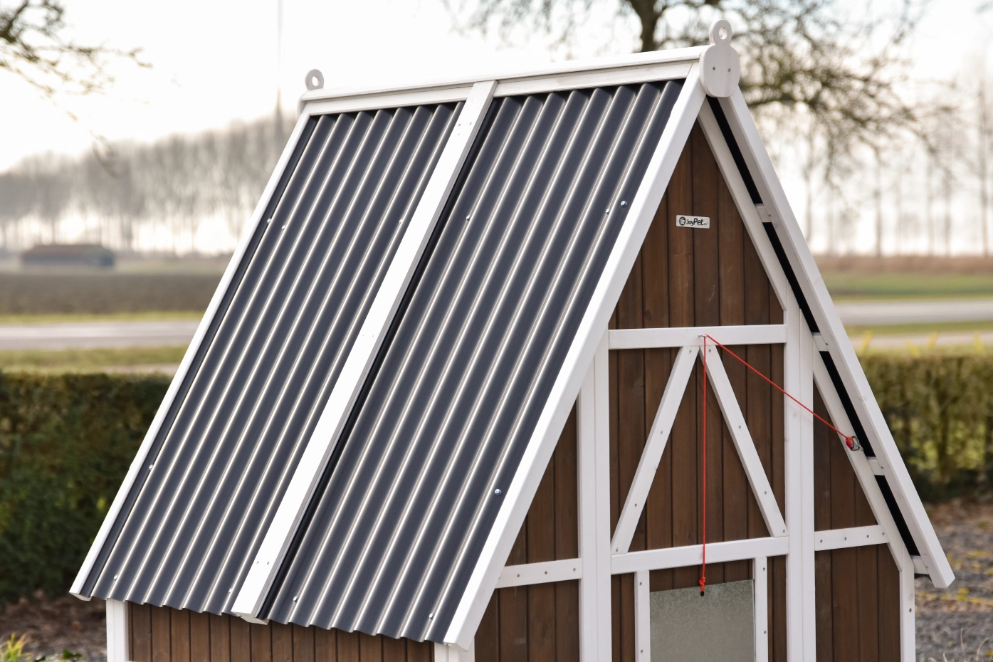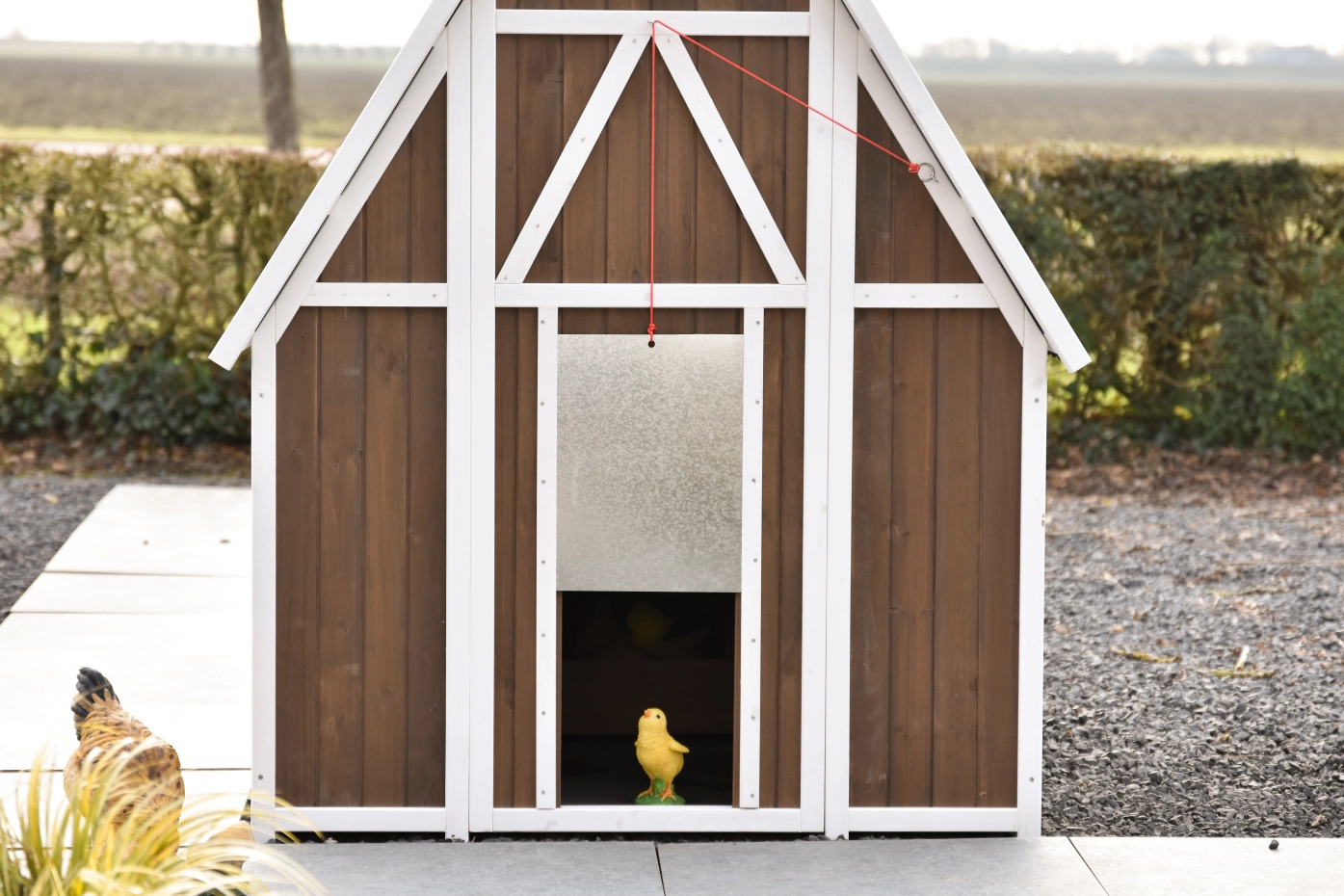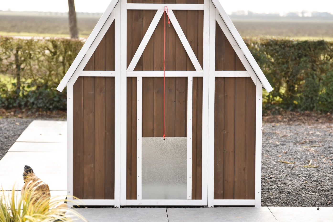 Het hok is afsluitbaar met een aluminium schuifluik dat soepel te bedienen is met een touwtje, waardoor je de kippen veilig kunt opsluiten. Het dak van kunststof golfplaten beschermt het hok goed tegen regen en andere weersinvloeden.