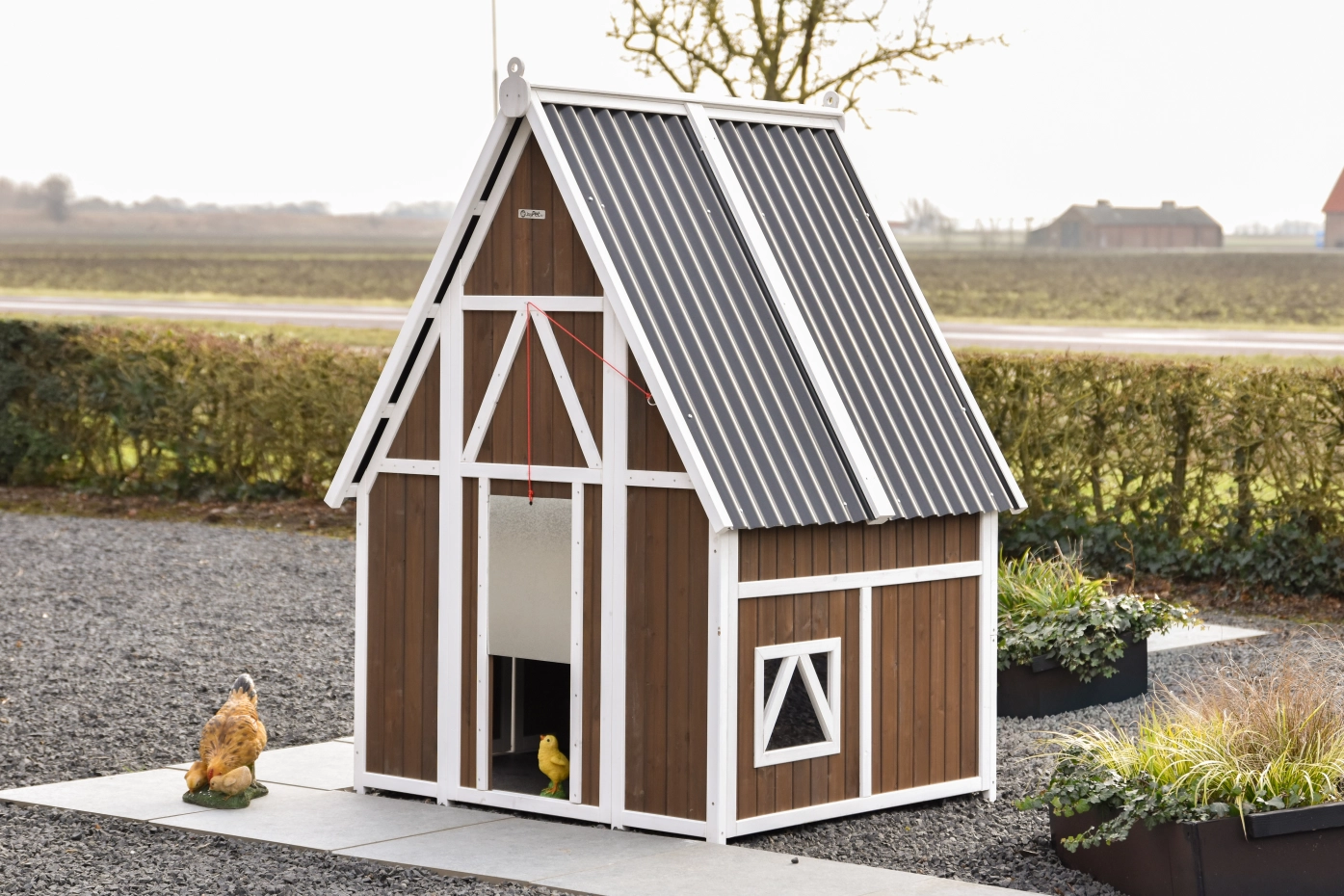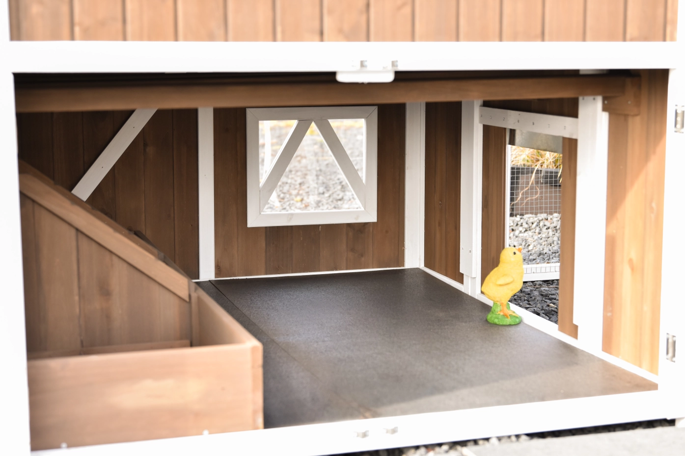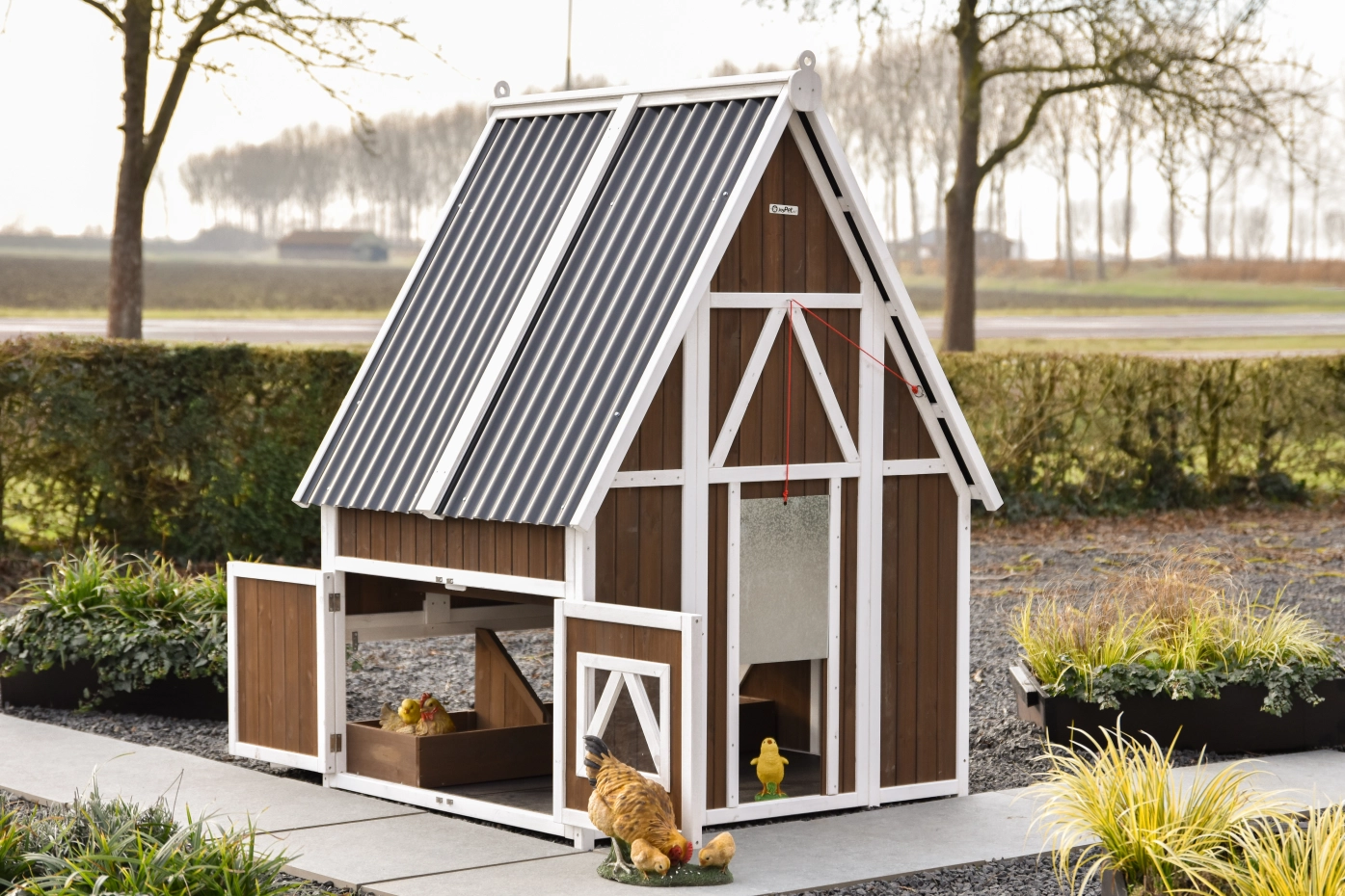 Het hok is afsluitbaar met een aluminium schuifluik dat soepel te bedienen is met een touwtje, waardoor je de kippen veilig kunt opsluiten. Het dak van kunststof golfplaten beschermt het hok goed tegen regen en andere weersinvloeden.