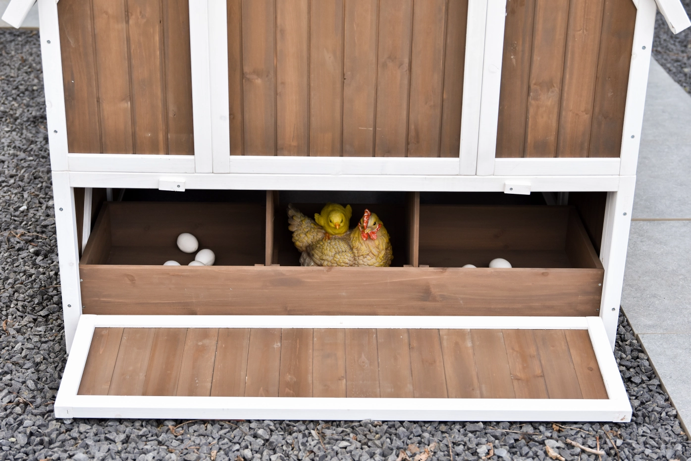 In het hok zitten drie zitstokken die je zelf op de gewenste hoogte vastschroeft, zodat je de indeling kunt aanpassen aan jouw kippen. De ruime legbak is verdeeld in drie vakken en biedt voldoende plek om ongestoord eieren te leggen. Via het handige luik aan de achterkant pak je de eieren snel en eenvoudig.
