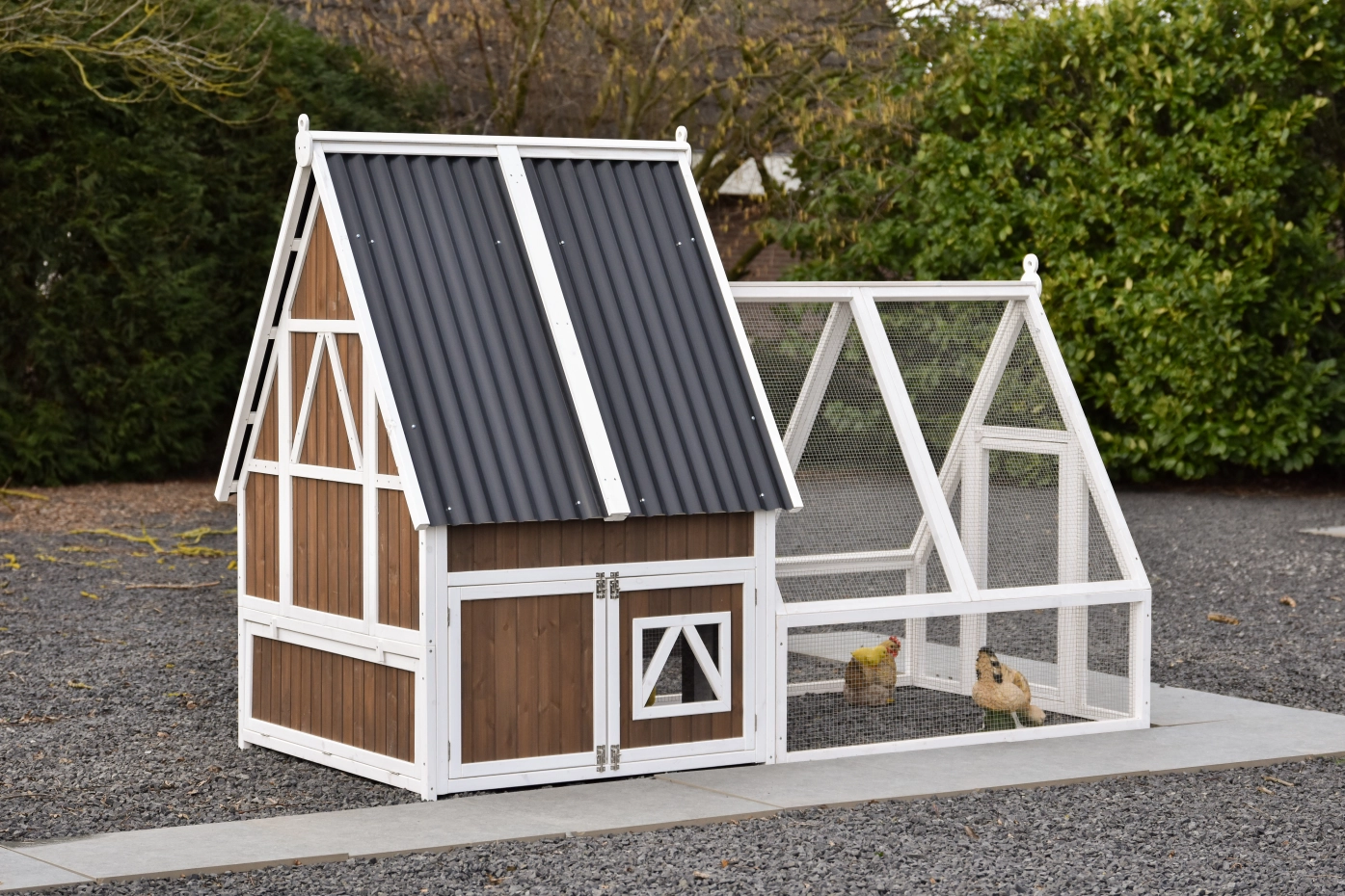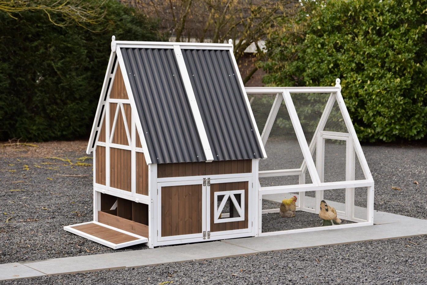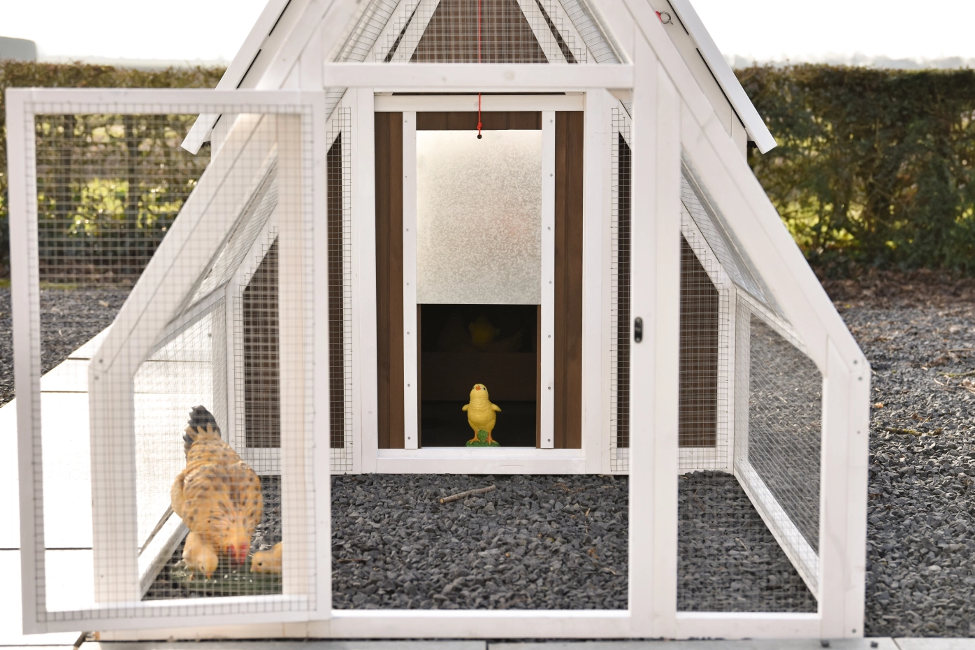 Het hok is afsluitbaar met een aluminium schuifluik dat soepel te bedienen is met een touwtje, waardoor je de kippen veilig kunt opsluiten. Het dak van kunststof golfplaten beschermt het hok goed tegen regen en andere weersinvloeden.