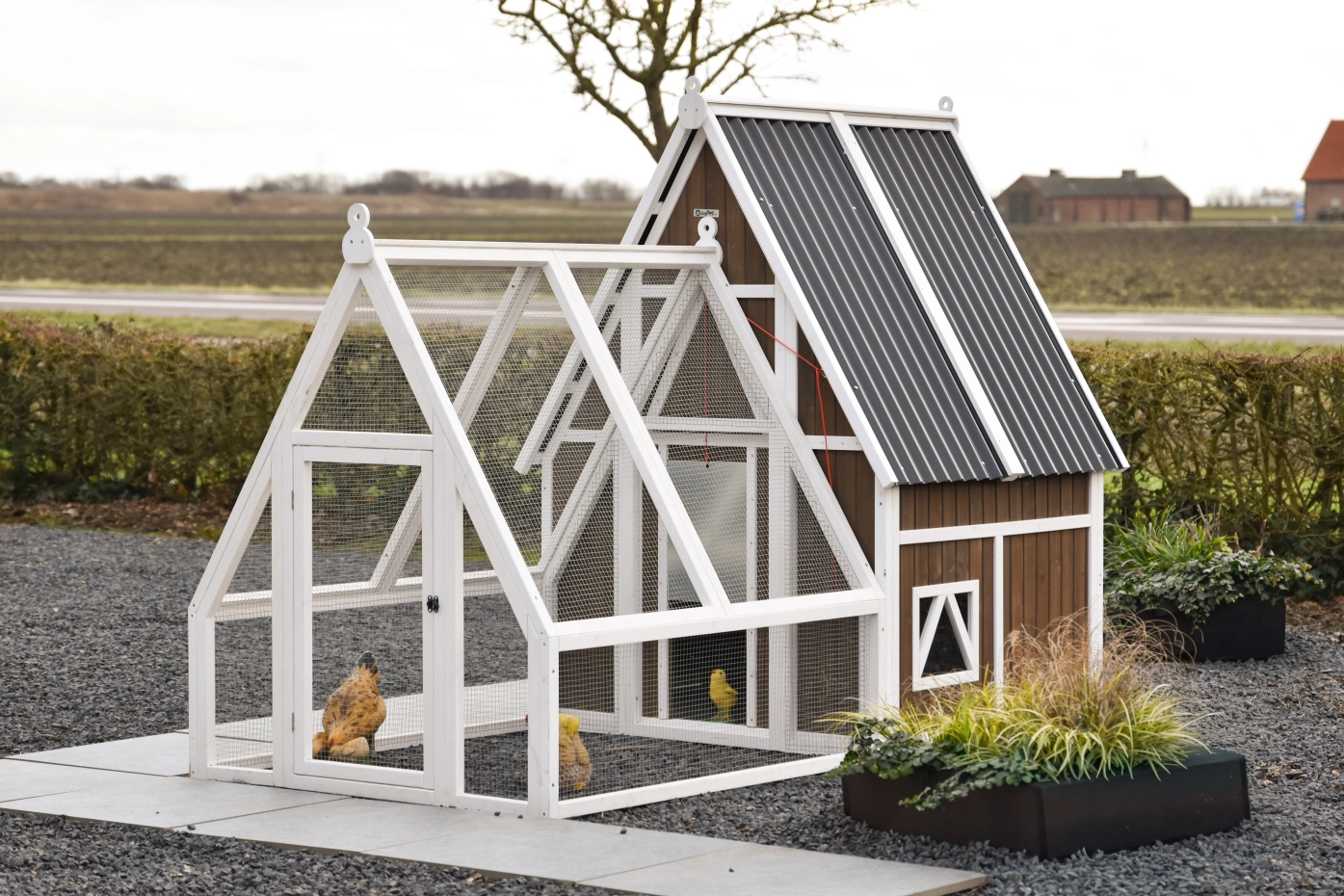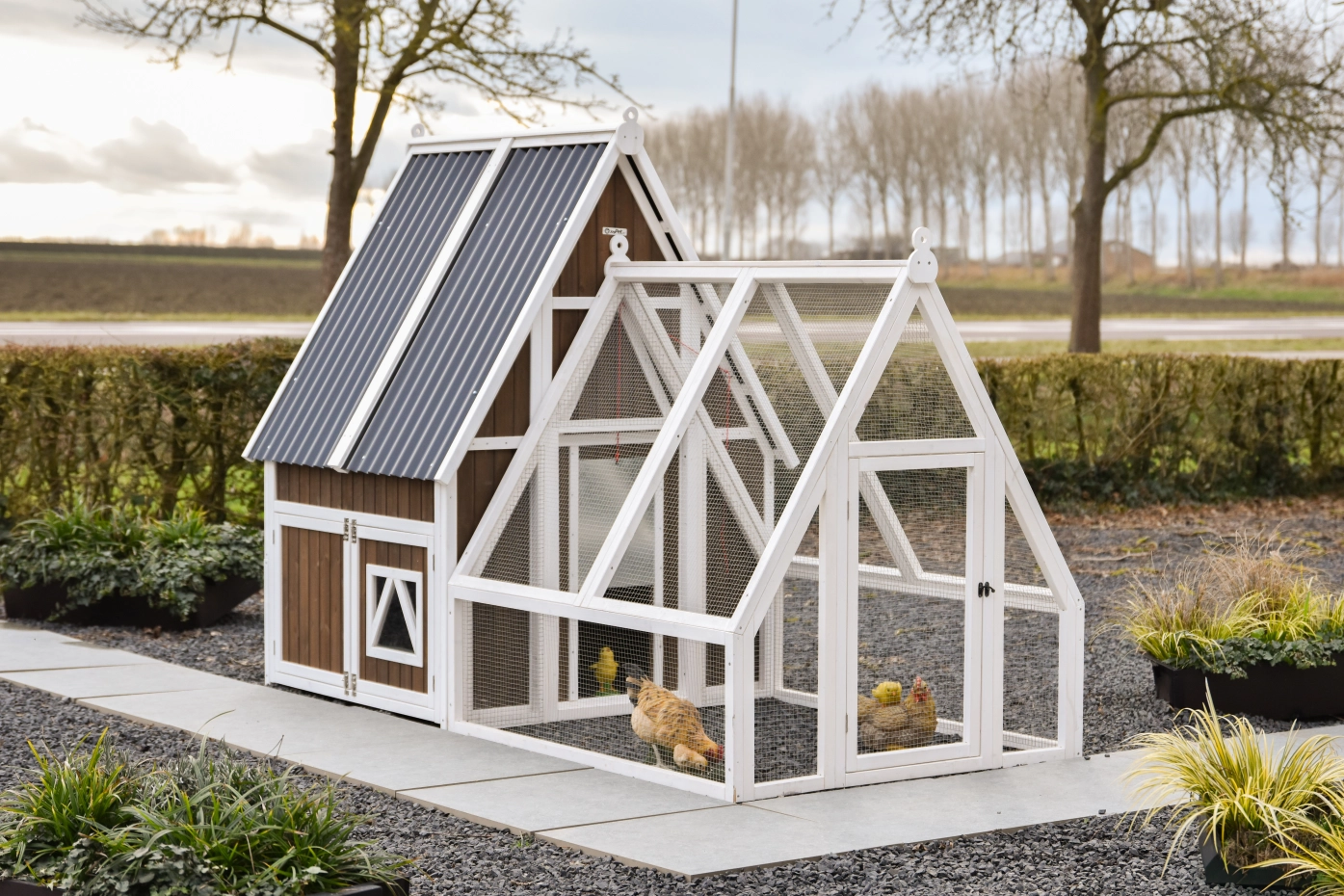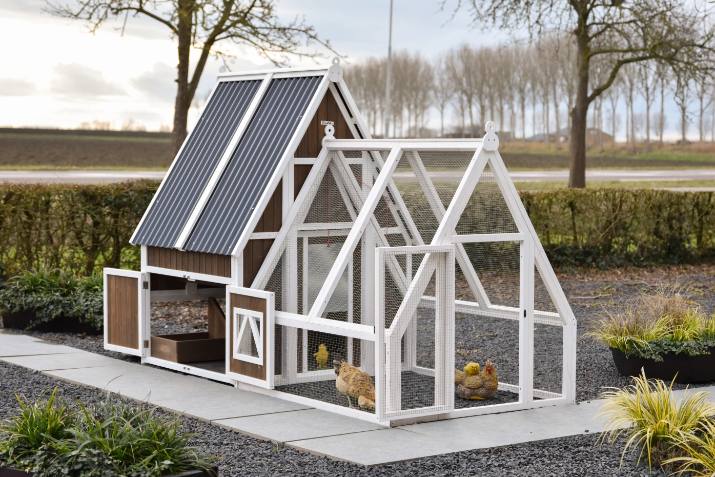 Het hok is afsluitbaar met een aluminium schuifluik dat soepel te bedienen is met een touwtje, waardoor je de kippen veilig kunt opsluiten. Het dak van kunststof golfplaten beschermt het hok goed tegen regen en andere weersinvloeden.