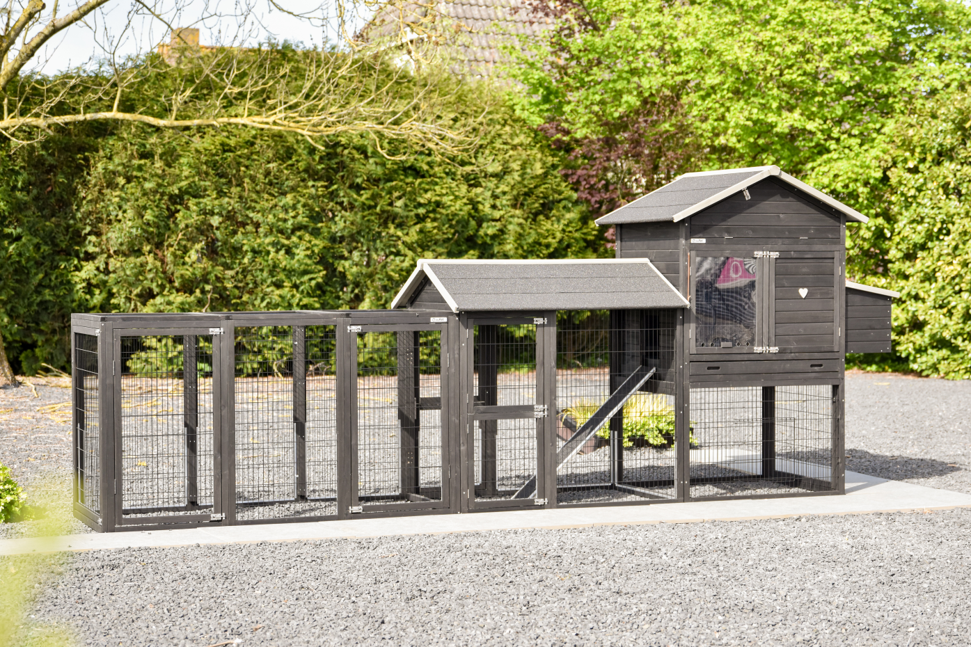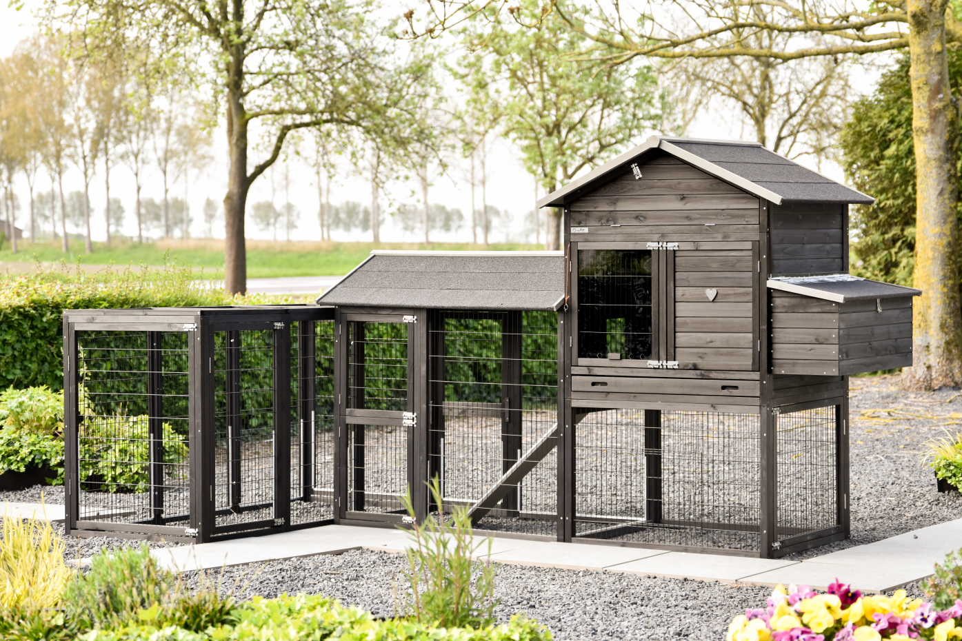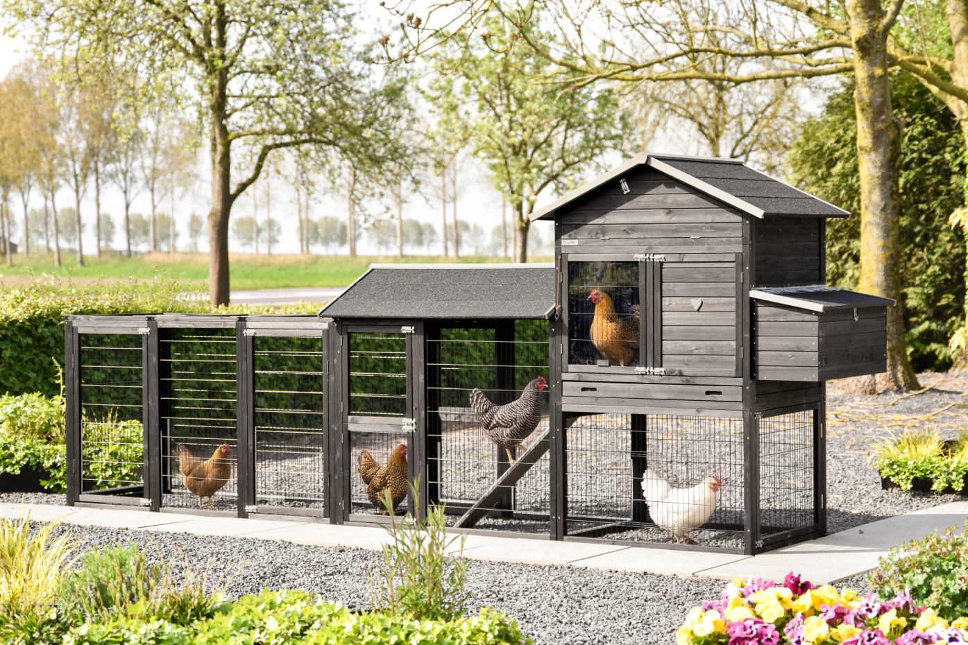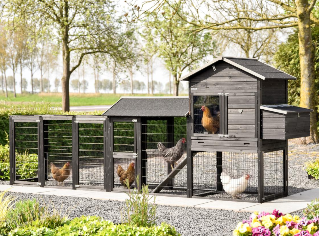 Een ruim en praktisch kippenhok waarin uw kippen zich direct thuis voelen. Het royale nachthok en het handige legnest zorgen voor comfort en gemak, terwijl de grote deuren het onderhoud eenvoudig maken. Aan het hok zijn 2 aanbouwrennen bevestigd, één met dakleer dak en één met traliedak, zodat uw kippen beschut én in de buitenlucht kunnen verblijven. Dankzij de rubberen poten is het hok beschermd tegen optrekkend vocht. Bovendien is het Kippenhok Prestige Large met legnest eenvoudig uit te breiden met aanbouwrennen voor extra ruimte.