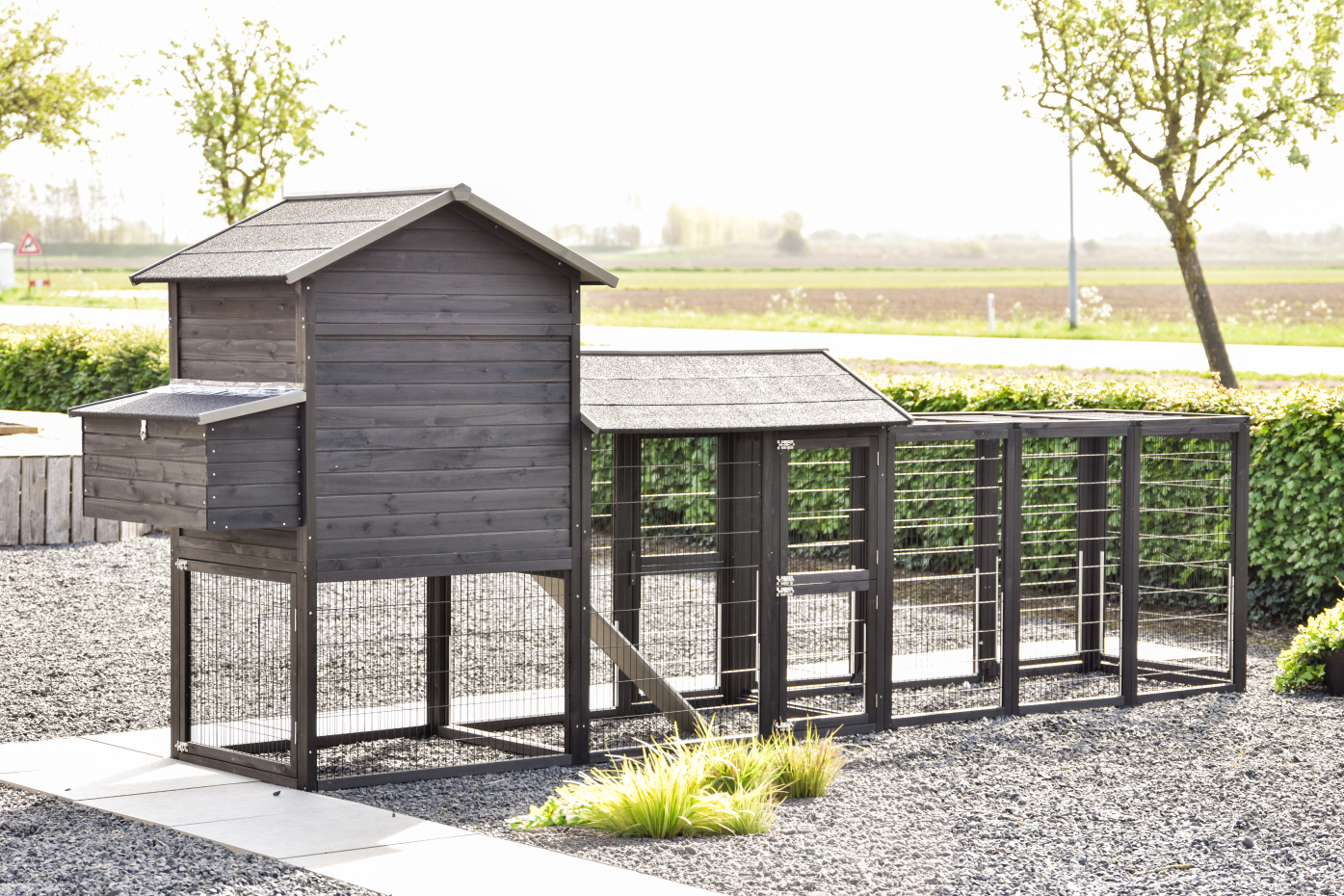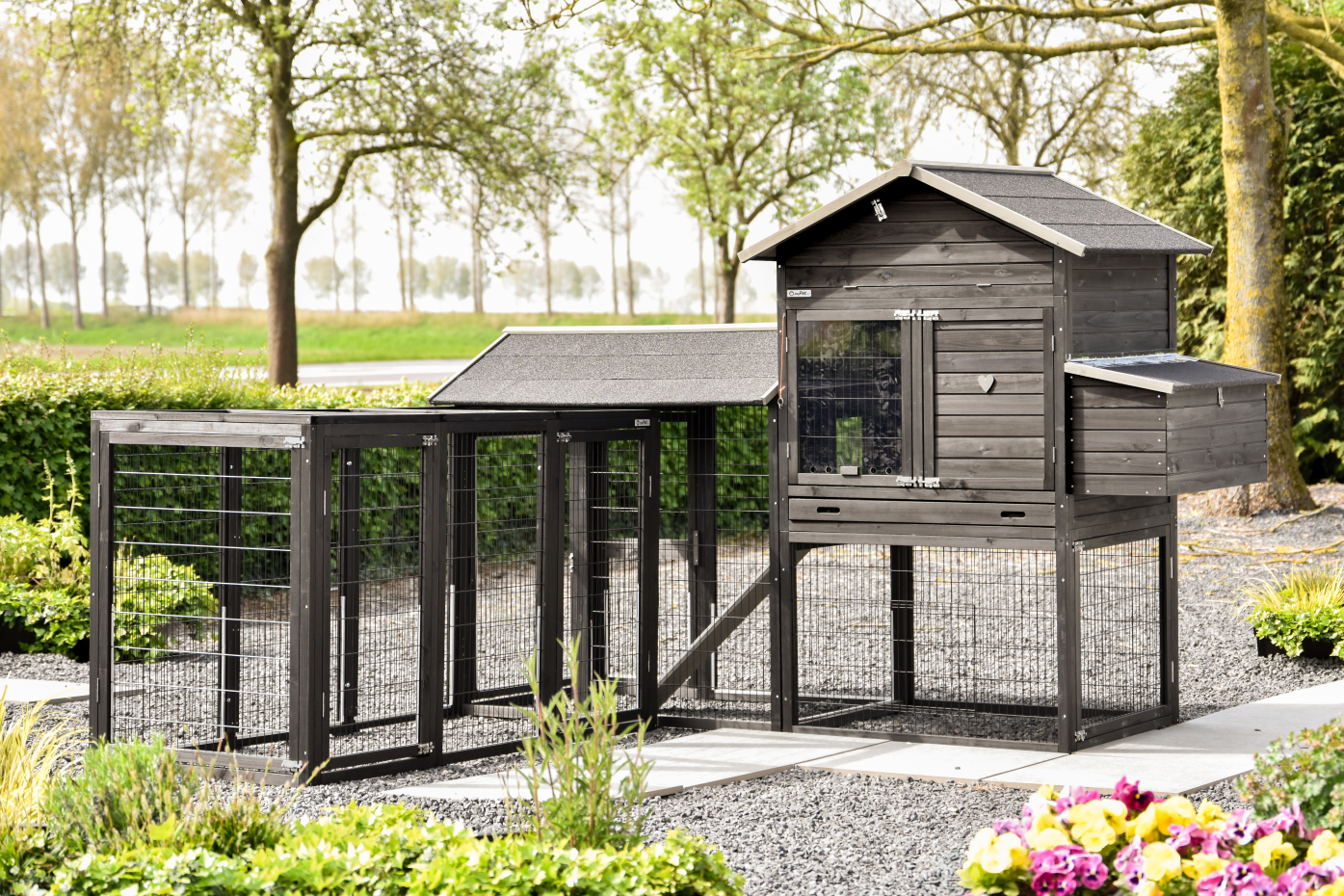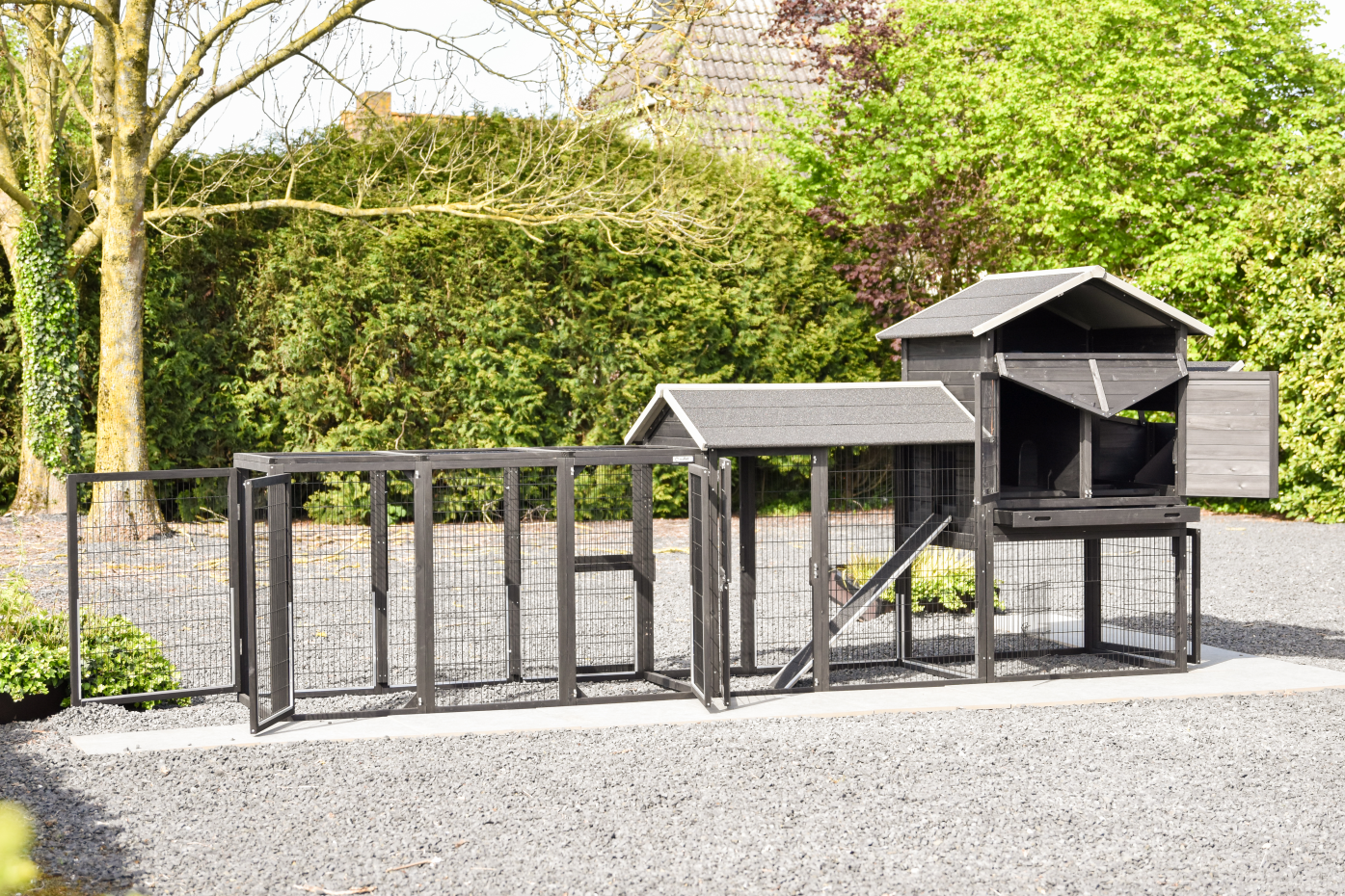 Een ruim en praktisch kippenhok waarin uw kippen zich direct thuis voelen. Het royale nachthok en het handige legnest zorgen voor comfort en gemak, terwijl de grote deuren het onderhoud eenvoudig maken. Aan het hok zijn 2 aanbouwrennen bevestigd, één met dakleer dak en één met traliedak, zodat uw kippen beschut én in de buitenlucht kunnen verblijven. Dankzij de rubberen poten is het hok beschermd tegen optrekkend vocht. Bovendien is het Kippenhok Prestige Large met legnest eenvoudig uit te breiden met aanbouwrennen voor extra ruimte.