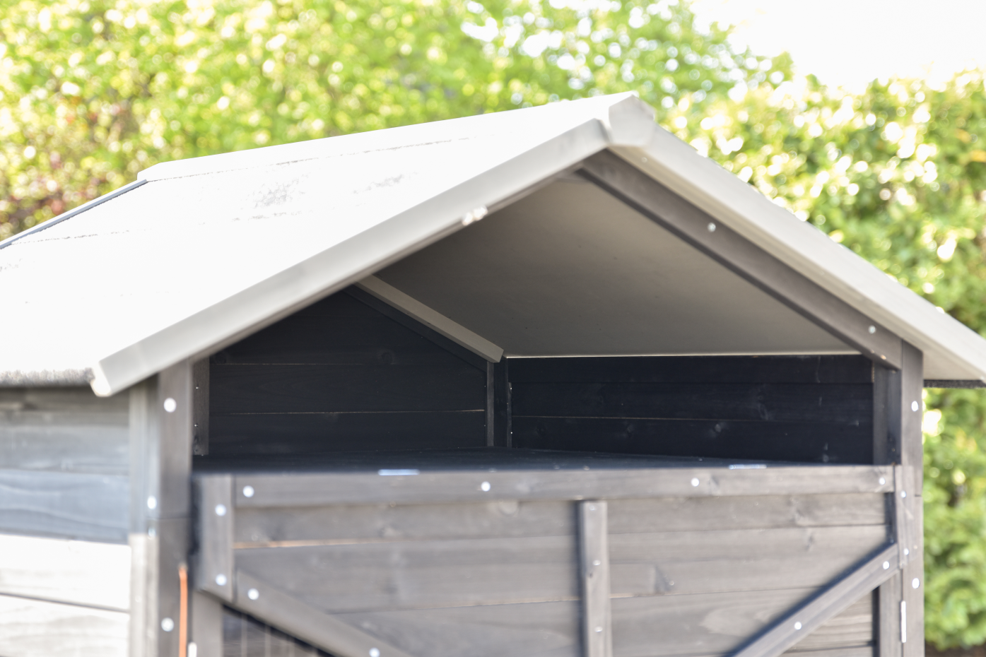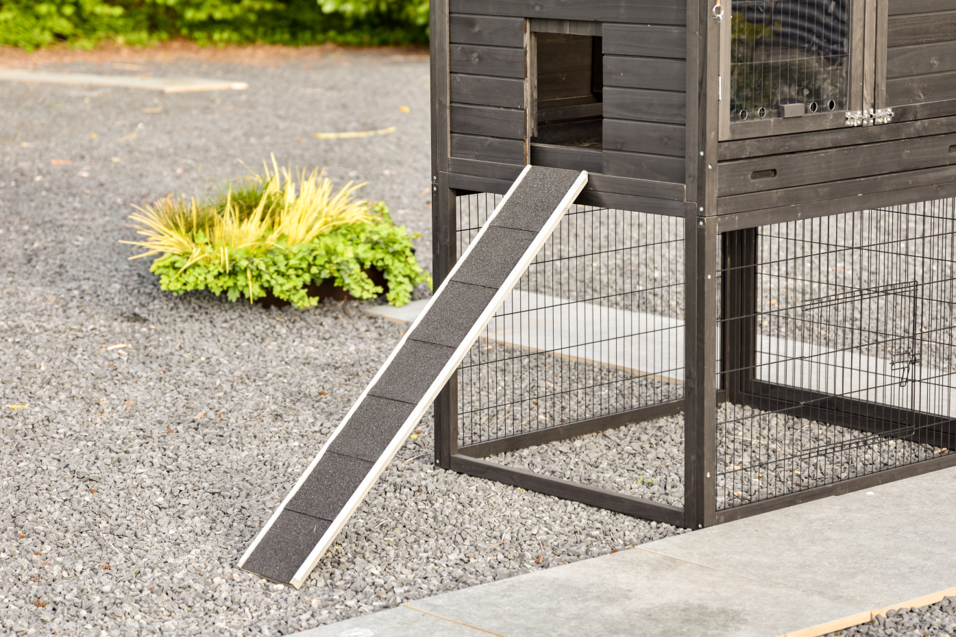- Wanneer het hok niet op een beschutte plaats staat, dan adviseren wij om het te verankeren