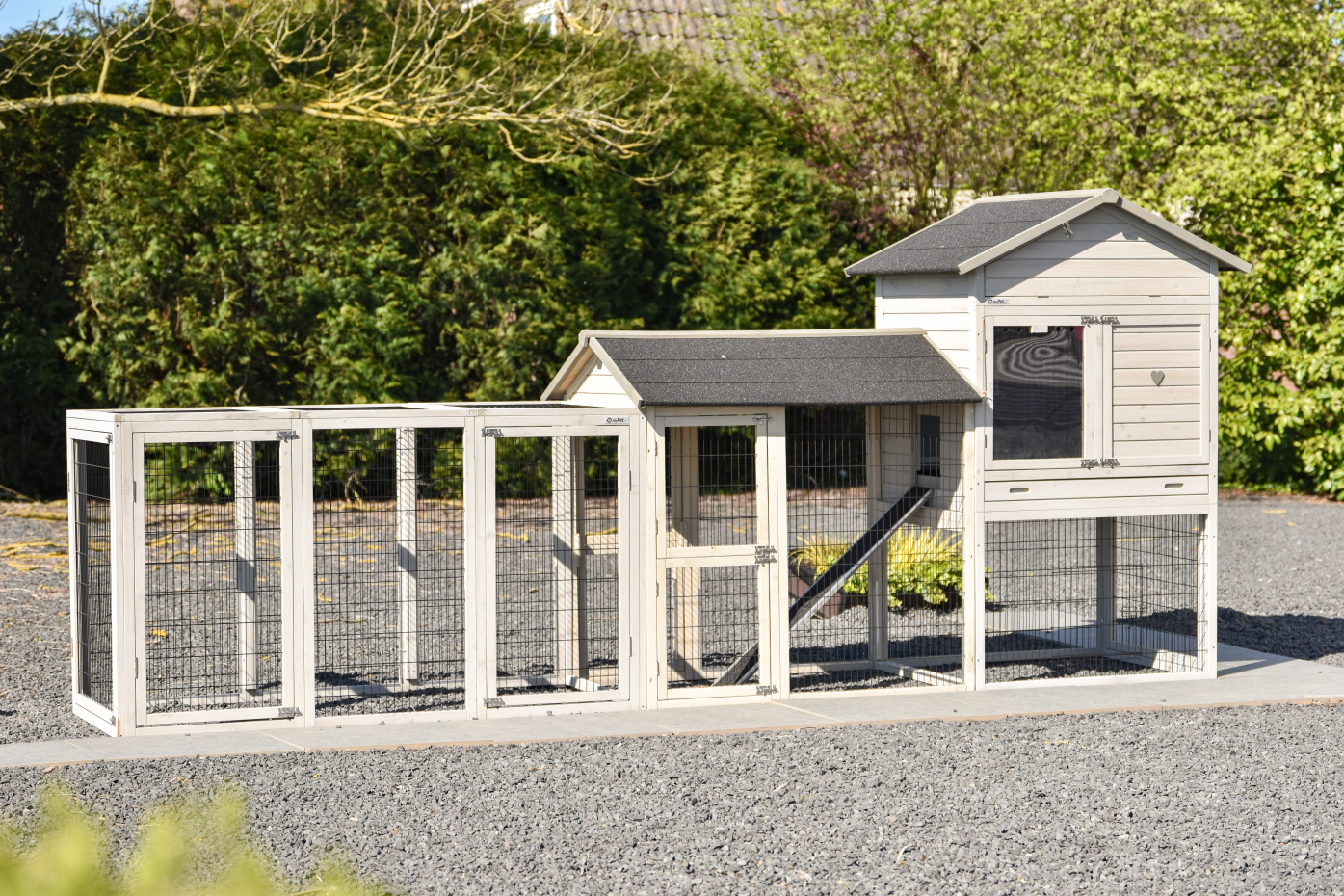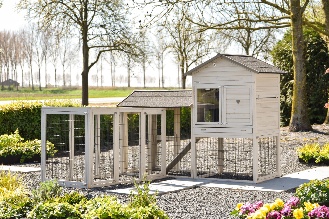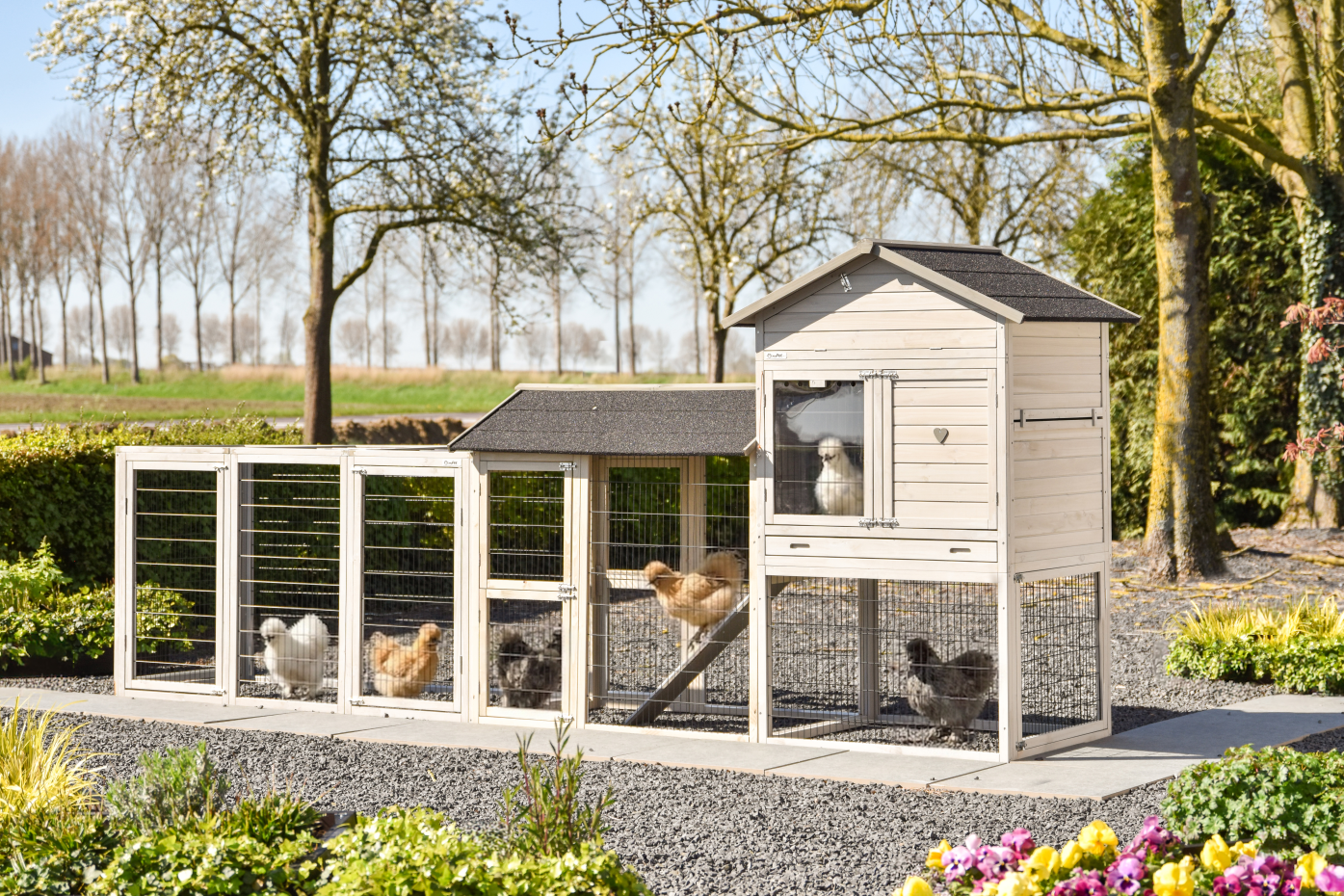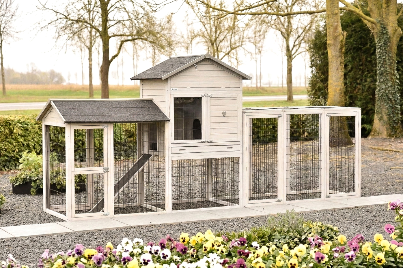 Een ruim en praktisch kippenhok waarin uw kippen zich direct thuis voelen. Het royale nachthok zorgt voor comfort en rust, terwijl de grote deuren het onderhoud eenvoudig maken. Het hok is voorzien van twee aanbouwrennen: één met een dakleer dak en één met een traliedak, zodat uw kippen zowel beschut als in de buitenlucht kunnen verblijven. Dankzij de rubberen poten is het hok beschermd tegen optrekkend vocht. Bovendien is het Kippenhok Prestige Large eenvoudig uit te breiden met extra aanbouwrennen voor nog meer ruimte.