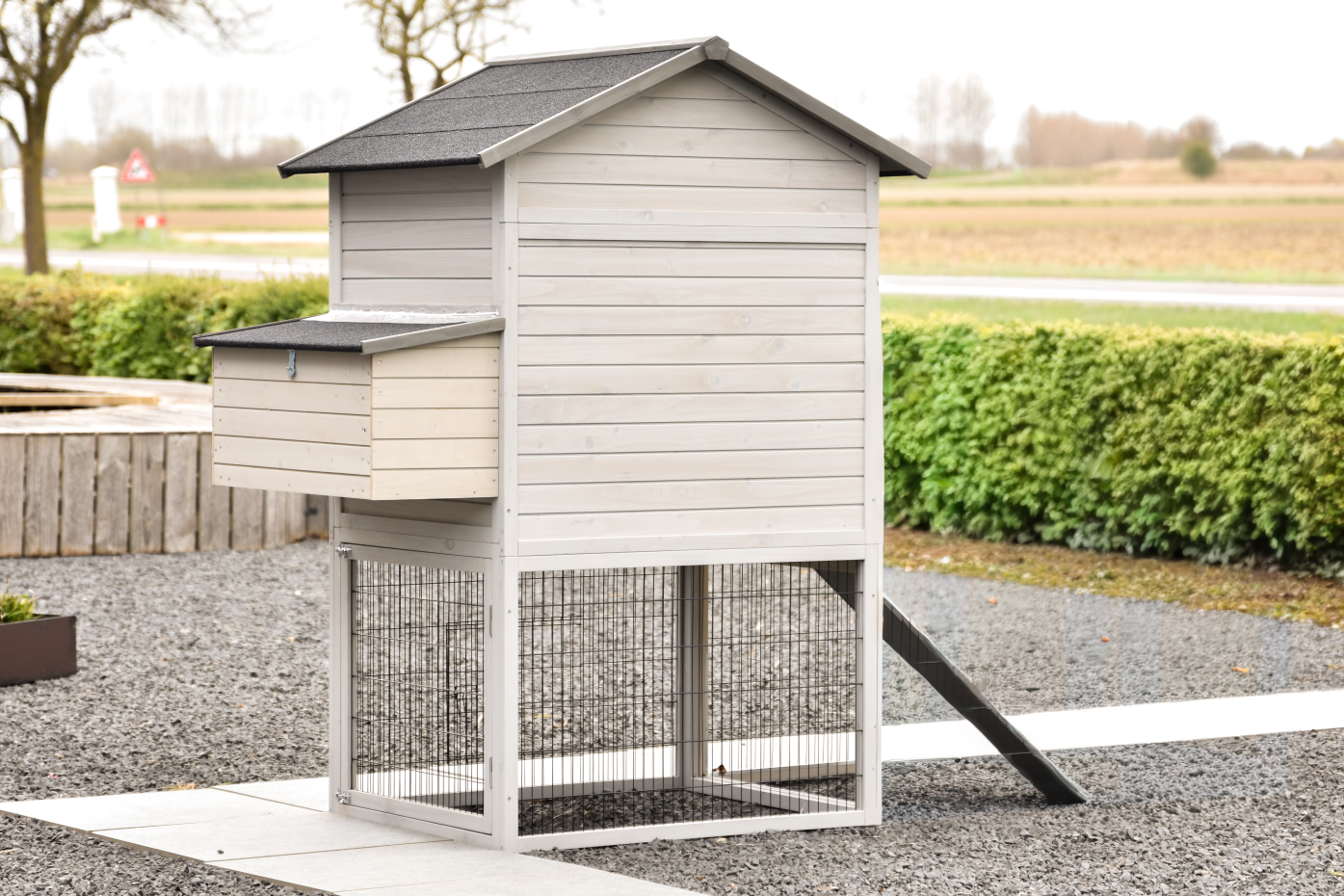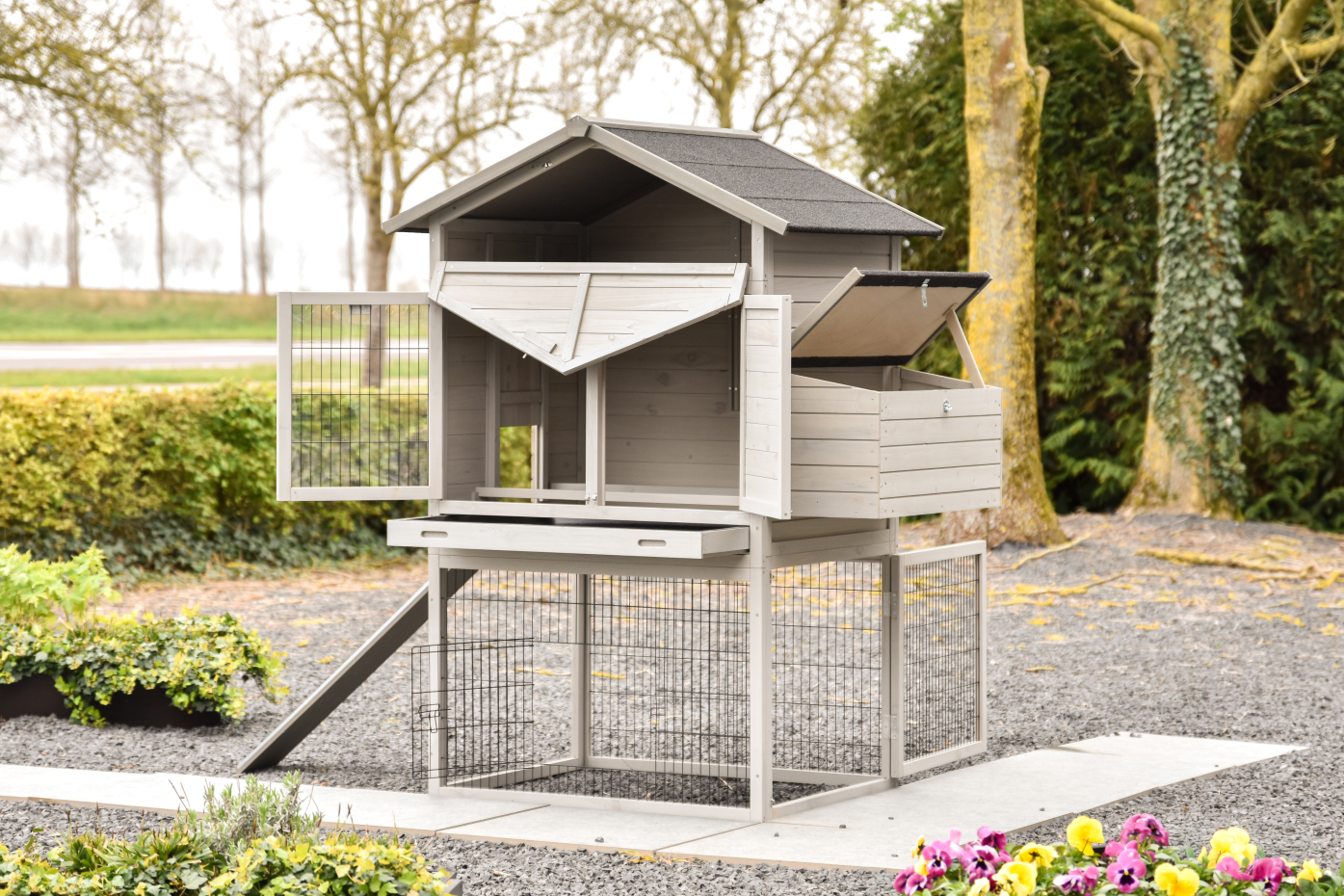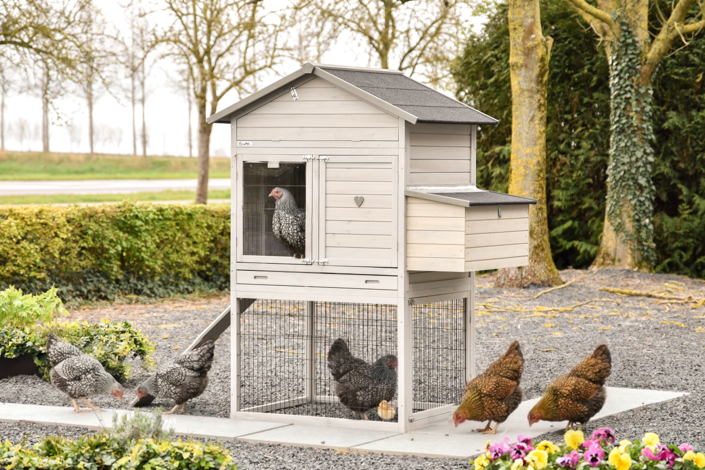 Dankzij de rubberen poten is het hok beschermd tegen optrekkend vocht. Bovendien is het Kippenhok Prestige Large met legnest eenvoudig uit te breiden met aanbouwrennen voor extra ruimte.