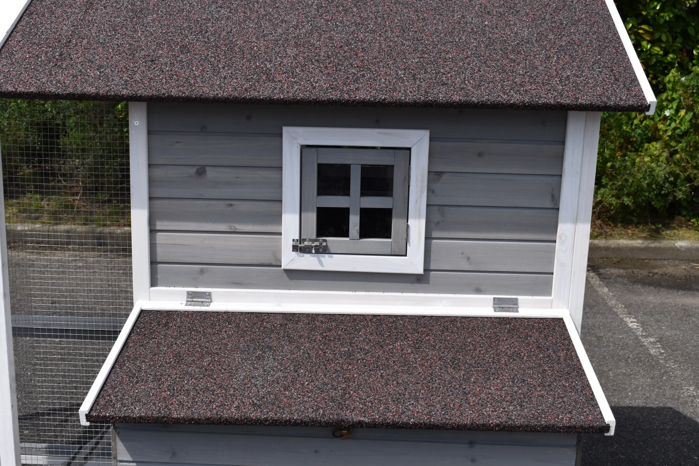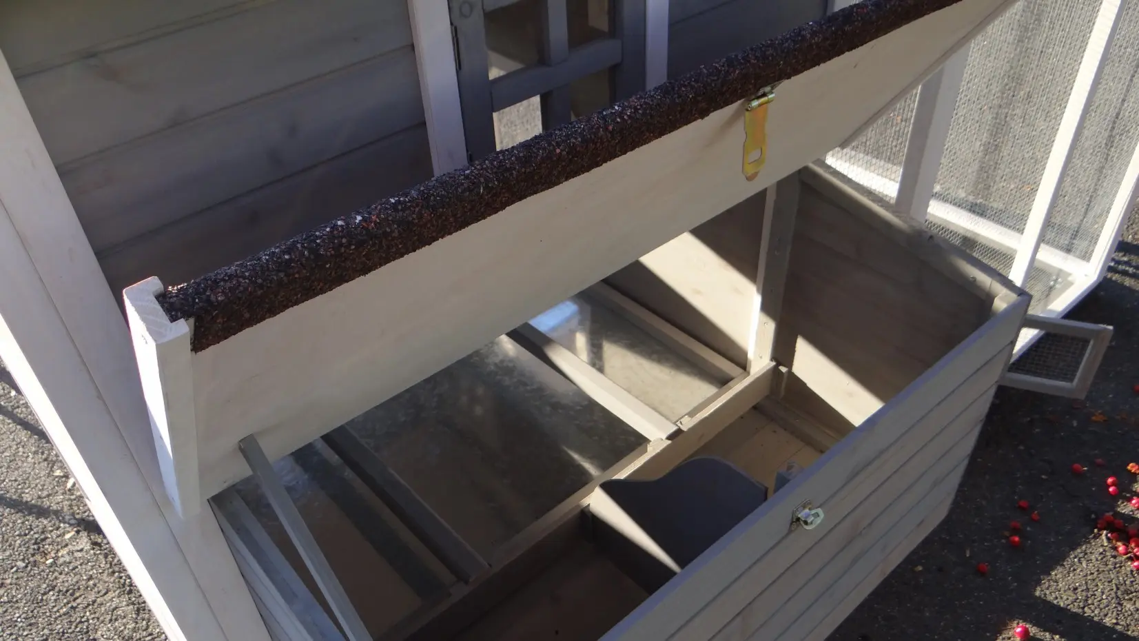 - Het hok heeft een dak met dakleer