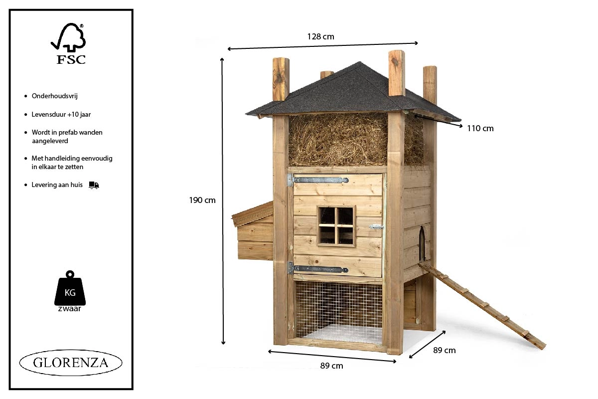 Hooiberg Sem is een fijn kippennachthok met een vast legnest welke beschikt over een openklapbaar dakje. Zo kun je eenvoudig de eieren rapen zonder het nachthok zelf te openen. Het nachthok is wat hoger geplaatst op pootjes om kou en optrekkend vocht tegen te gaan. Het trapje wat meegeleverd wordt zorgt ervoor dat de kippen het nachthok kunnen betreden. De bodem van het nachthok is gemaakt van betonplex, hierdoor is het snel en makkelijk schoon te maken. In het nachthok is een zitstok bevestigd zodat de kippen op stok kunnen overnachten. Kippen hooiberg Sem wordt op afspraak in gemonteerde panelen bij u thuis bezorgd. Het monteren is eenvoudig te doen met de handleiding welke u per e-mail toegestuurd krijgt.