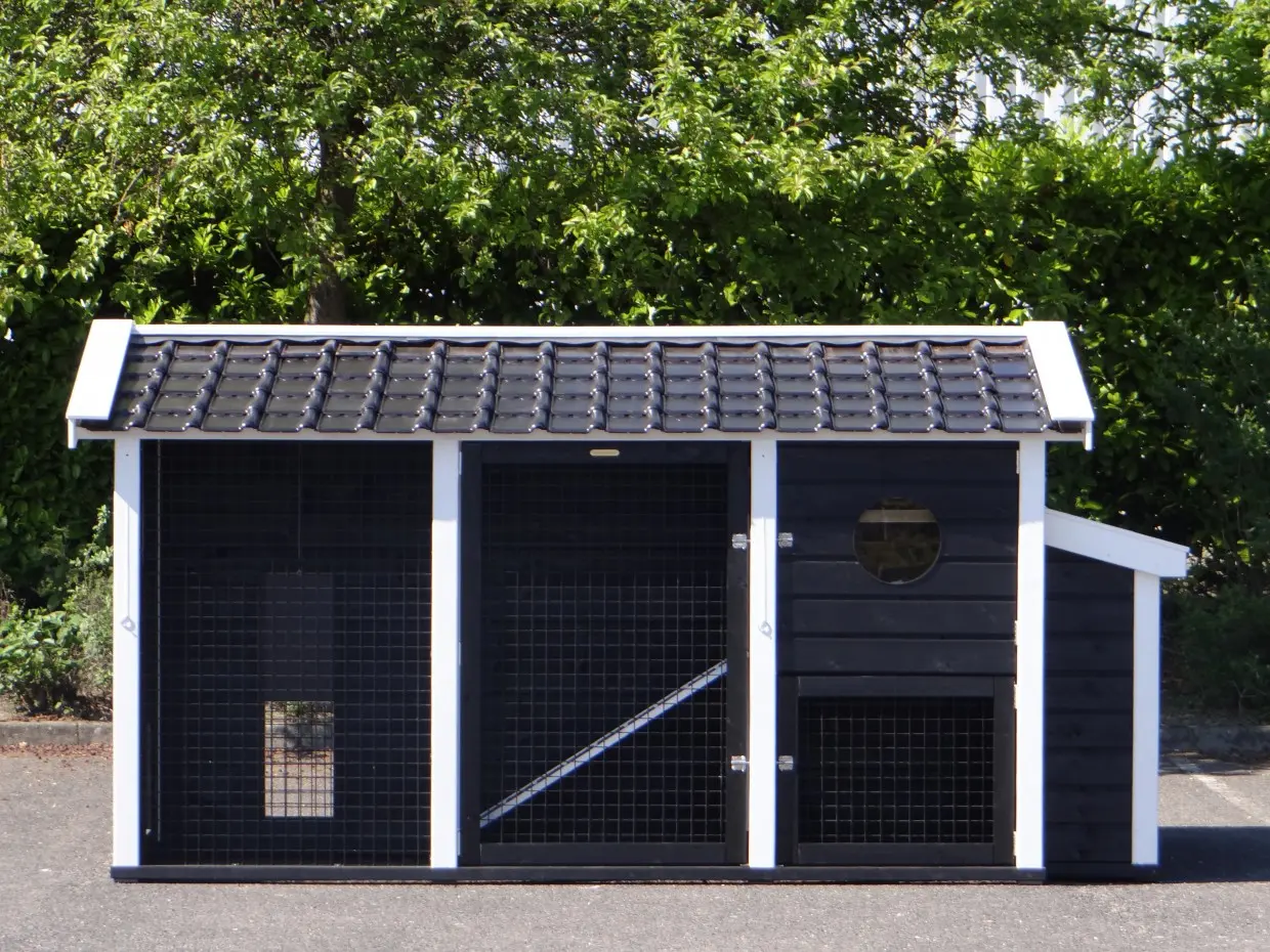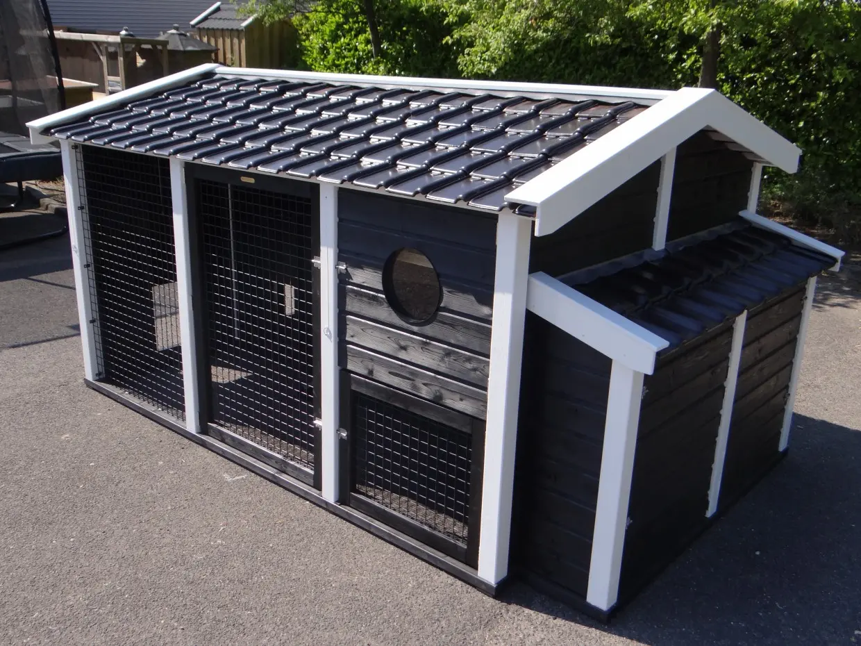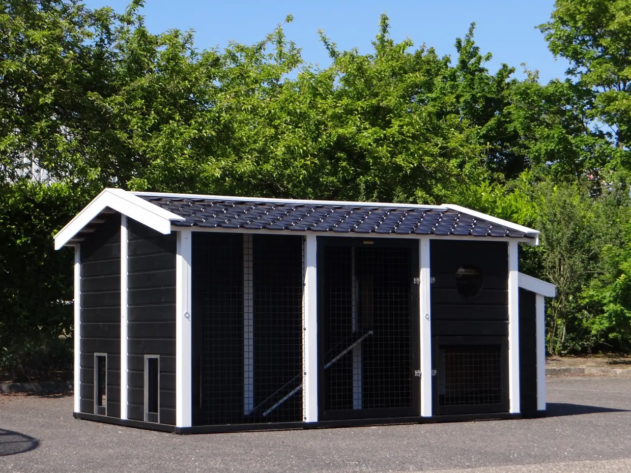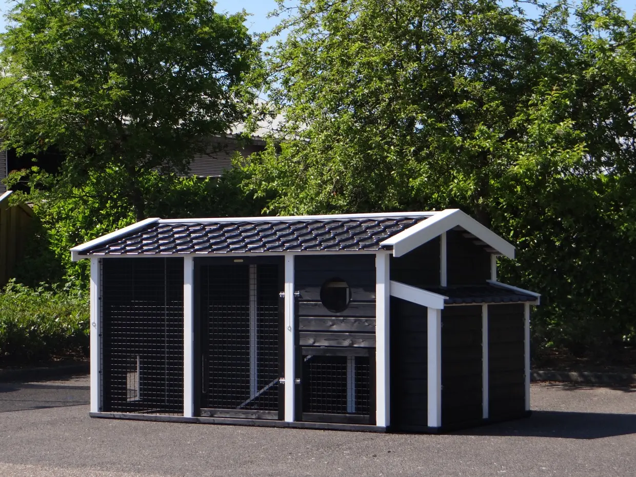 Dit dubbele Kippenhok Supreme+ zwart/wit is een absolute topper. De afwerking van dit kippenhok is zeer hoogwaardig. Het dak van het kippenhok is voorzien van prachtige, zwart geglazuurde dakpannen. Dat geeft een zeer chique uitstraling. Dit zeer grote kippenhok is voorzien van 2 nachthokken met legnest en 2 kippenrennen. De 2 kippenrennen zijn onderling te verbinden, of af te scheiden, door het schuifluikje in de tussenwand. Kippenhok Supreme+ is van alle gemakken voorzien. De + houdt in dat het hok een luikje heeft voor vrije uitloop voor de kippen.