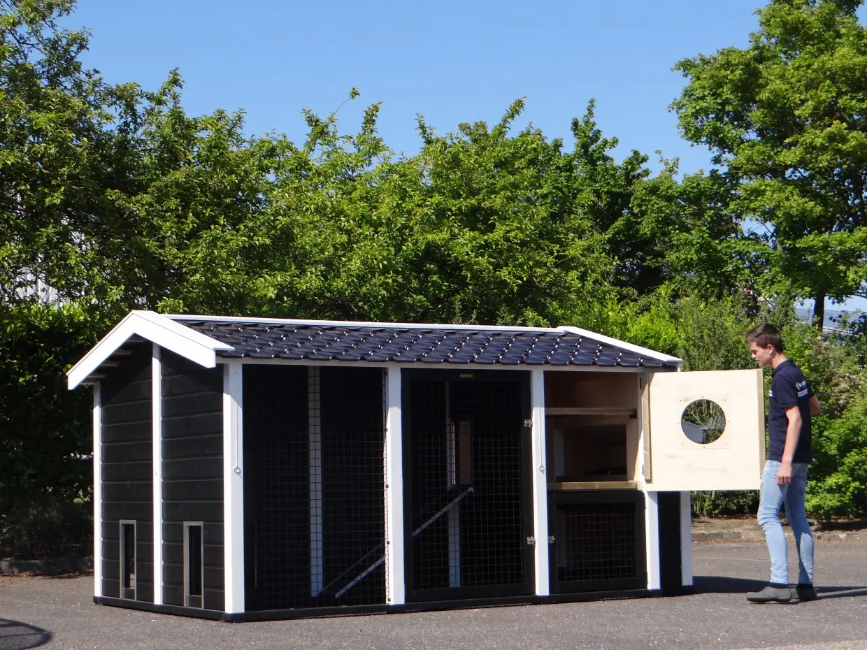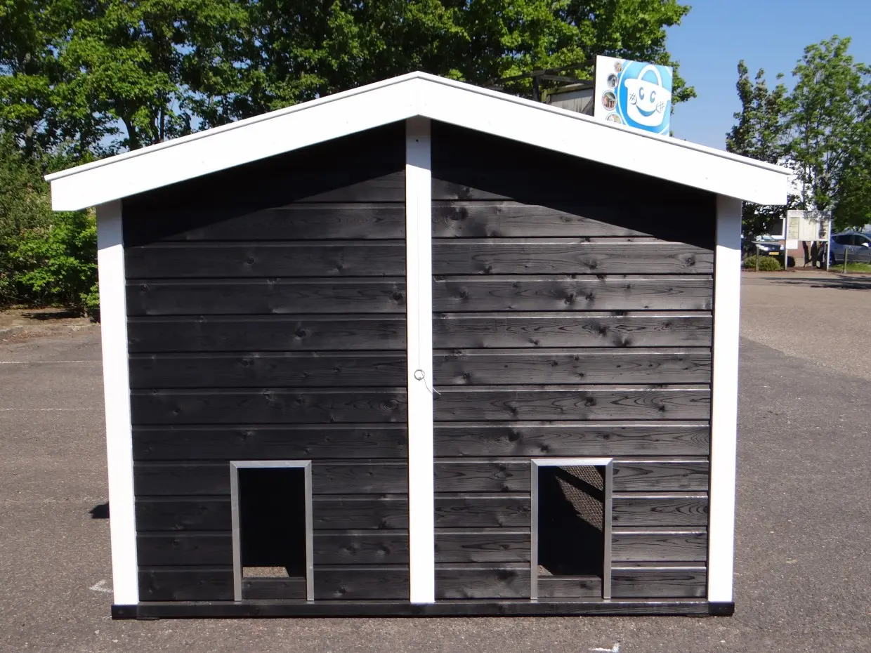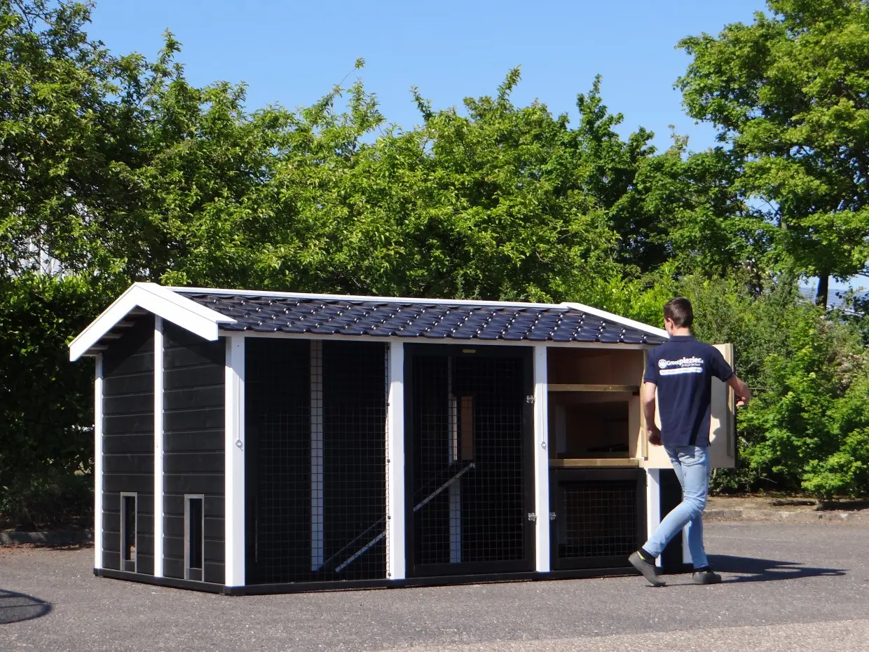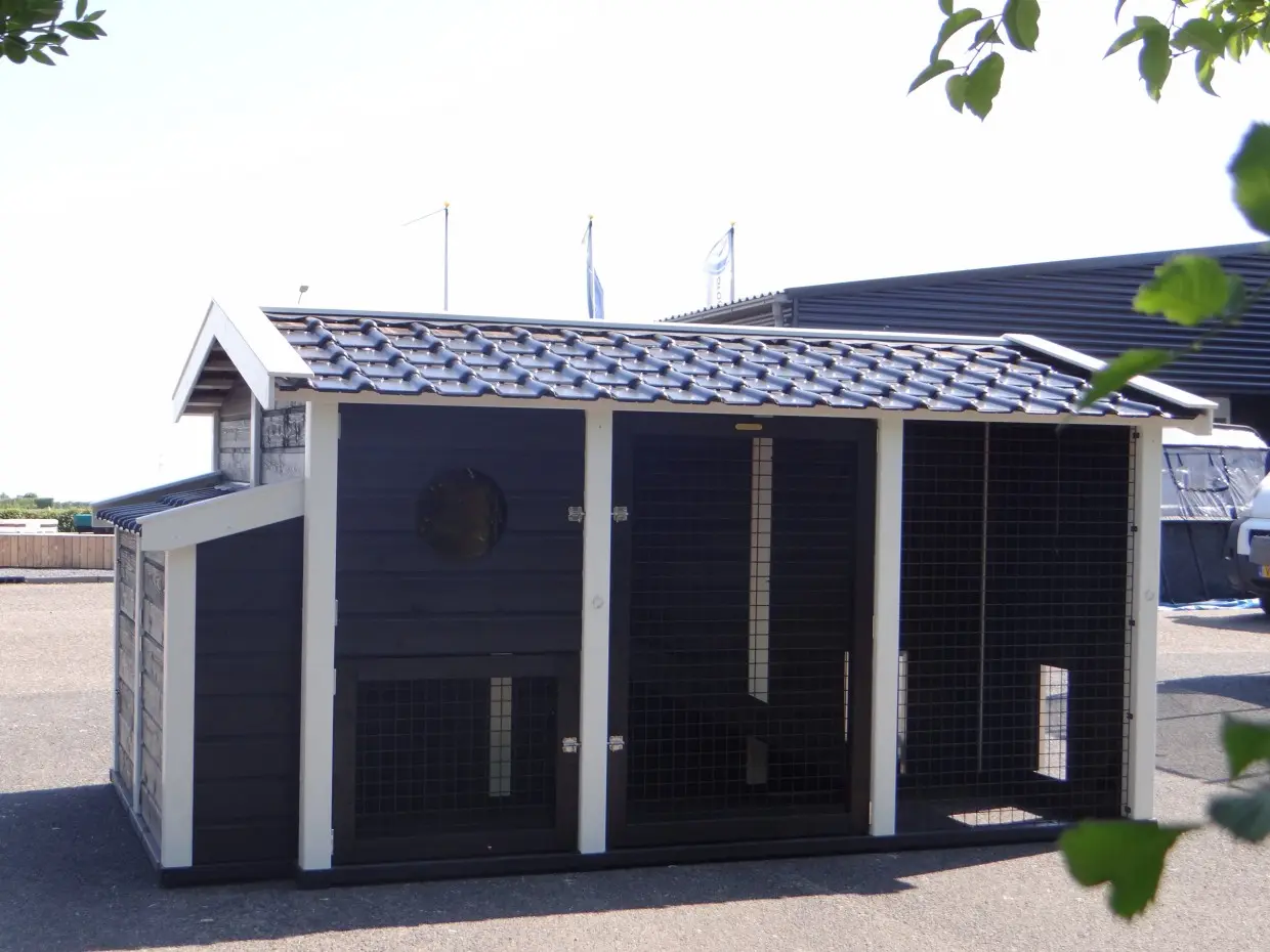 Dit dubbele Kippenhok Supreme+ zwart/wit is een absolute topper. De afwerking van dit kippenhok is zeer hoogwaardig. Het dak van het kippenhok is voorzien van prachtige, zwart geglazuurde dakpannen. Dat geeft een zeer chique uitstraling. Dit zeer grote kippenhok is voorzien van 2 nachthokken met legnest en 2 kippenrennen. De 2 kippenrennen zijn onderling te verbinden, of af te scheiden, door het schuifluikje in de tussenwand. Kippenhok Supreme+ is van alle gemakken voorzien. De + houdt in dat het hok een luikje heeft voor vrije uitloop voor de kippen.
