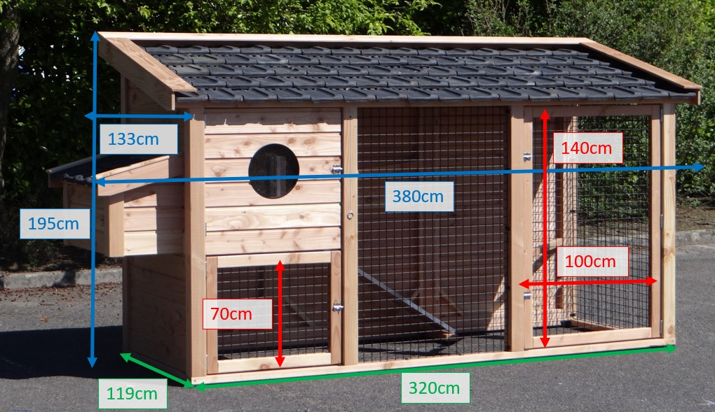 Buitenwerkse afmetingen incl. dak en nestkast (BxDxH) 380x130x195cm