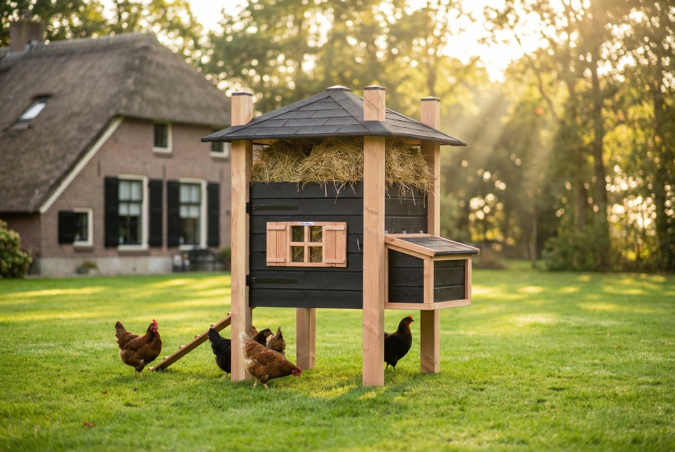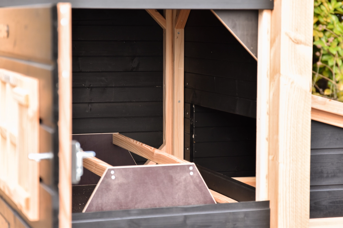 Kippenhok Hooiberg Sjors met legnest heeft een landelijke uitstraling. Dit royale kippenhok past perfect in een landelijke tuin of op de boerderij. Dankzij de ruime afmetingen is er voldoende plek voor meerdere kippen. Via de grote deur kun je het hok eenvoudig betreden voor verzorging en schoonmaak. Binnenin bevindt zich stevige zitstokken, zodat je kippen comfortabel kunnen rusten. De bodem is gemaakt van beton-multiplex, wat het hok extra sterk, onderhoudsvriendelijk en bestand tegen intensief gebruik maakt.
