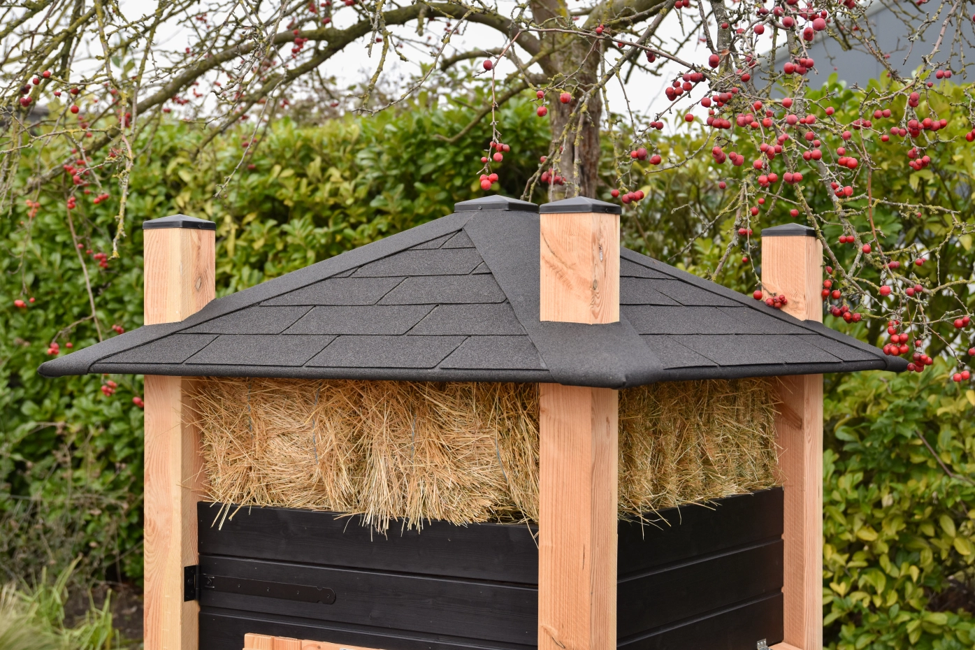 - Het dak is gemaakt van underlayment en bekleed met dakshingles/dakleer