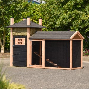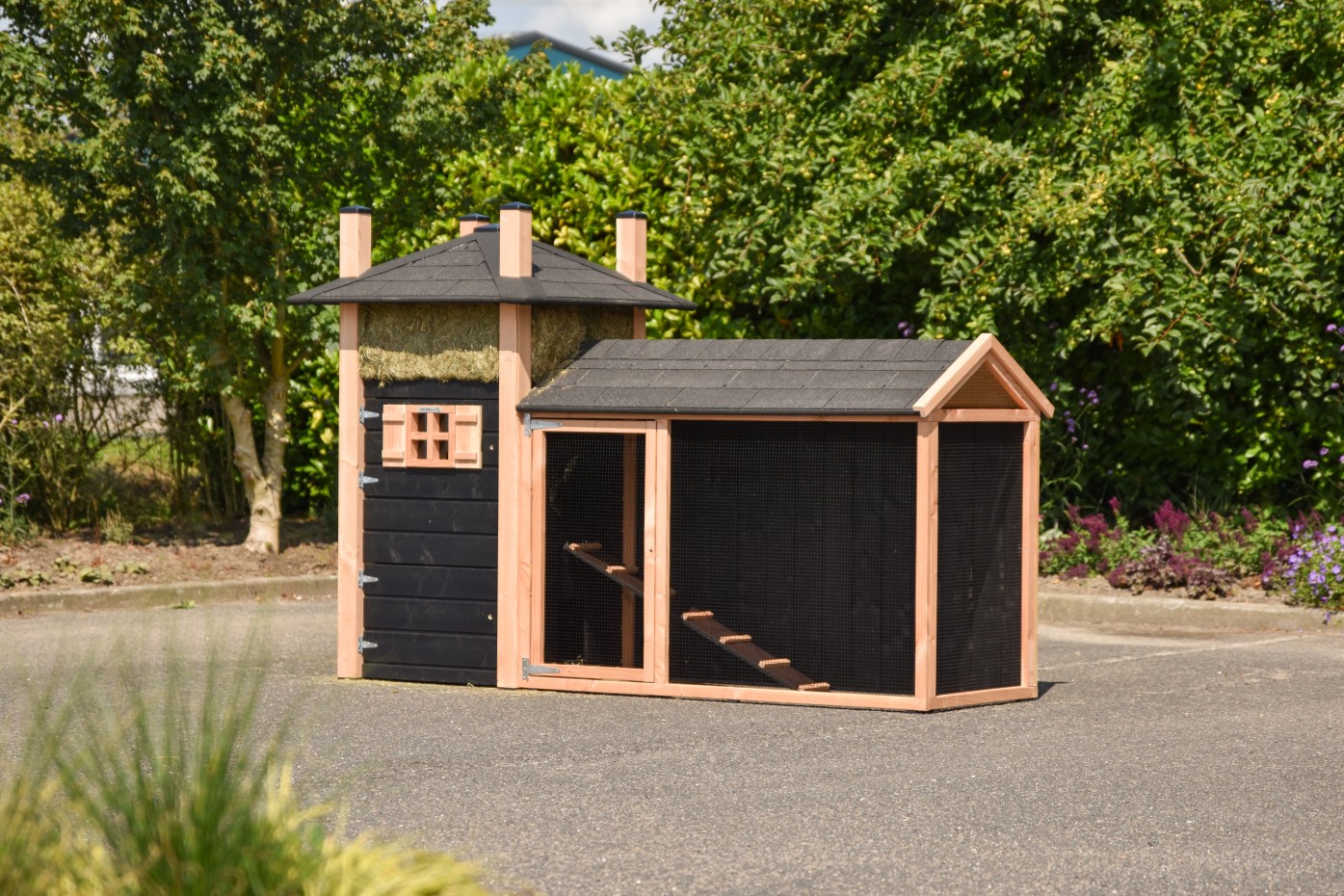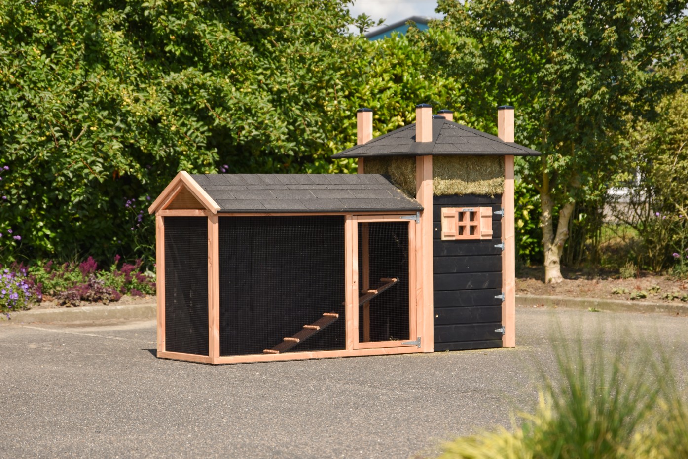 Dit combi hok is vormgegeven als een charmante hooiberg de kleuren zwart en douglashout zorgen voor een chique uitstraling, waardoor het een sfeervolle blikvanger in de tuin is. De dichte achterkant geeft kippen en konijnen een beschutte, rustige plek. Kippen bereiken via de loopplank het bovenhok, terwijl konijnen beneden hun eigen comfortabele ruimte hebben. De grote deuren maken het verblijf eenvoudig bereikbaar en goed schoon te houden. Een praktisch en stijlvol hok waar uw dieren zich direct prettig voelen.