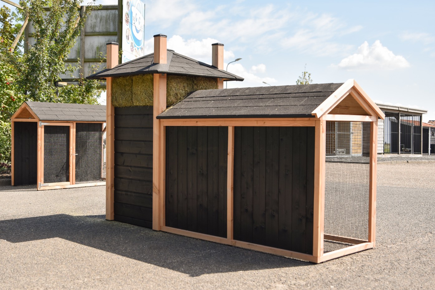 - De wanden zijn helemaal kant en klaar. Planken zitten erop gespijkerd, deuren zijn afgehangen en voorzien van sloten, gaas is erop gespannen, enz. Hierdoor is de montage heel eenvoudig!