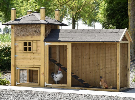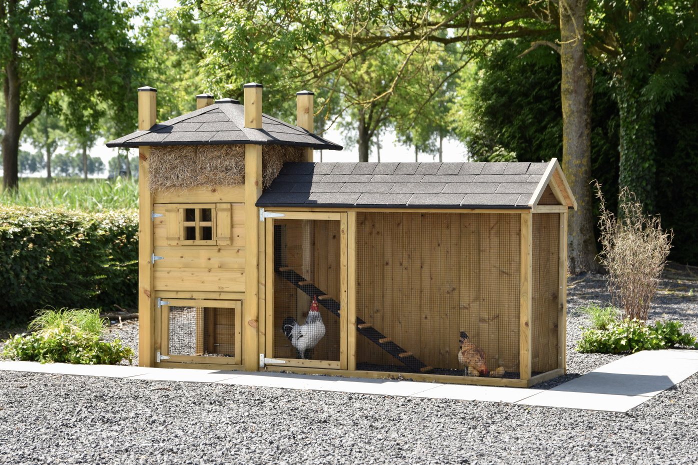 Kippenhok hooiberg Rosa met zijn shingles-dak ren is een prachtige combinatie. Doordat het dak van de ren ook van shingles is, is het een mooi geheel. Dit stukje vakwerk maakt uw tuin een stuk gezelliger en geeft u een gevoel van landelijk wonen. Aan het hok zit een ruime ren met een water dicht dak. De ruime deuropening geeft u goed ruimte om schoon te maken. Ook in het kippenhok zit een brede deur voor een gemakkelijke toegang. De ren heeft een dichte achterkant zodat de kippen lekker beschut kunnen rusten.
