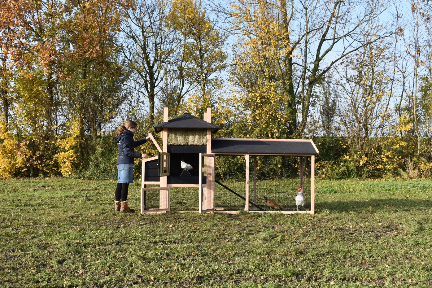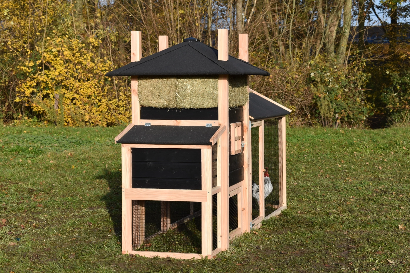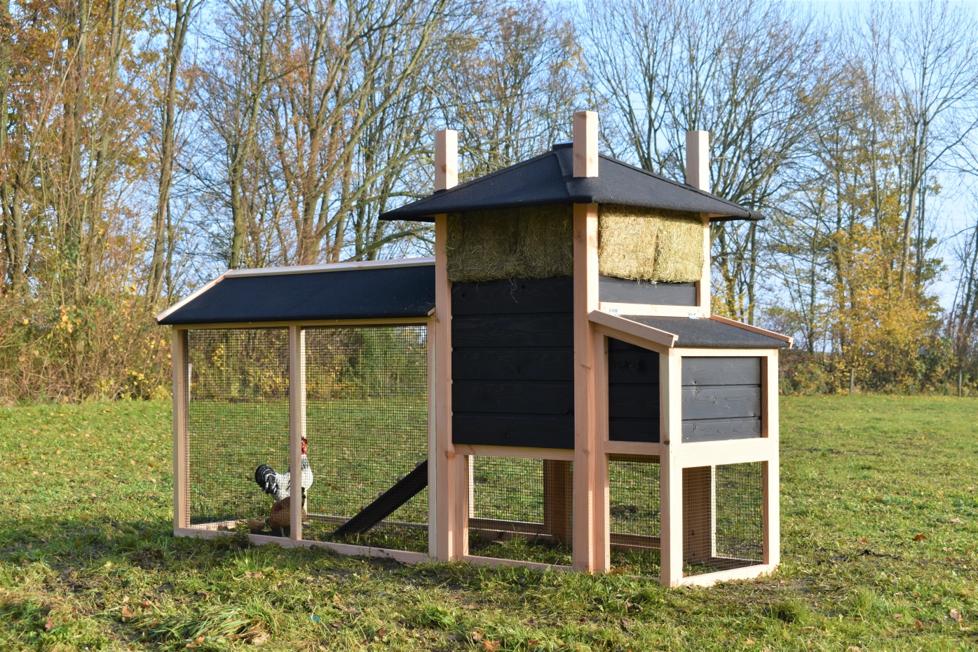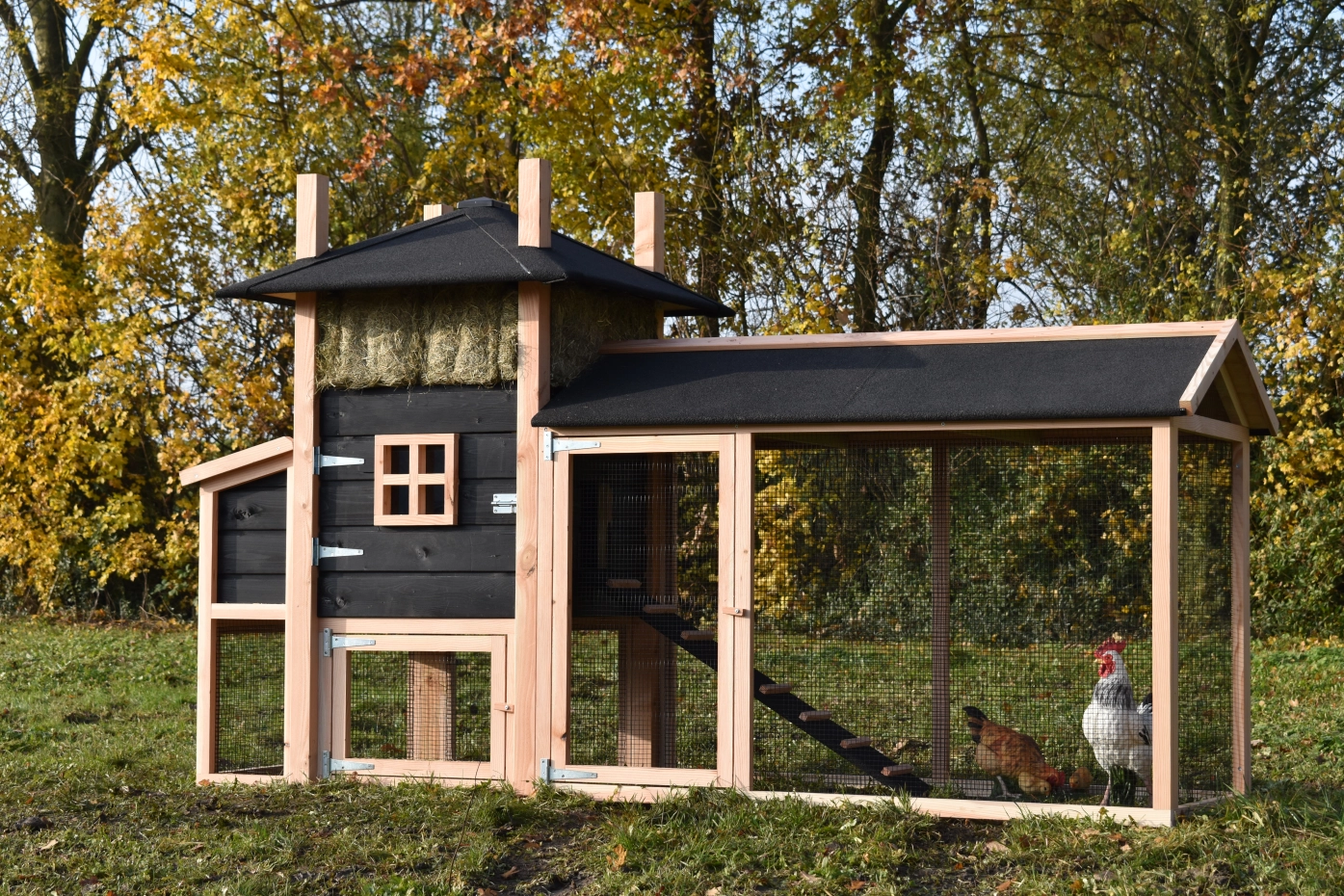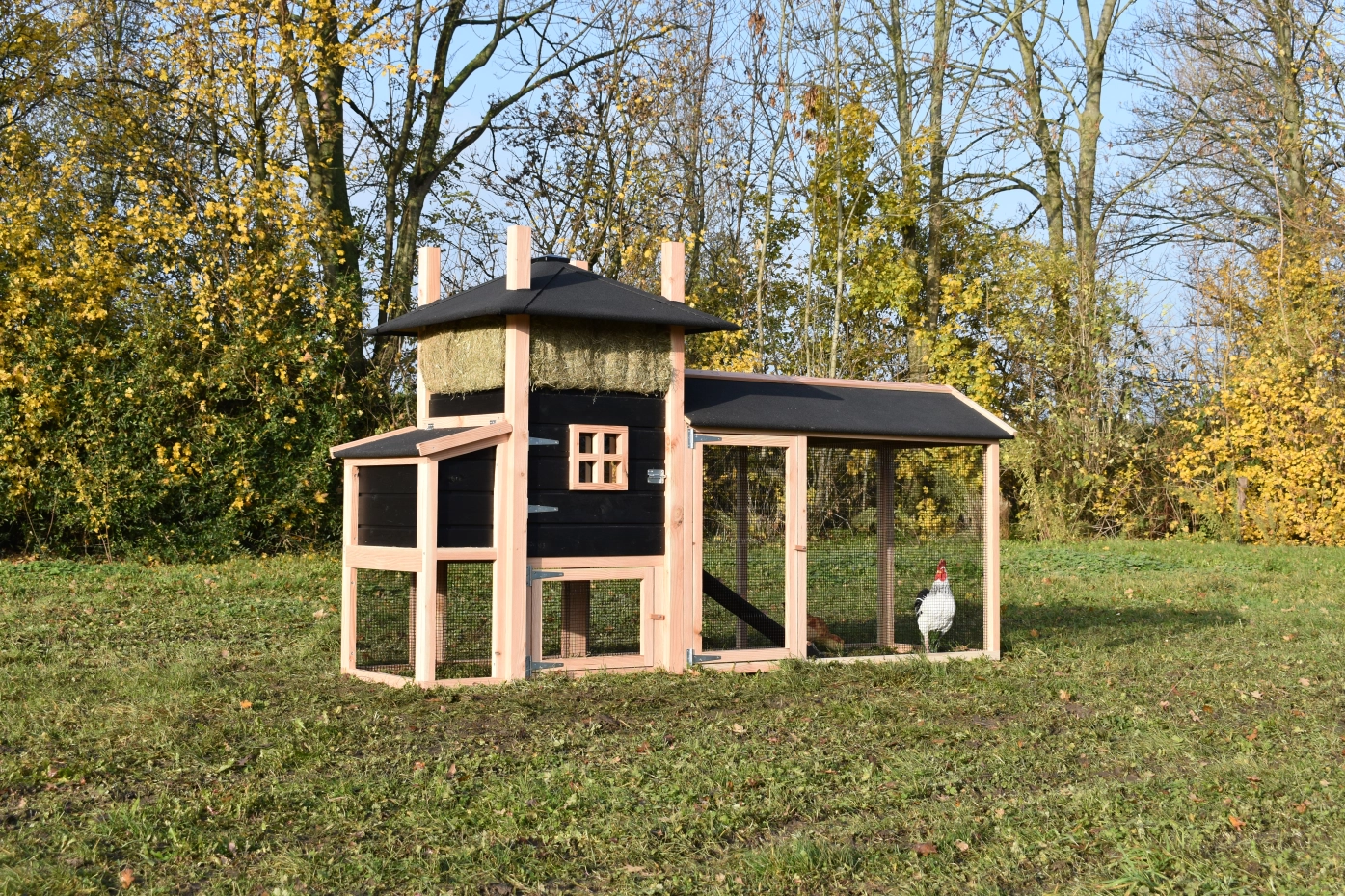 Kippenhok hooiberg Rosalynn met legnest en overdekte ren. Dit hok met legnest en overdekte ren is een prachtig paleisje voor uw kippen! Doordat de ren met dakleer is gemaakt hebben uw kippen een droog buitenverblijf en hebben ze lekker de ruimte. Met het legnest eraan hebt u ook de maximale ruimte in het nachthok. Doordat de deuren zo groot mogelijk gemaakt zijn hebt u een ruime toegang in uw hok. Pracht hok voor een betaalbare prijs!