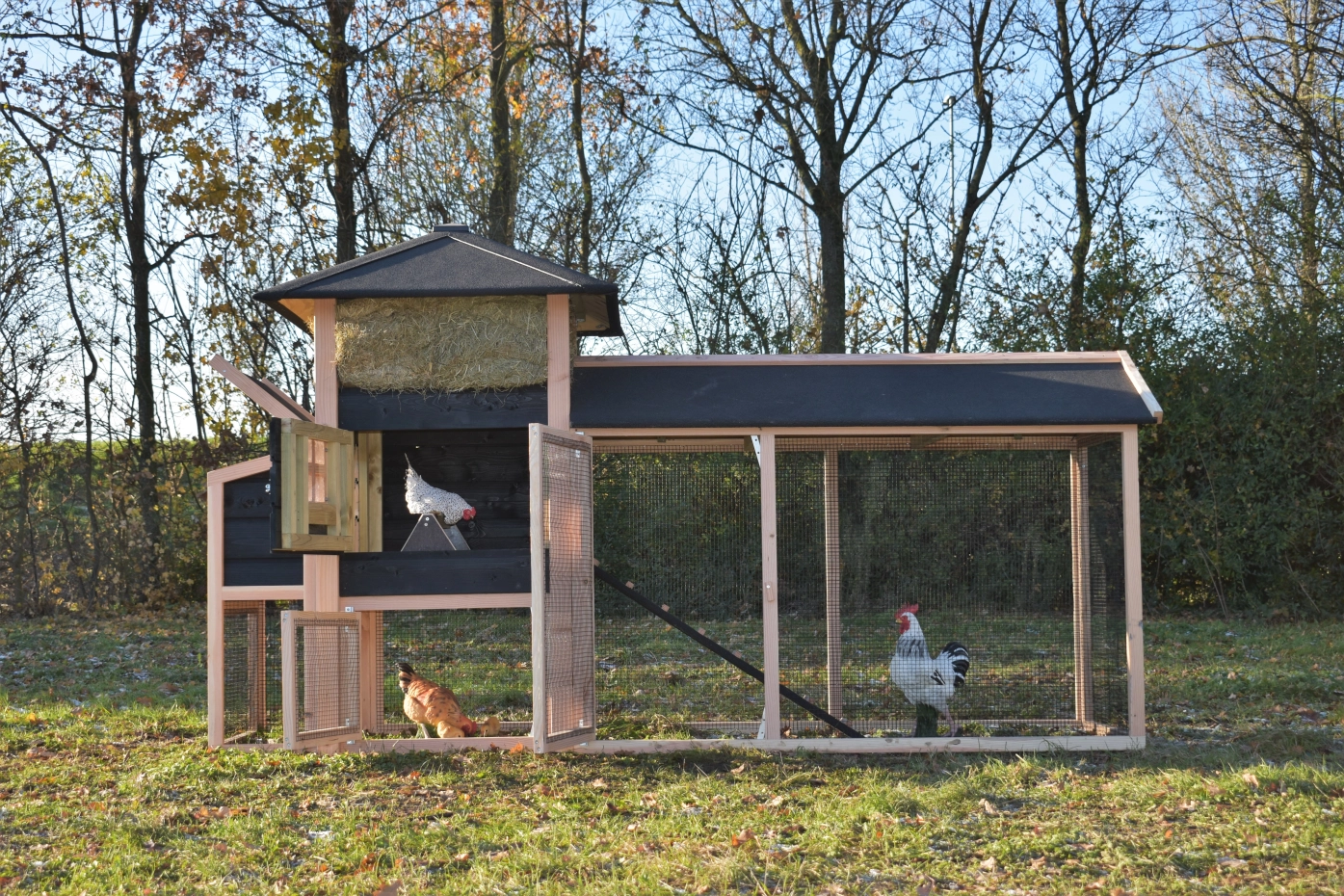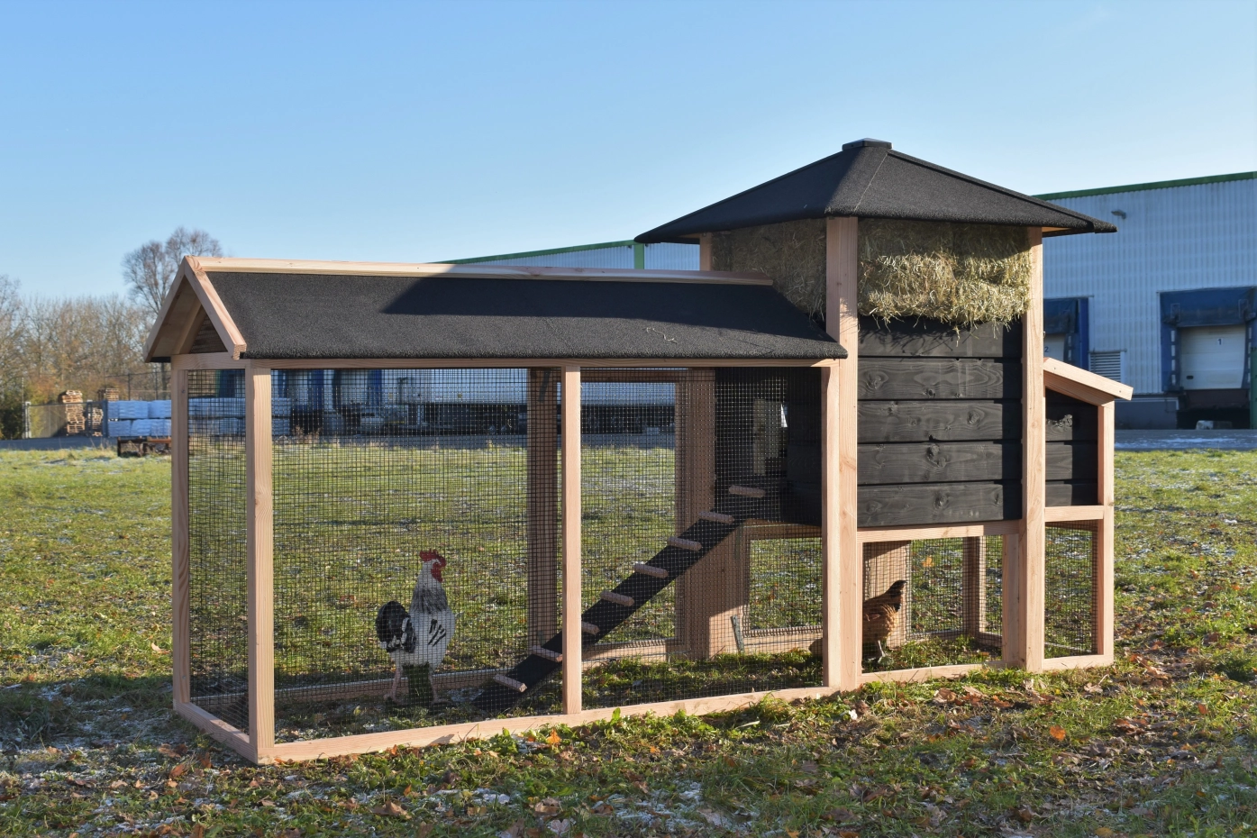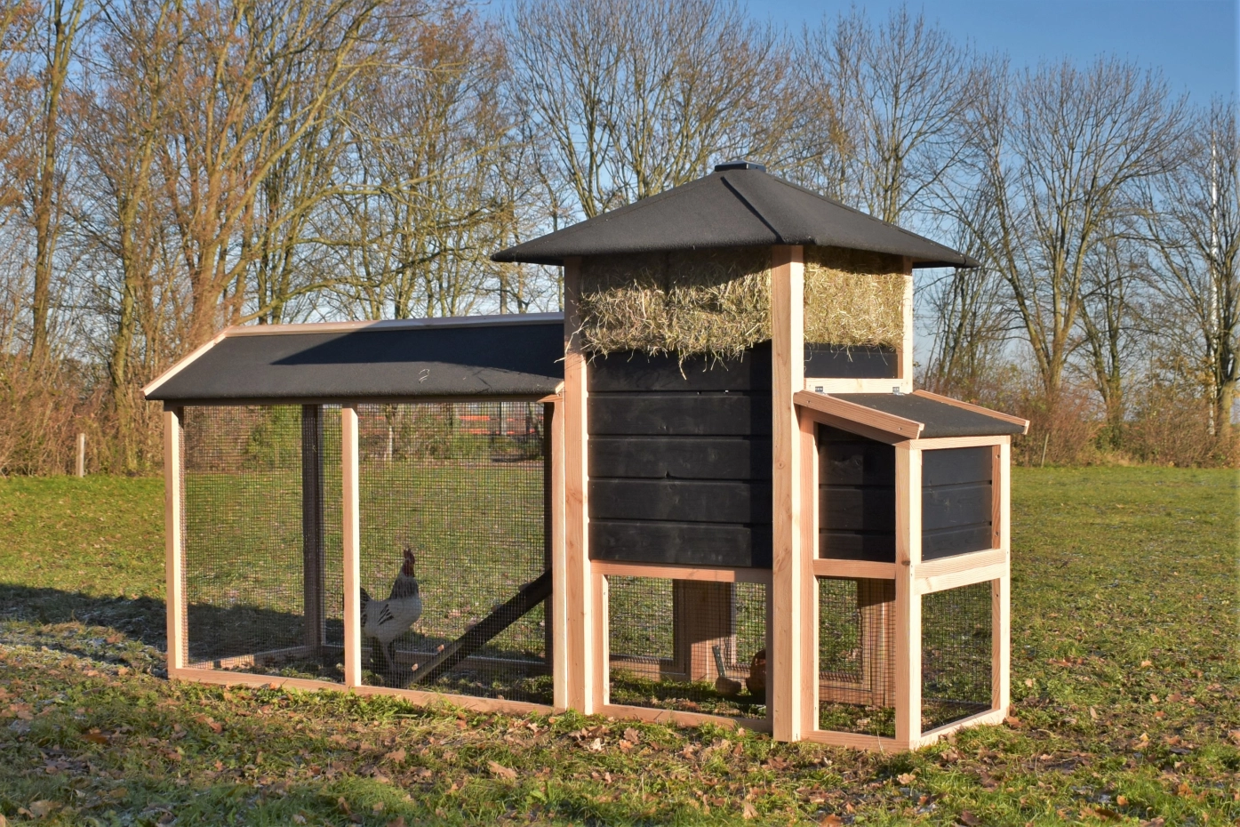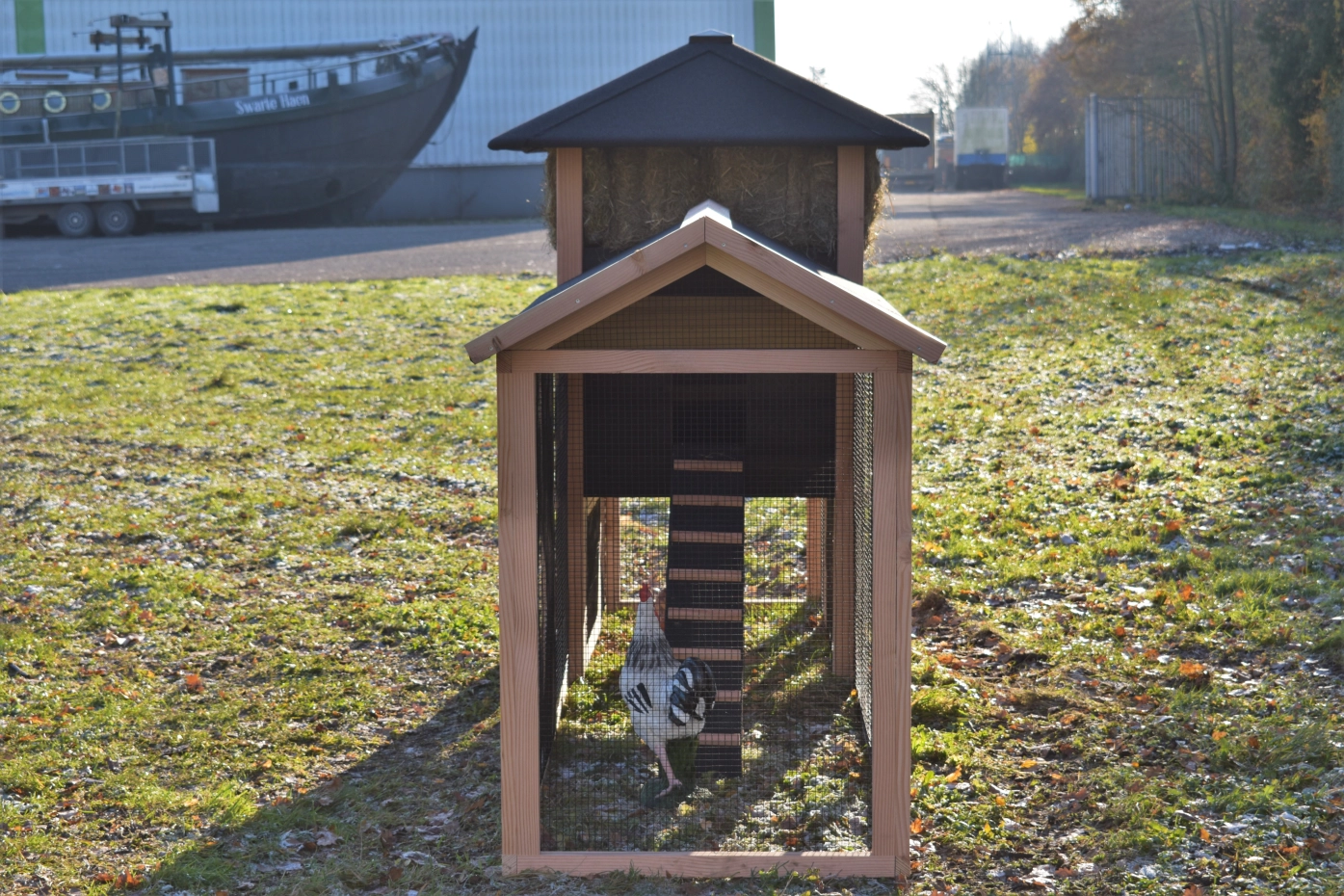 Deze prachtige hooiberg met leuk dakje en luxe ren met dakleer is een echte aanrader! Het hok is gemaakt van Douglas palen en zwarte rabatdelen op geïmpregneerde frames. Dit geeft het hok degelijke uitstraling en een lange levensduur! Mooi design en leuke details. De ren loopt onder het nachthok en legnest door en geeft extra ruimte voor de kippen. Het legnest heeft een scharnierend dak zodat u de eitjes kunt rapen zonder te storen. Brede toegangsdeuren in nachthok en ren! Sterk dakleer van wel 5 mm dik geeft dat het dak een stootje kan verdragen. Al met al een prachtig hok waar u veel plezier van zult hebben!