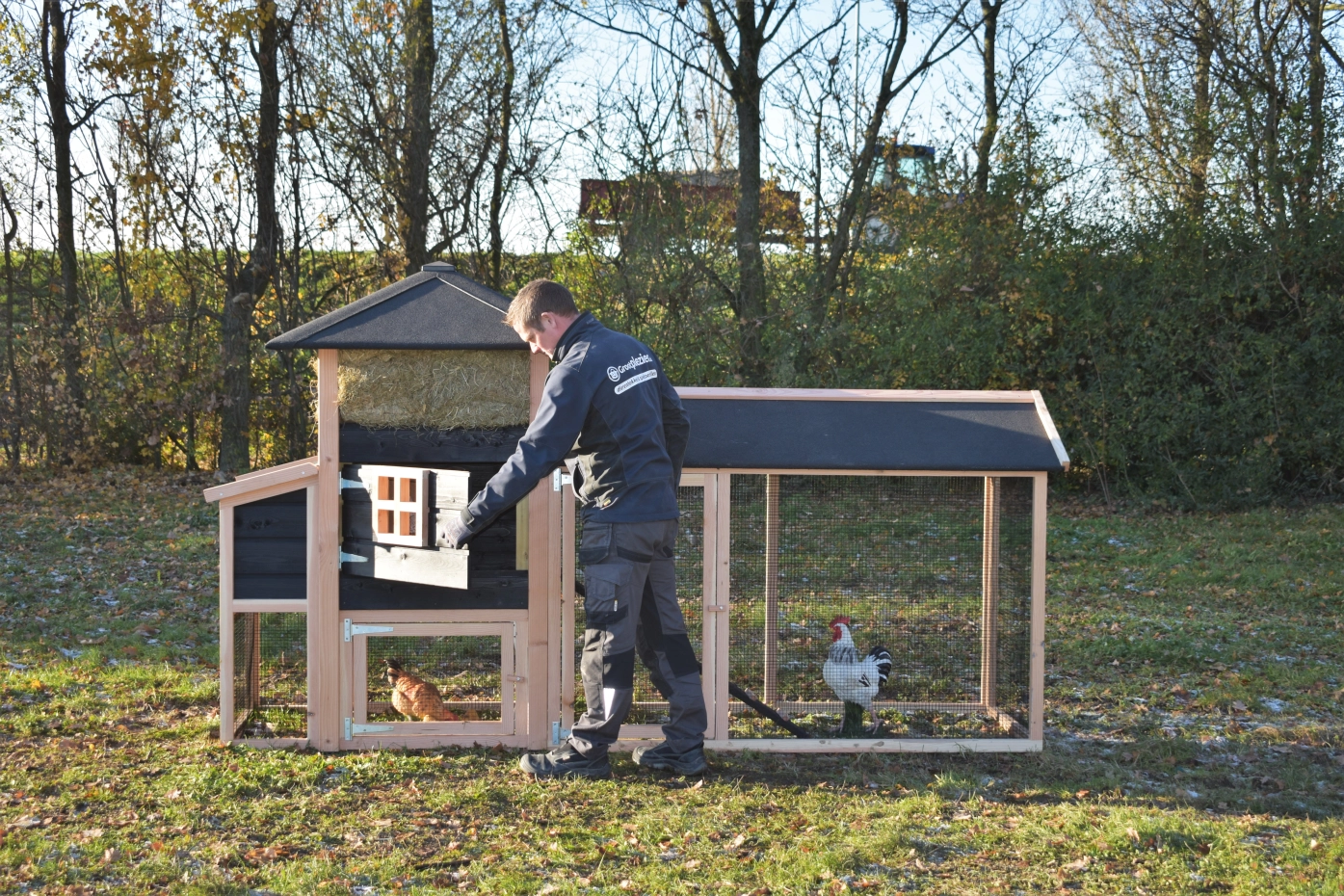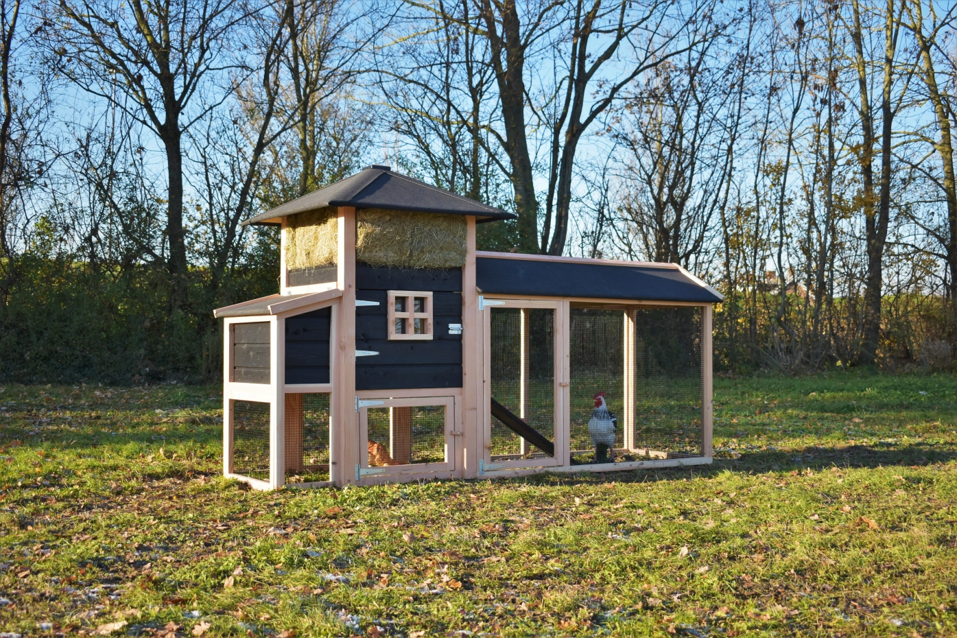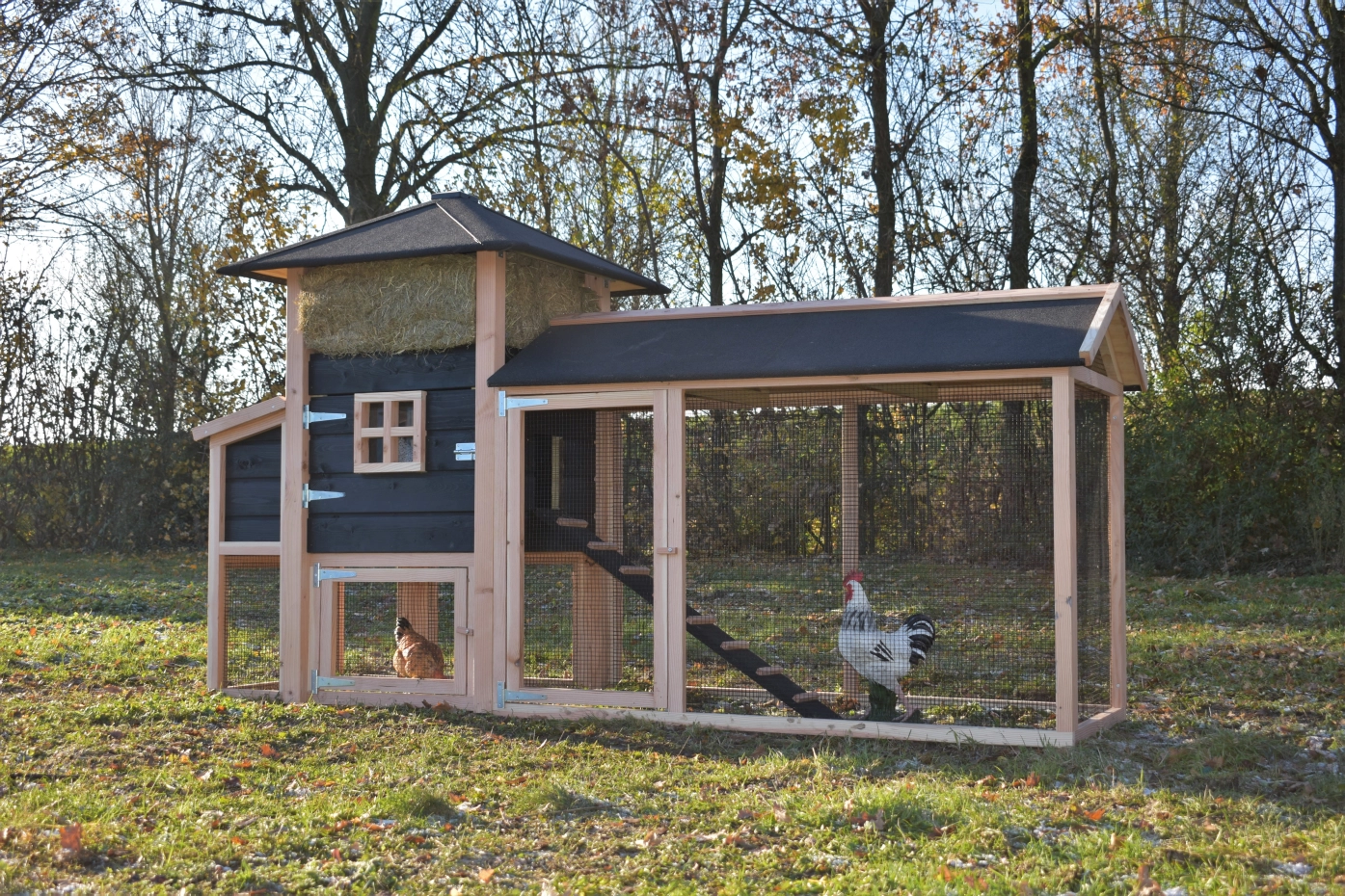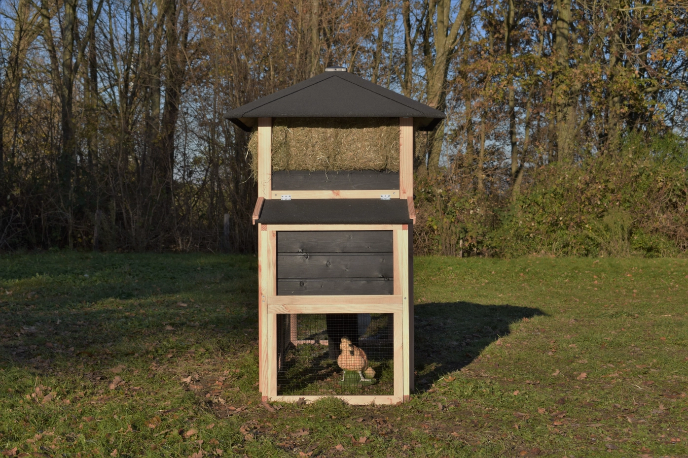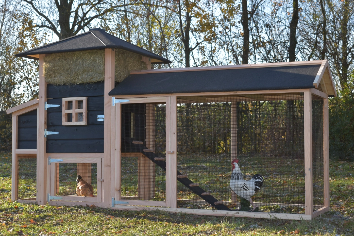 Deze prachtige hooiberg met leuk dakje en luxe ren met dakleer is een echte aanrader! Het hok is gemaakt van Douglas palen en zwarte rabatdelen op geïmpregneerde frames. Dit geeft het hok degelijke uitstraling en een lange levensduur! Mooi design en leuke details. De ren loopt onder het nachthok en legnest door en geeft extra ruimte voor de kippen. Het legnest heeft een scharnierend dak zodat u de eitjes kunt rapen zonder te storen. Brede toegangsdeuren in nachthok en ren! Sterk dakleer van wel 5 mm dik geeft dat het dak een stootje kan verdragen. Al met al een prachtig hok waar u veel plezier van zult hebben!