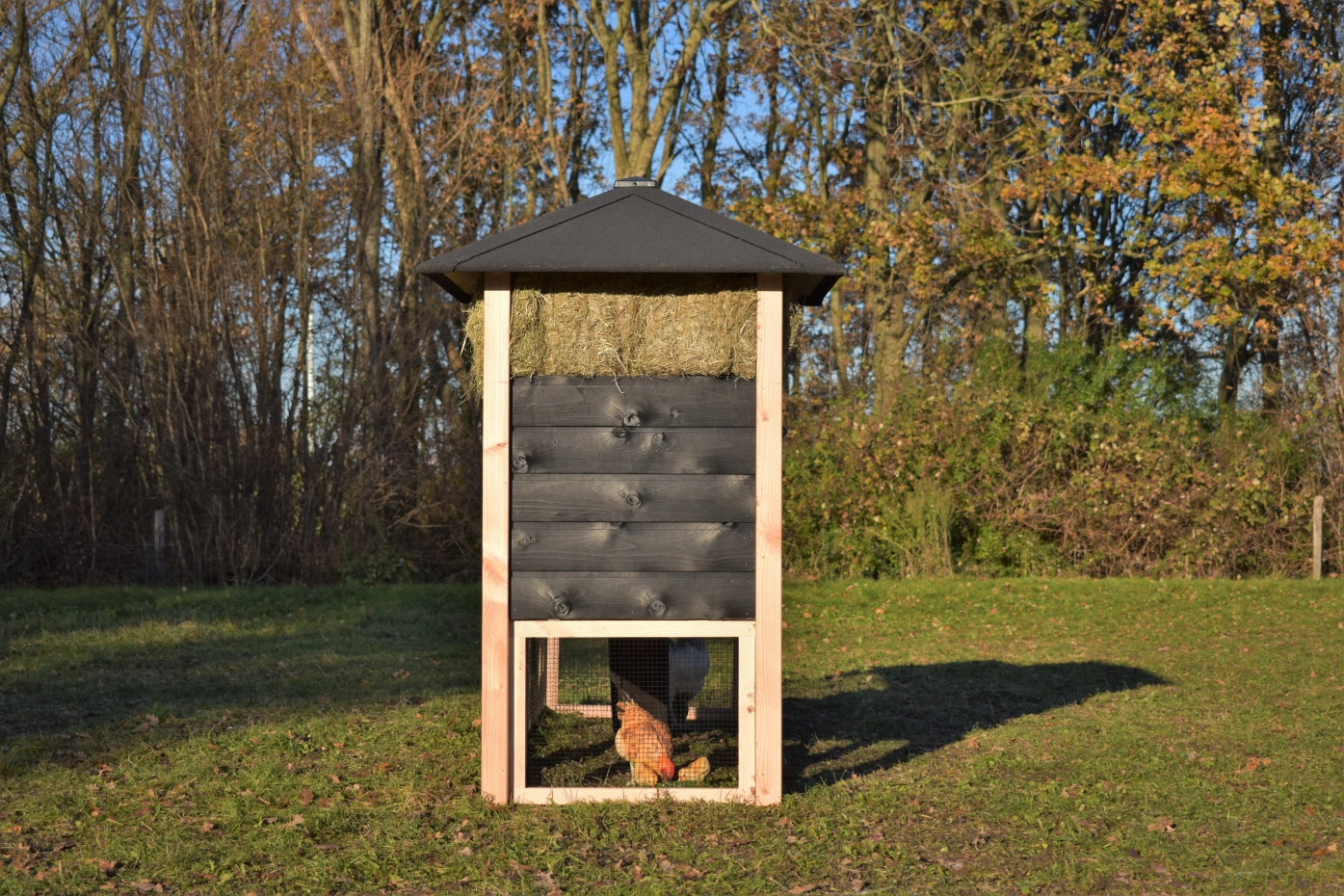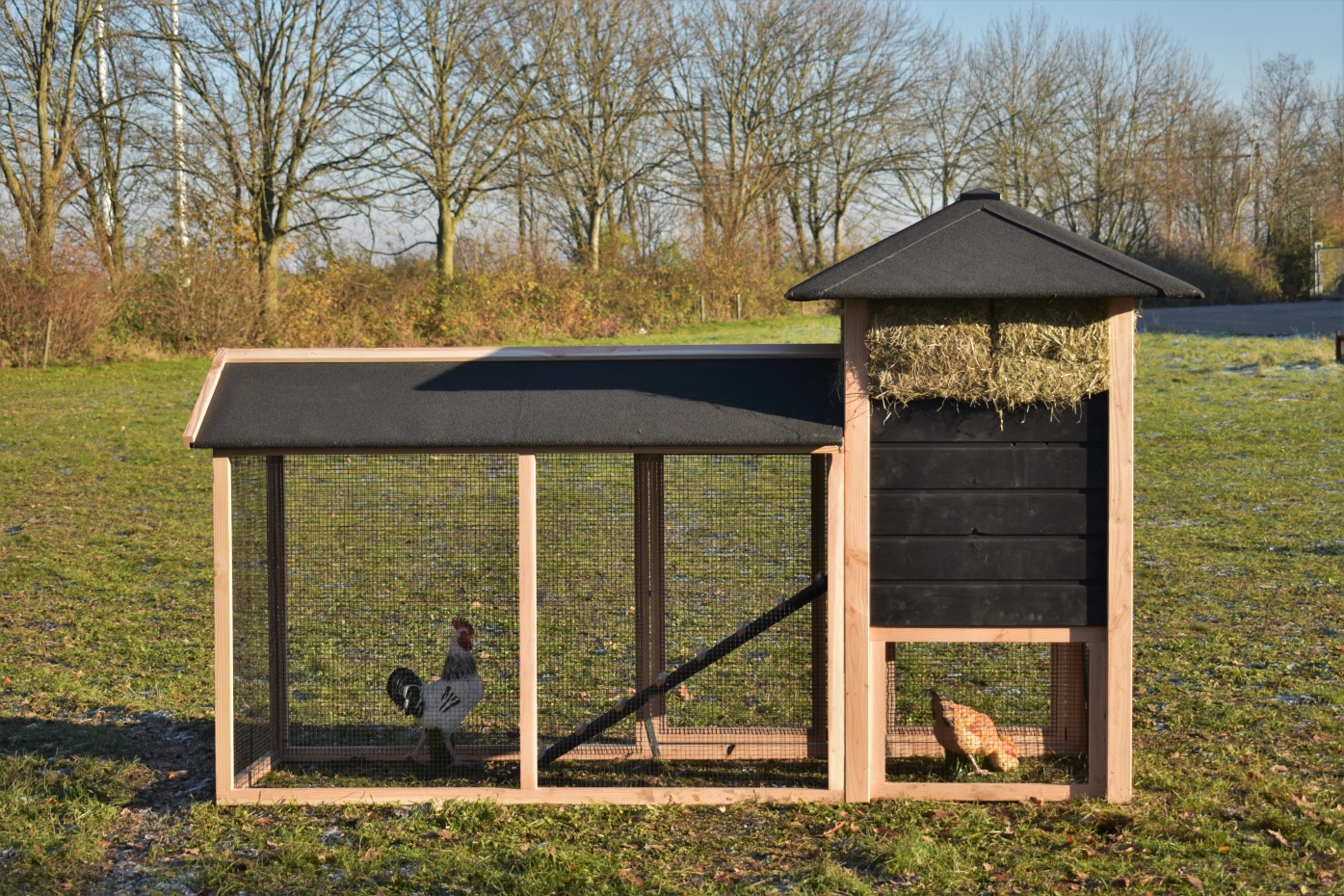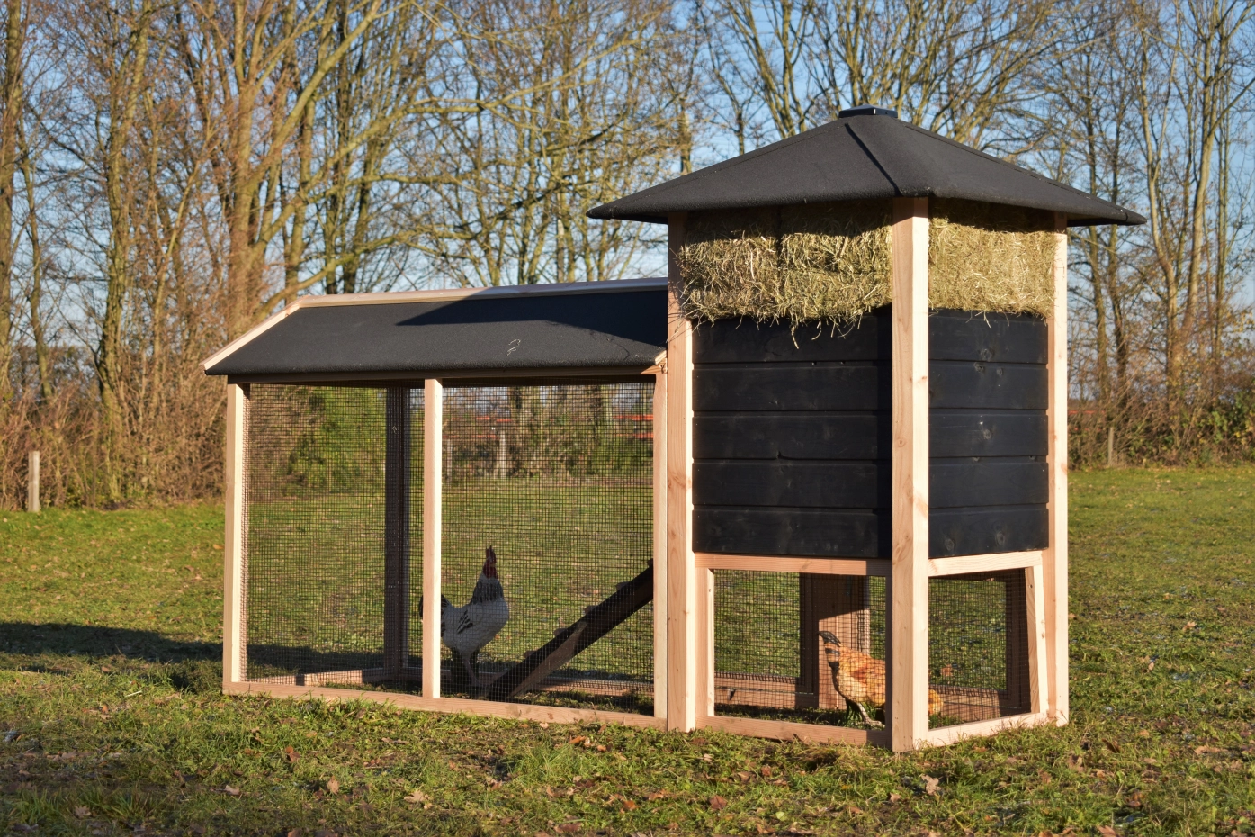 Kippenhok hooiberg Rosanne met overdekte ren. Mooi hok uitgevoerd met Douglas palen en zwart rabat. Prachtige combinatie met luxe details. Ruime ren met brede deur. In de ren zit zwart gaas wat een goed zicht geeft op uw kippen. Het nachthok heeft ook een brede deur hierdoor kunt u gemakkelijk schoon maken. Het dak is bedekt met 5mm dik dakleer en kan een stootje hebben. Degelijk gebouwd met duurzaam hout voor een lange levensduur. Het hok is onderhoudsvrij. Als u de kleur van de Douglas palen wilt behouden raden we aan om het hout te behandelen met olie of beits.