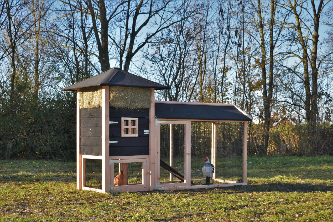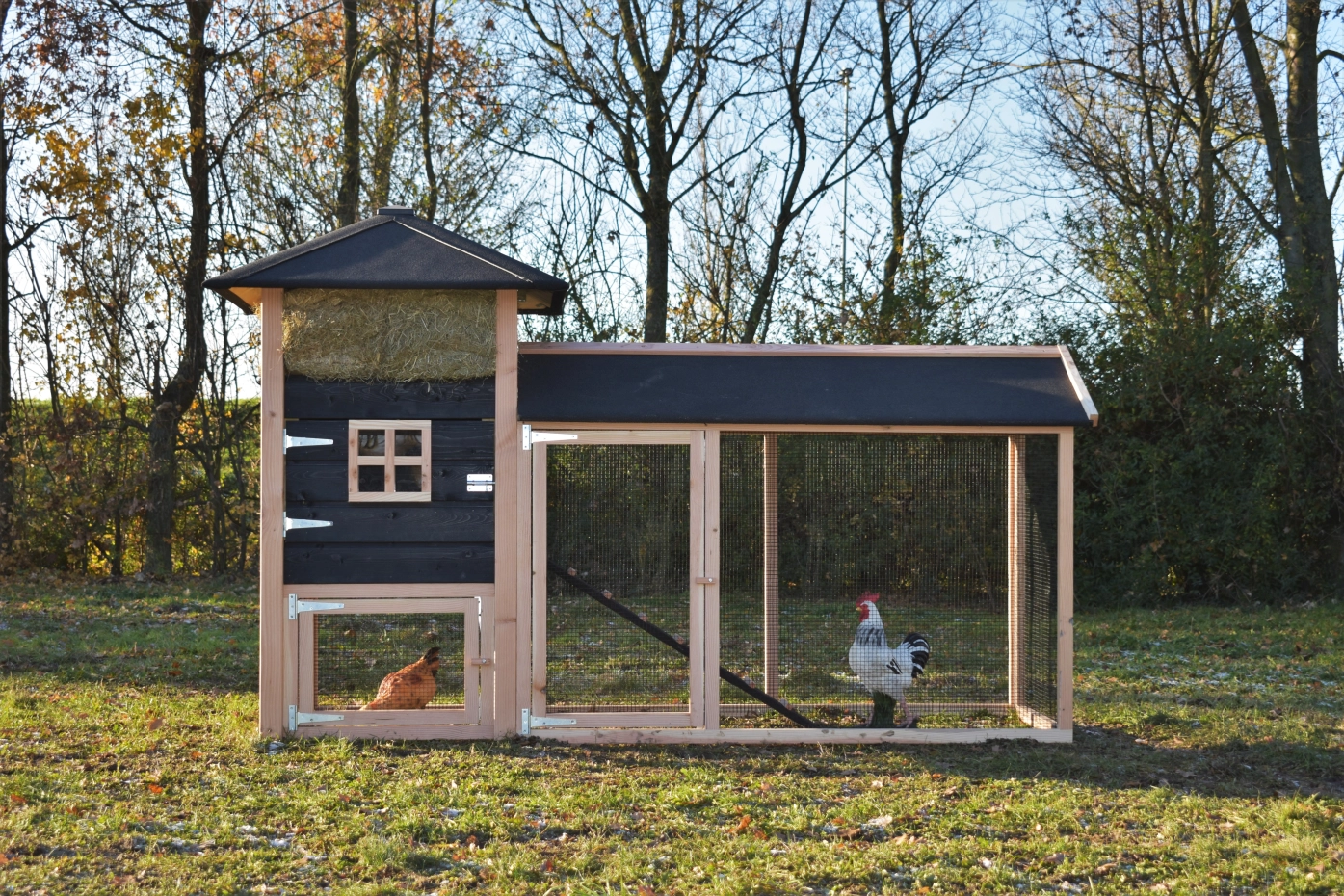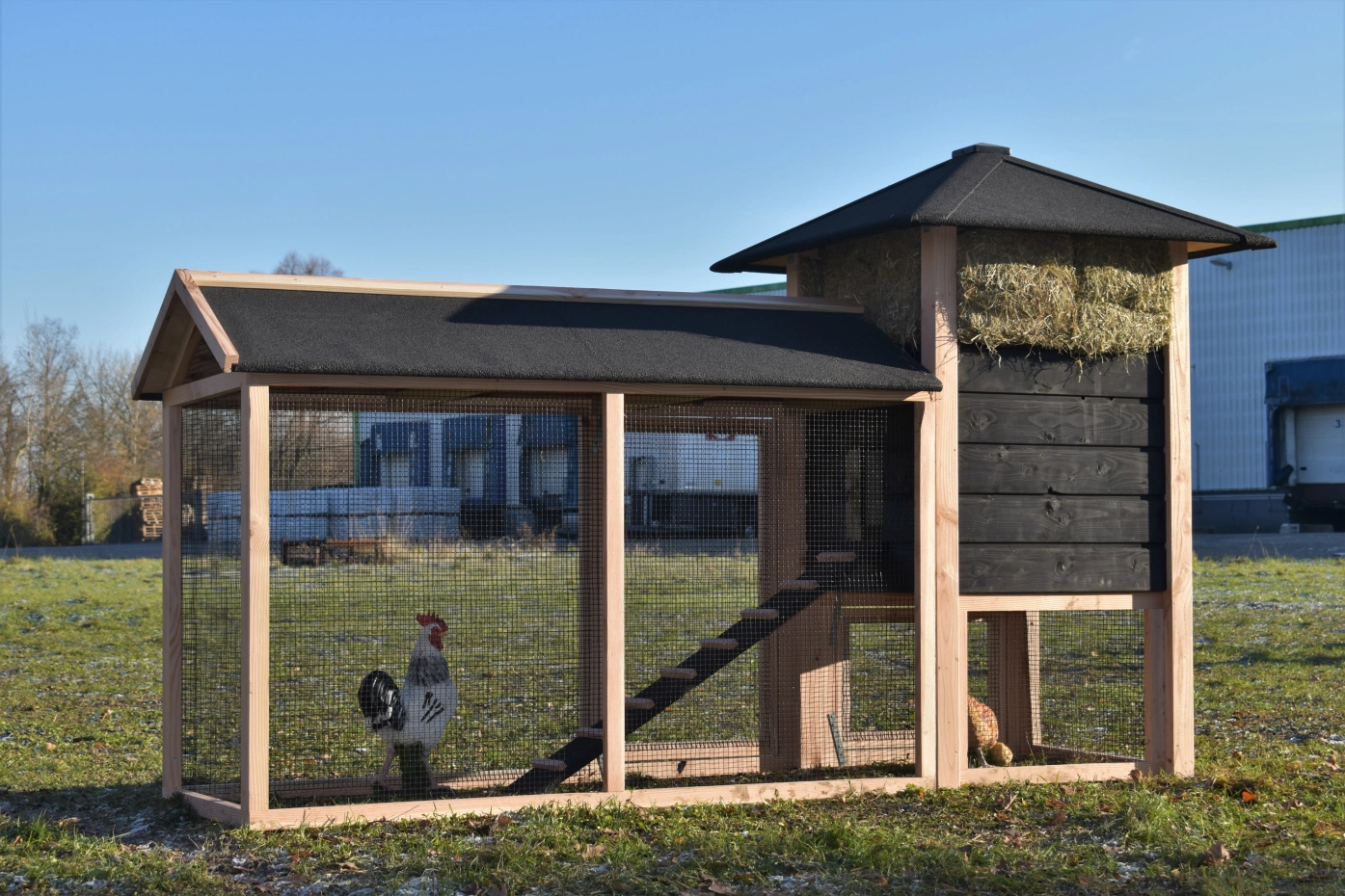 Kippenhok hooiberg Rosanne met overdekte ren. Mooi hok uitgevoerd met Douglas palen en zwart rabat. Prachtige combinatie met luxe details. Ruime ren met brede deur. In de ren zit zwart gaas wat een goed zicht geeft op uw kippen. Het nachthok heeft ook een brede deur hierdoor kunt u gemakkelijk schoon maken. Het dak is bedekt met 5mm dik dakleer en kan een stootje hebben. Degelijk gebouwd met duurzaam hout voor een lange levensduur. Het hok is onderhoudsvrij. Als u de kleur van de Douglas palen wilt behouden raden we aan om het hout te behandelen met olie of beits.