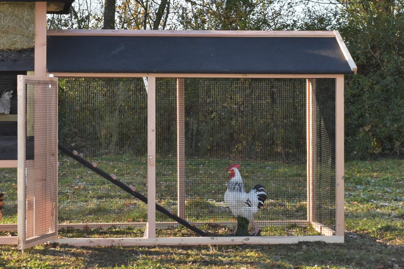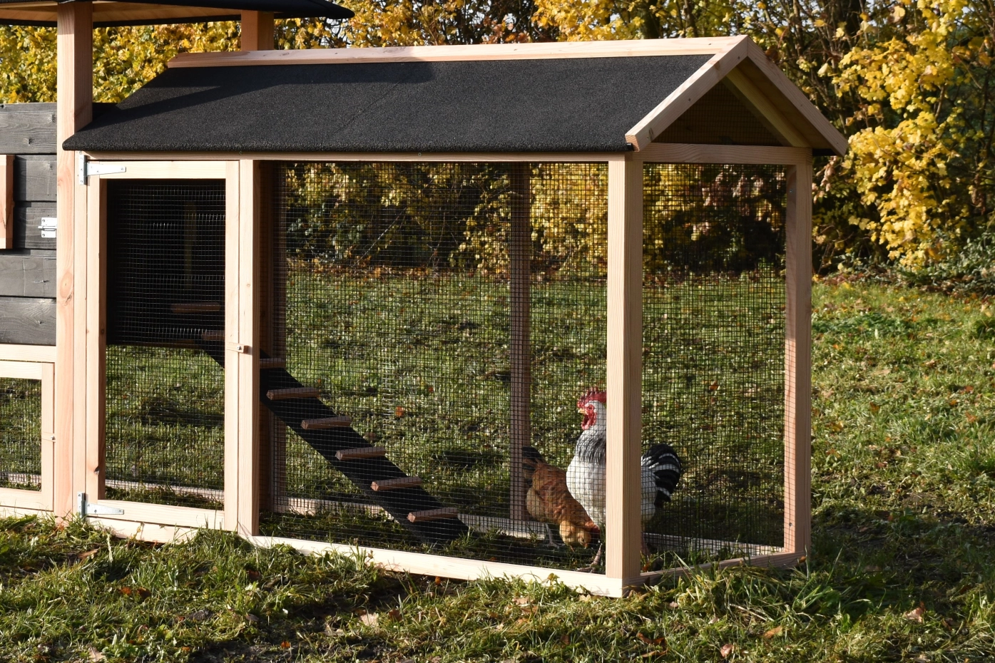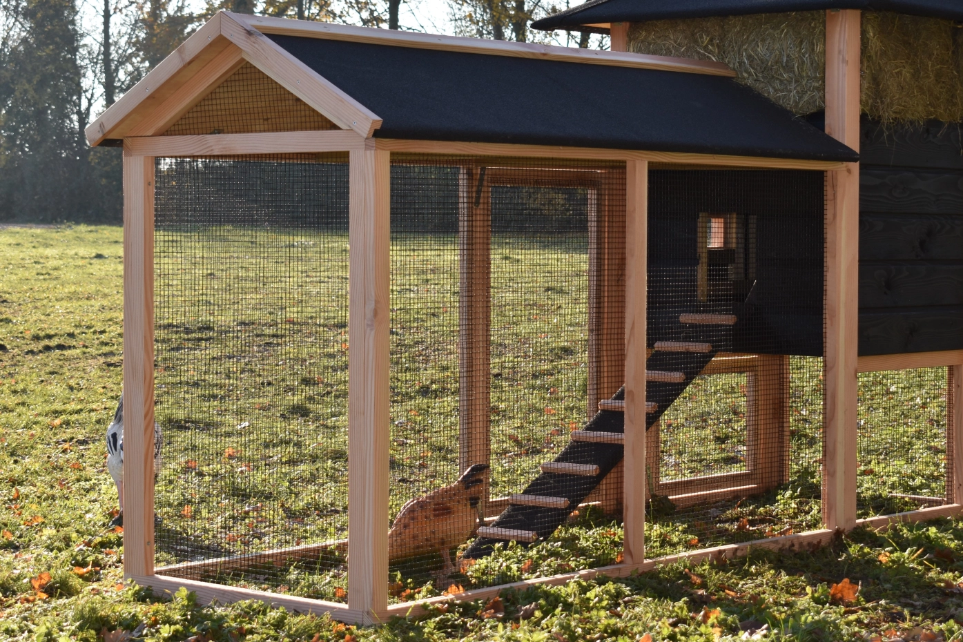 Overdekte ren is een unieke ren. Goede doorkijk door het zwarte gaas. De deur is zo groot mogelijk gehouden zodat u een optimale doorgang hebt. Deze ren is geschikt om tegen de hooiberg Rosa, Rosalynn & Rosanne te zetten. Door middel van vier schroeven kunt u de ren koppelen aan het hok.