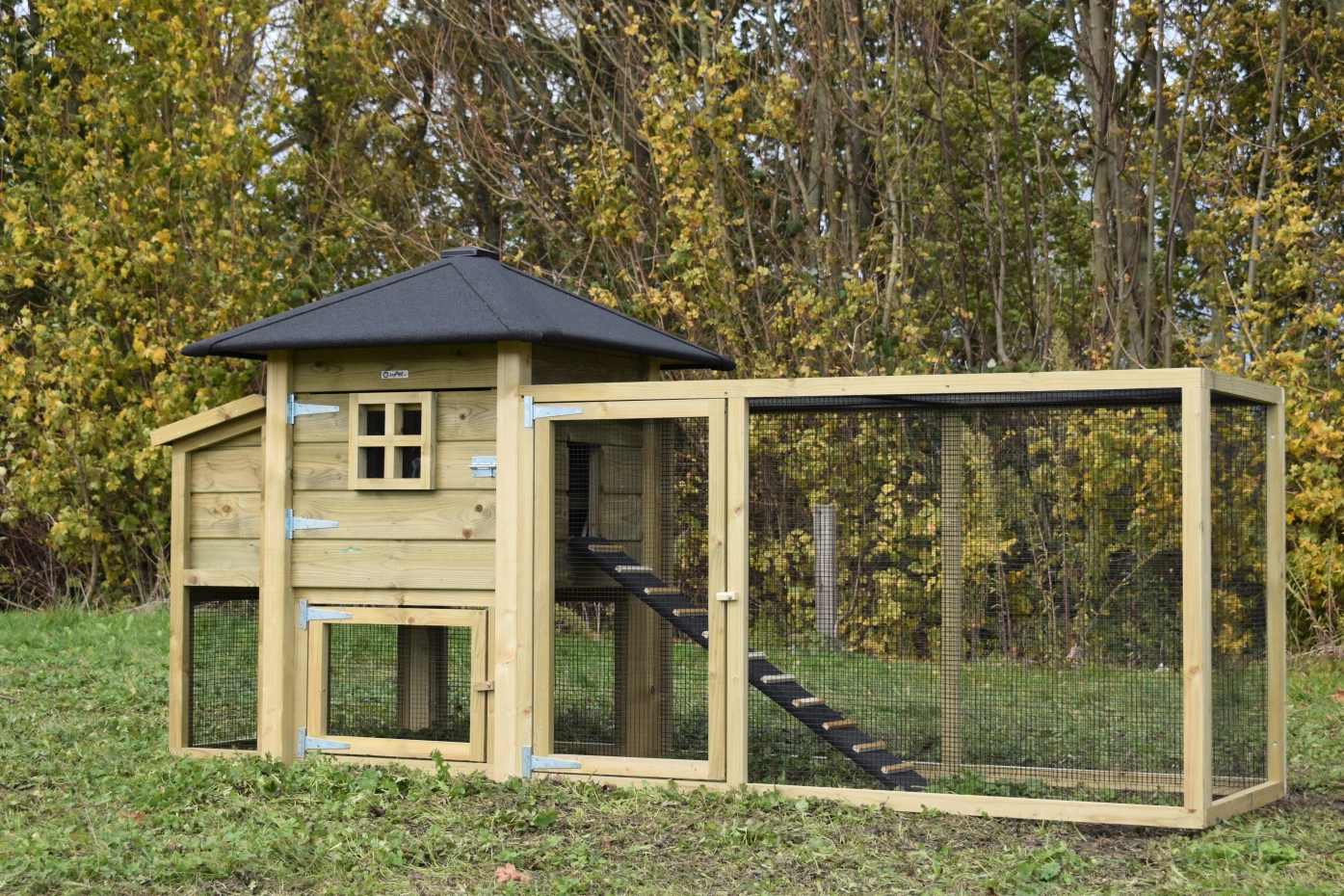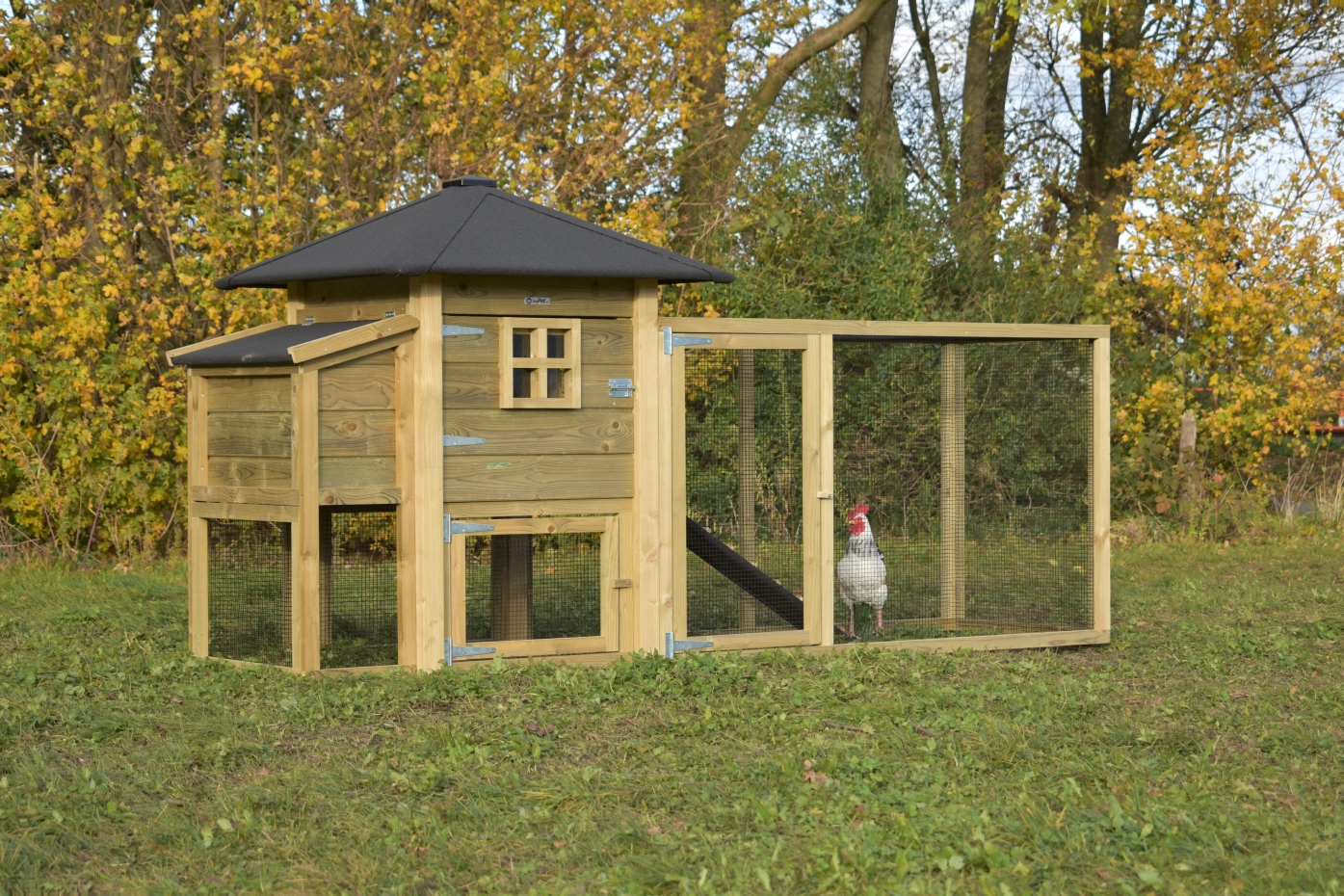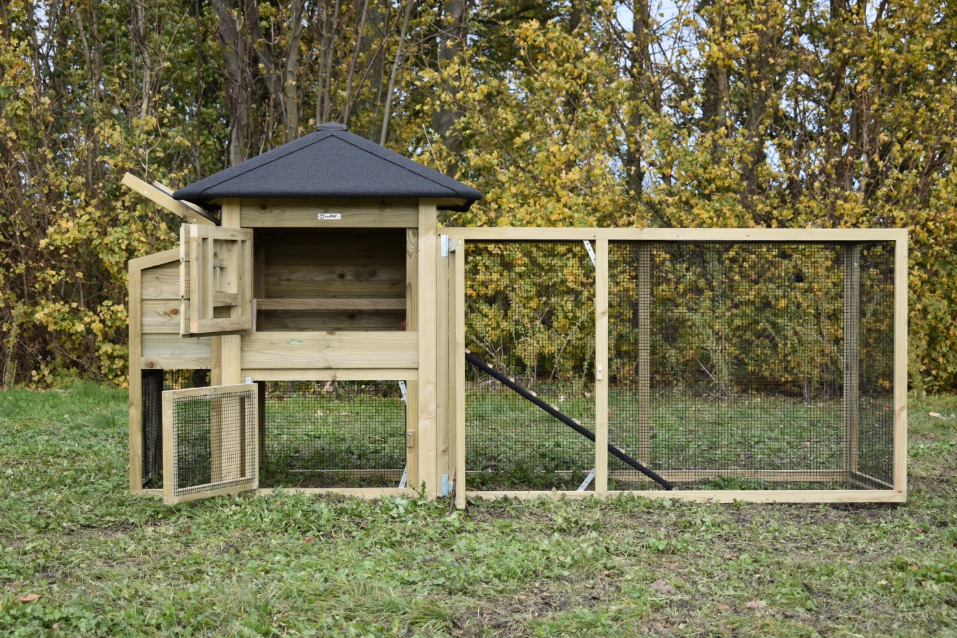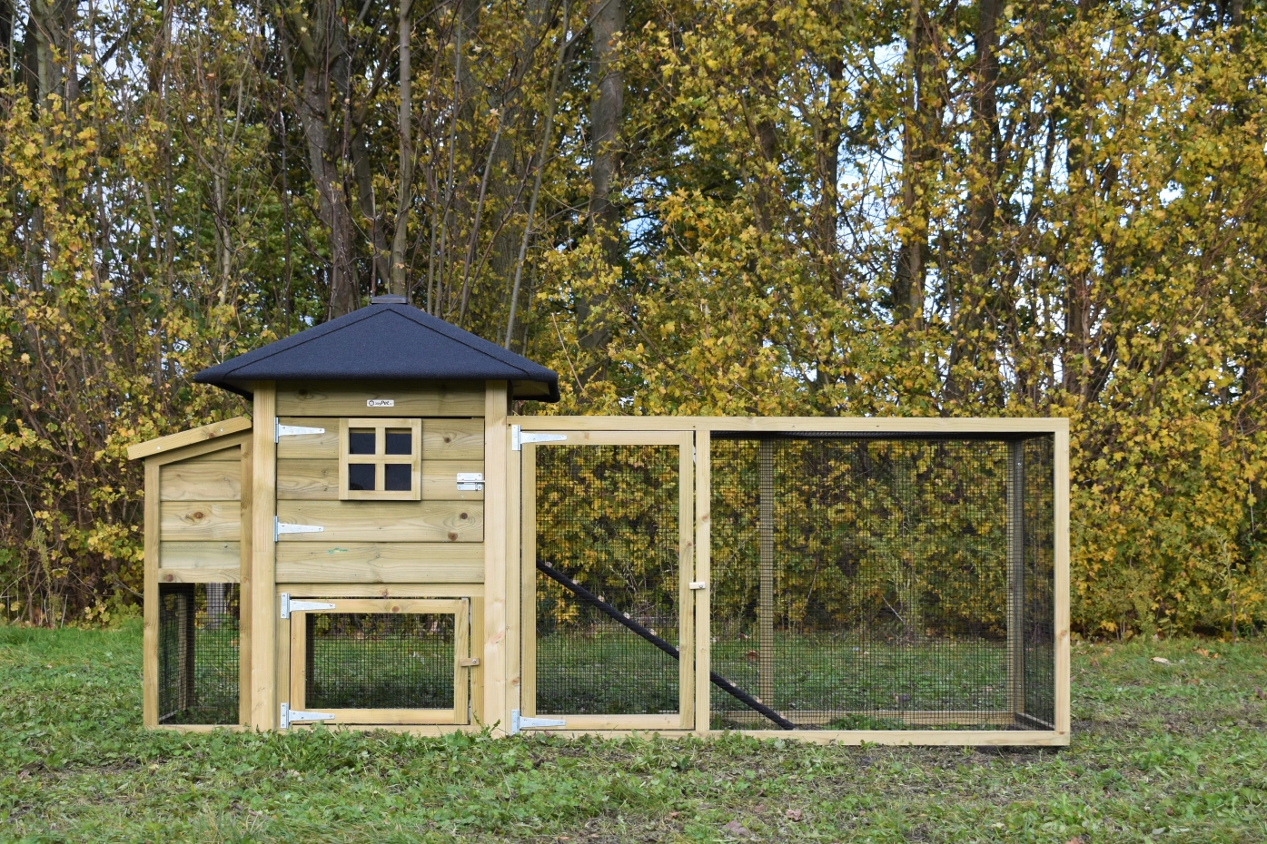 Kippenhok Rosy met legnest en aanbouwren. Prachtig kippenhok met een mooi afgewerkt vierkant puntdak wat 'sfeer' geeft in uw tuin. Dit hok is een praktische leuke combinatie met ruime deuren. Het hout is geïmpregneerd vuren wat een lange levensduur heeft en weinig onderhoud behoeft. Omdat de ren onder het nachthok en legnest doorloopt hebben de kippen optimaal ruimte in de ren. Door middel van het scharnierend dak heeft u gemakkelijk toegang tot het legnest, hierdoor stoort u de kippen zo min mogelijk. Dit hok is ook heel geschikt als konijnenhok. Al met al een goedkoop hok met alle goede voordelen! Een must have!