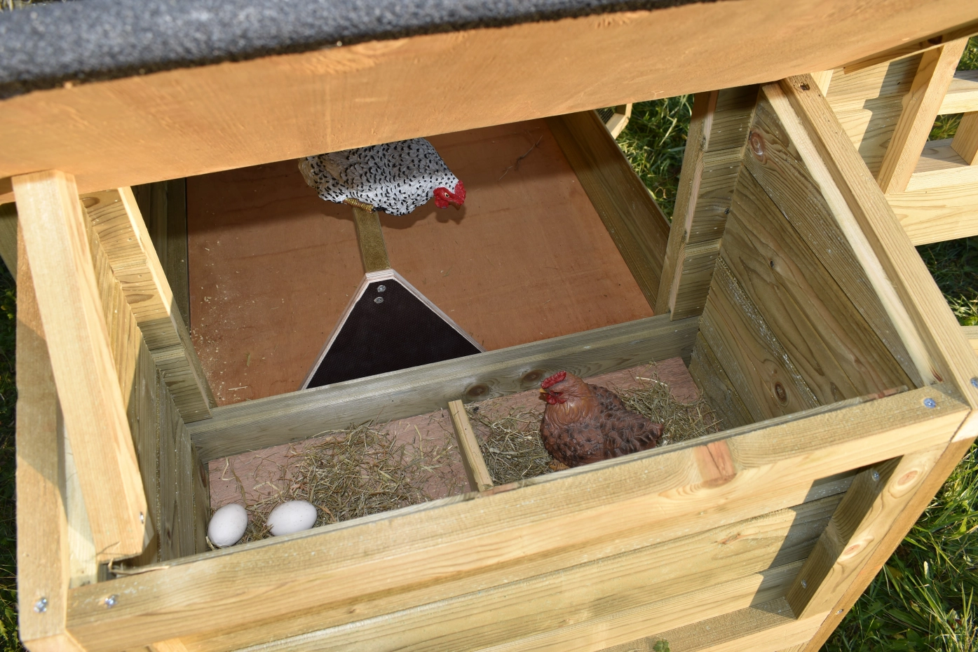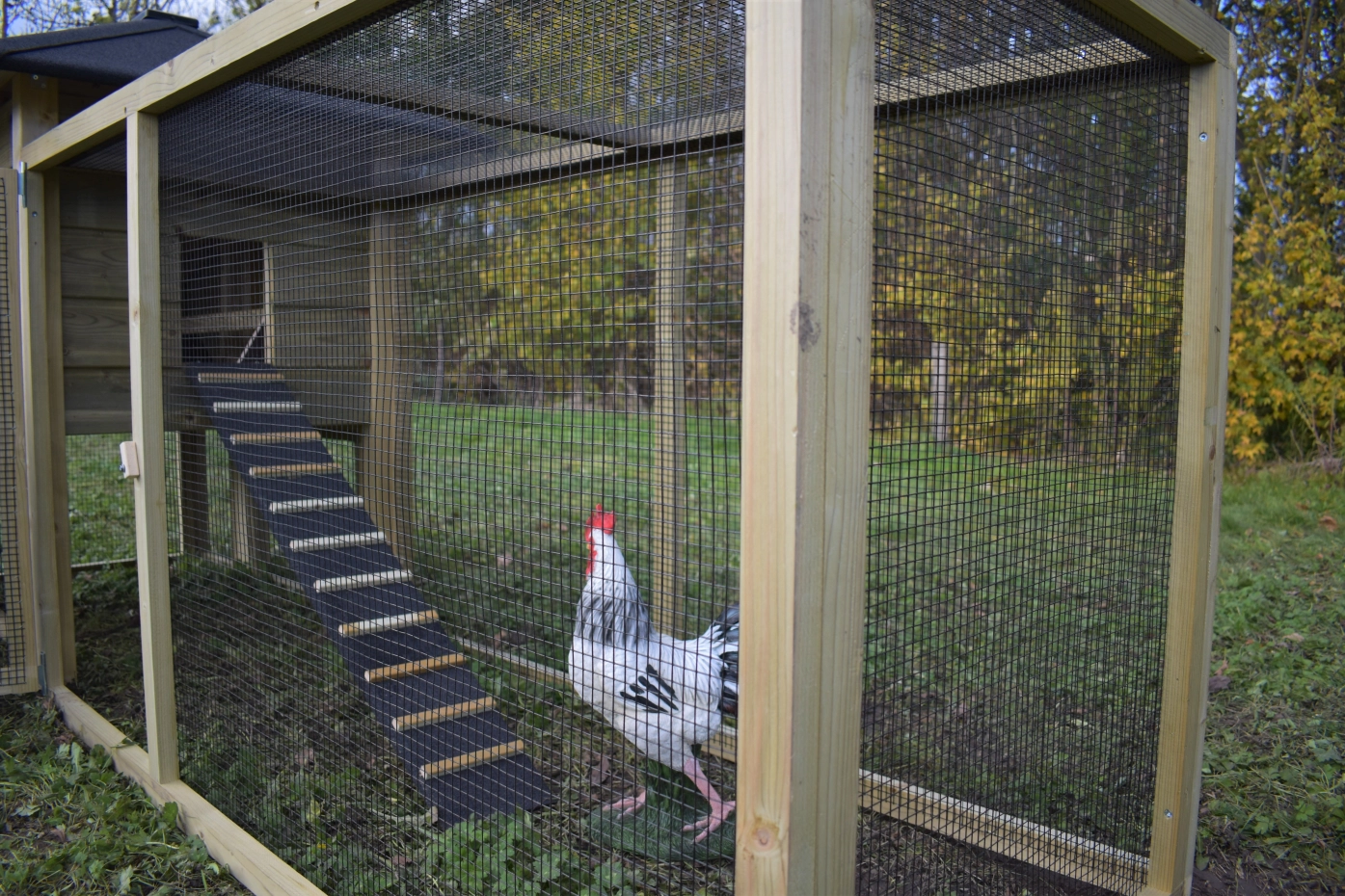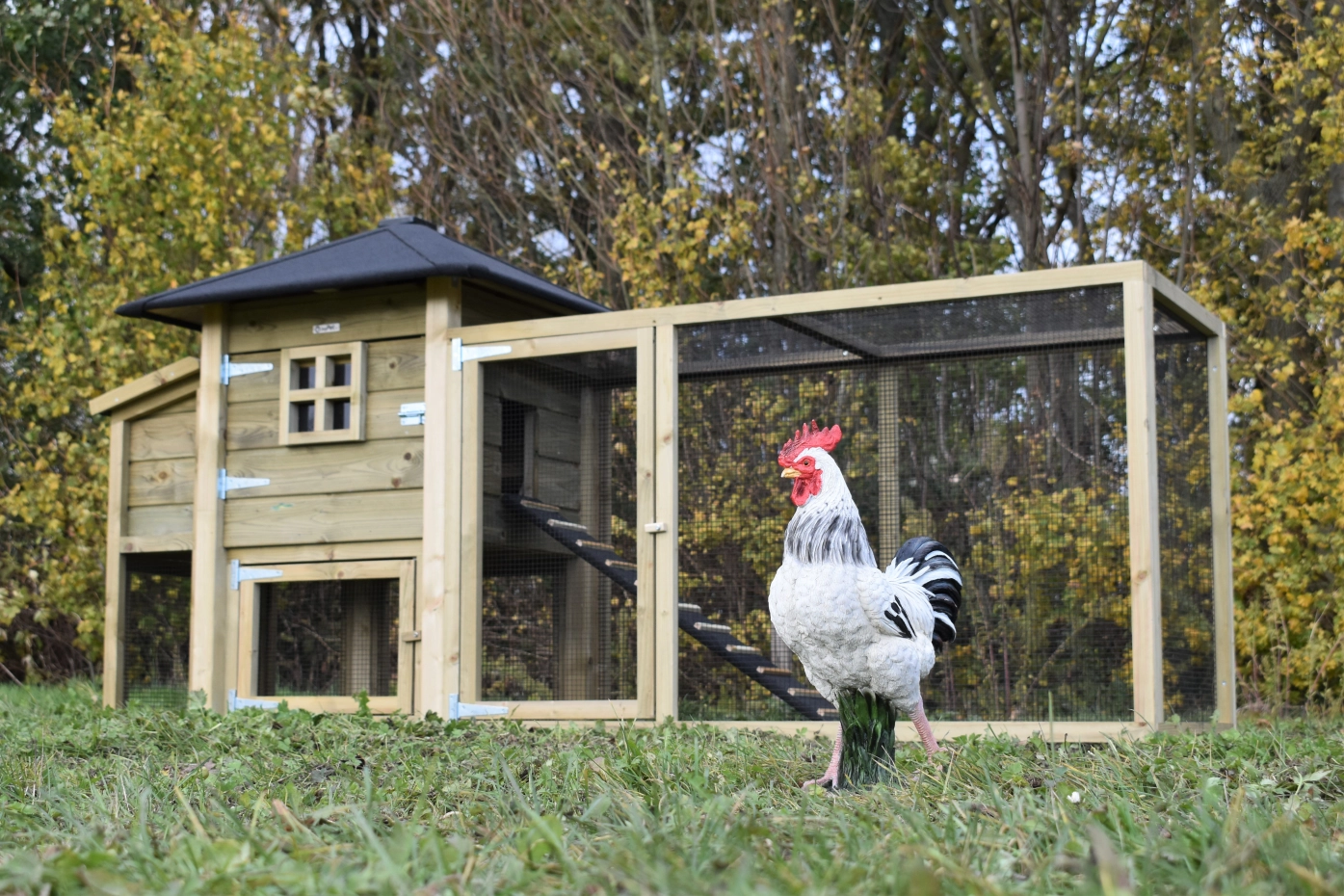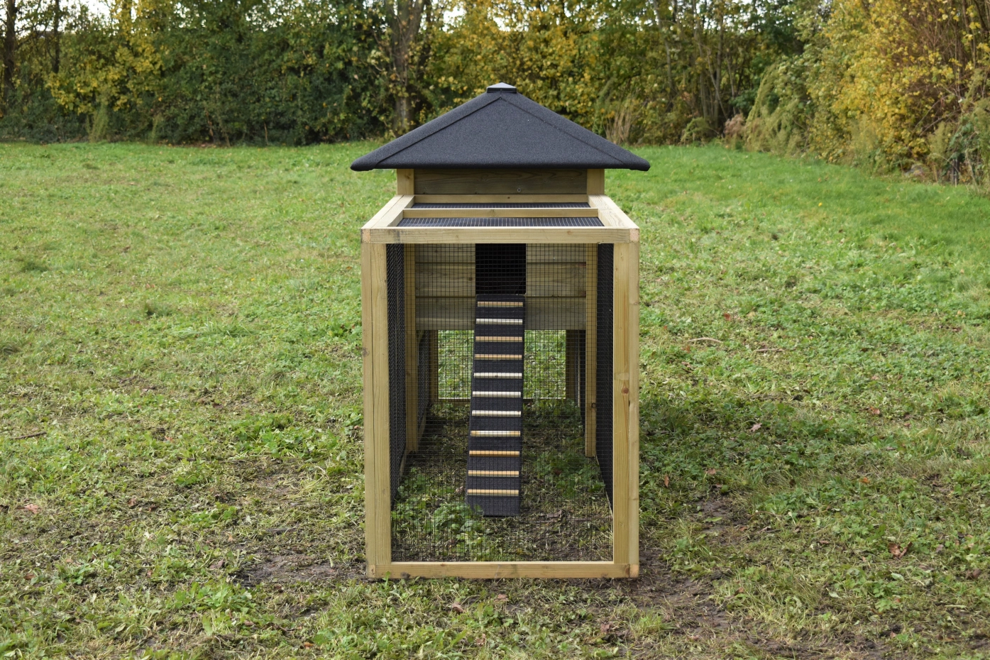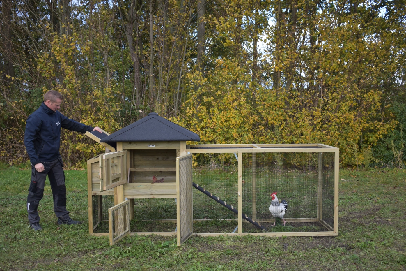 Kippenhok Rosy met legnest en aanbouwren. Prachtig kippenhok met een mooi afgewerkt vierkant puntdak wat 'sfeer' geeft in uw tuin. Dit hok is een praktische leuke combinatie met ruime deuren. Het hout is geïmpregneerd vuren wat een lange levensduur heeft en weinig onderhoud behoeft. Omdat de ren onder het nachthok en legnest doorloopt hebben de kippen optimaal ruimte in de ren. Door middel van het scharnierend dak heeft u gemakkelijk toegang tot het legnest, hierdoor stoort u de kippen zo min mogelijk. Dit hok is ook heel geschikt als konijnenhok. Al met al een goedkoop hok met alle goede voordelen! Een must have!