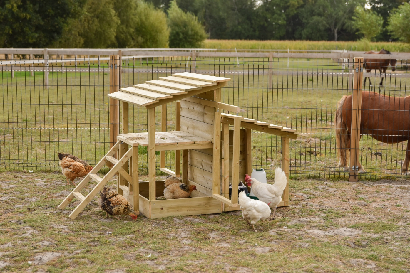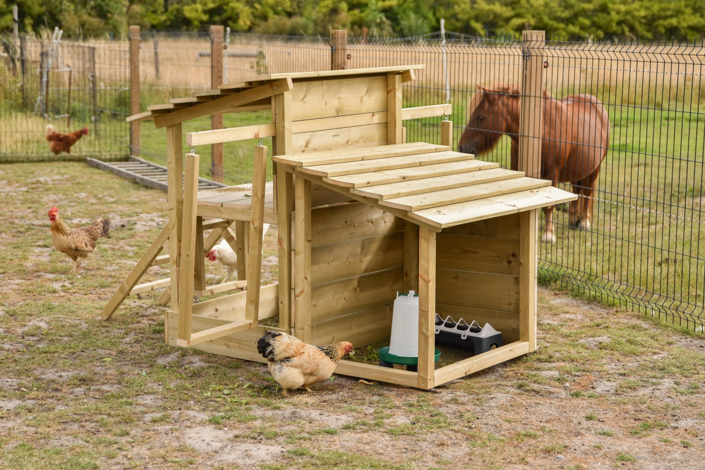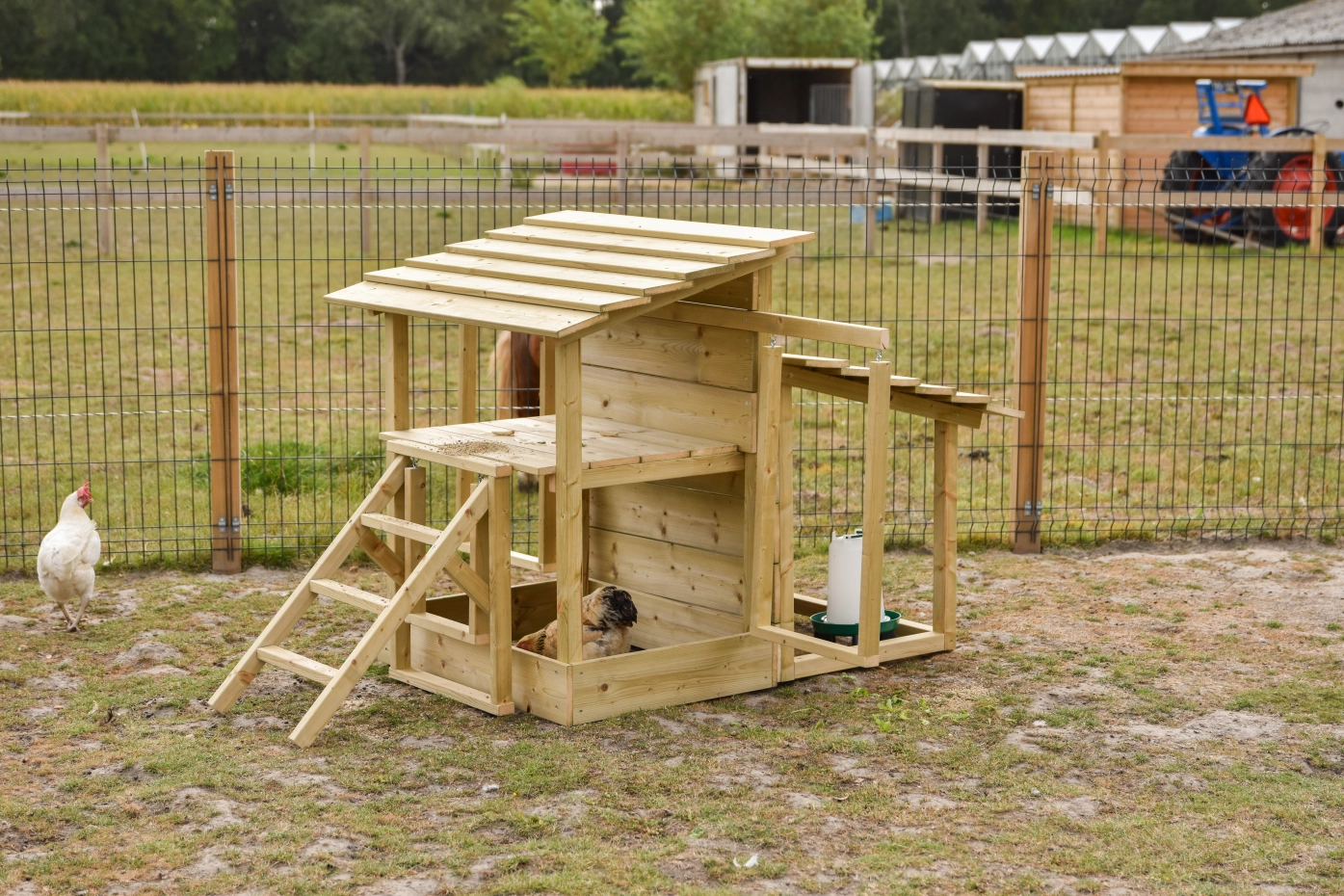 Het kippen speelcentrum biedt volop variatie voor uw kippen. Met een zitstoktrap en meerdere schommels, een plateau en een zandbak hebben de kippen altijd wat te doen. Daarnaast is er een aparte schuilplaats waar u een voerbak en drinksilo droog kunt neerzetten, zodat het voer beschermd blijft bij regen. Een compleet speelcentrum dat zorgt voor plezier, beweging en beschutting. Let op! het is een speel centrum voor de kippen dus je kunt ze er niet in opsluiten! zorg dat het product bijvoorbeeld in een ren staan.
