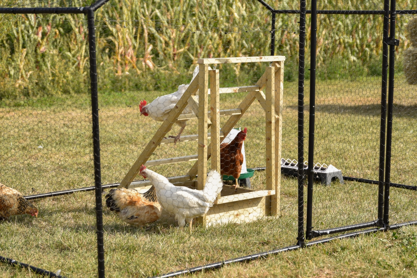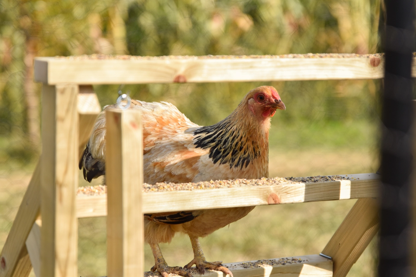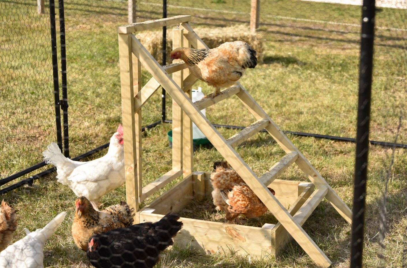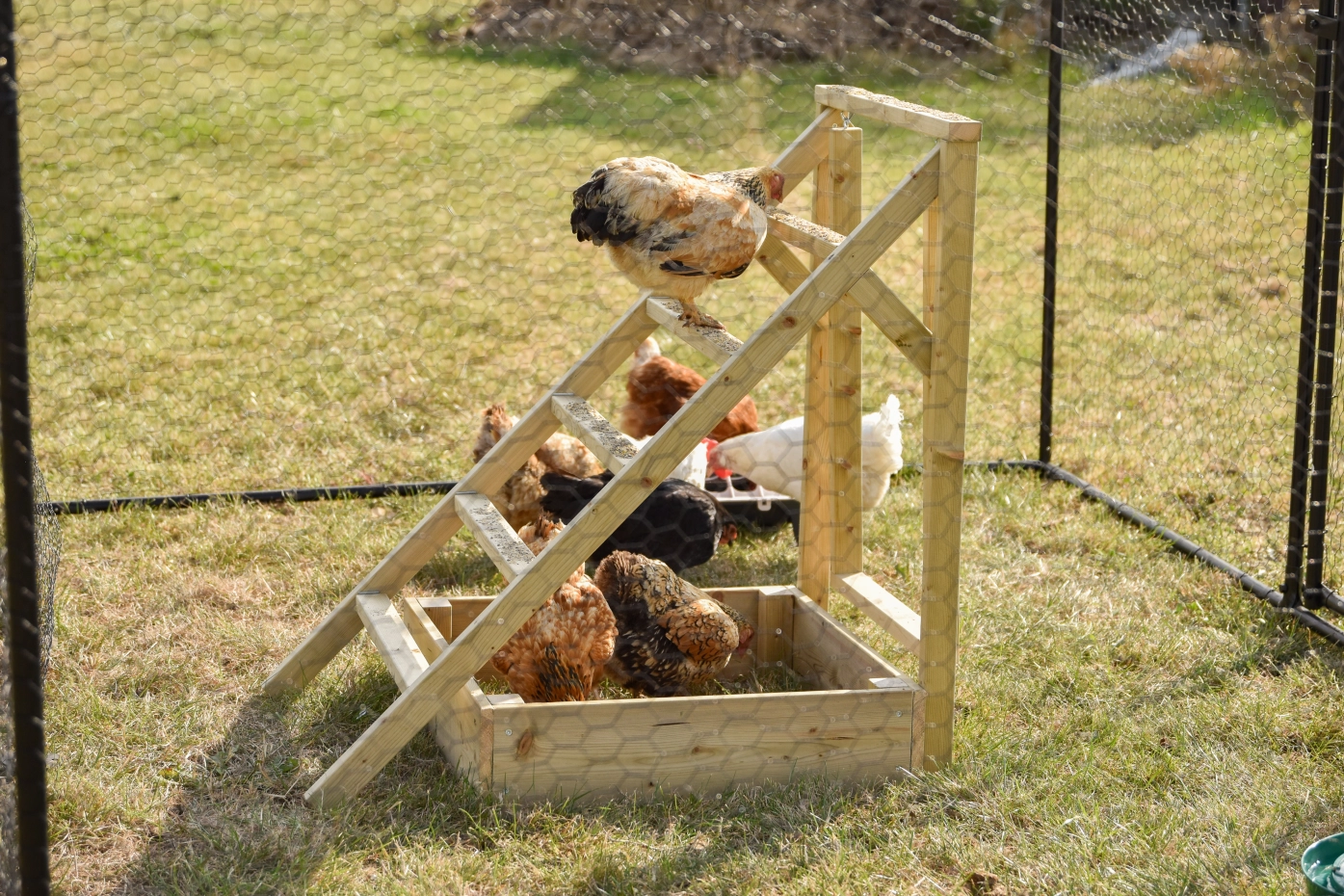De kippen trap is een ideaal kippen speeltoestel voor in de kippenren. Dankzij de platte treden kunnen kippen de trap niet alleen gebruiken om te klimmen, maar ook als stabiele zitstok. Aan de trap hangt een schommel voor extra speelplezier. De kippen zandbak die u op de foto's ziet is appart mee te bestellen, zodat de kippen heerlijk kunnen badderen en scharrelen. Deze kippen trap zorgt voor beweging, plezier en ontspanning in de ren.